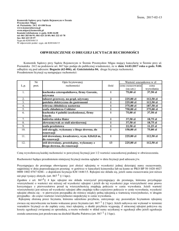 Śrem, 2017-02-13 Komornik Sądowy przy Sądzie Rejonowym w Śremie Przemysław Migas ul. Poznańska 24/2 63-100 Śrem www.komorniksrem.pl [email protected] Kontakt telefoniczny w godz. 8:00-16:00 tel: 061 283 06 91; 061 623 24 05; 061 222 43 78 fax: 061 623 25 57 Sygn.akt KM1646/15 W odpowiedzi podać: sygn. akt KM1646/15 OBWIESZCZENIE O DRUGIEJ LICYTACJI RUCHOMOŚCI Komornik Sądowy przy Sądzie Rejonowym w Śremie Przemysław Migas mający kancelarię w Śremie przy ul. Poznańska 24/2 na podstawie art. 867 kpc podaje do publicznej wiadomości, że w dniu 14.03.2017 roku o godz. 9.00. odbędzie się pod adresem: Bogucin (62-006), ul. Gnieźnieńska 84, druga licytacja ruchomości. Przedmiotem licytacji są następujące ruchomości: L.p. 1. 2. 3. 4. 5. 6. 7. 8. 9. 10. 11. 12. Nr prot. Opis licytowanej ruchomości kuchenka czteropalnikowa, firmy Gorenie, używana taboret grzewczy, na prąd, używany patelnia elektryczna do gastronomi witryna chłodnicza nastawna szafa chłodnicza Coldator kuchenka 4 palniki (uszkodzona), firmy Lloyds lodówka niska Haier zlewozmywak ze stali nierdzewnej szafa przelotowa stół okrągły, wykonany z litego drewna, do renowacji stół drewniany, kwadratowy, wym. 0,8x0,8 m, do renowacji stół drewniany, prostokątny, wykonany z litego drewna, do renowacji ilość 1 Wartość szacunkowa w zł cena oszacowania cena (za szt.) wywołania 75,00 zł 37,50 zł 2 1 1 1 1 225,00 zł 225,00 zł 375,00 zł 750,00 zł 75,00 zł 112,50 zł 112,50 zł 187,50 zł 375,00 zł 37,50 zł 1 1 1 1 37,50 zł 37,50 zł 22,50 zł 150,00 zł 18,75 zł 18,75 zł 11,25 zł 75,00 zł 1 225,00 zł 112,50 zł 13 225,00 zł 112,50 zł Ceną wywoławczą każdej ruchomości w powyższej licytacji jest 1/2 wartości szacunkowej podanej w obwieszczeniu. Ruchomości będące przedmiotem niniejszej licytacji można oglądać w dniu licytacji pod adresem j/w. Przystępujący do przetargu obowiązany jest złożyć rękojmię w wysokości jednej dziesiątej sumy oszacowania, najpóźniej w dniu poprzedzającym przetarg w gotówce w kancelarii komornika lub na konto nr PKO BP 50 1020 4027 0000 1802 0767 0286 - z dopiskiem licytacja KM 1646/15. Rękojmi nie składa się, jeżeli suma oszacowania jest niższa niż pięć tysięcy złotych. (art. 867 1 § 1 kpc). Zgodnie z art. 8671§ 4 kpc rękojmi nie składa wierzyciel przystępujący do przetargu, któremu przysługuje wierzytelność o wartości nie niższej od wysokości rękojmi i jeżeli do tej wysokości jego wierzytelność oraz prawa korzystające z pierwszeństwa przed tą wierzytelnością znajdują pokrycie w cenie wywołania. Jeżeli wartość wierzytelności jest niższa od wysokości rękojmi albo znajduje tylko częściowe pokrycie w cenie wywołania, wysokość rękojmi obniża się - w pierwszym przypadku do różnicy między pełną rękojmią a wartością wierzytelności, w drugim przypadku - do części wartości wierzytelności niepokrytej w cenie wywołania. Rękojmię złożoną przez licytanta, któremu udzielono przybicia, zatrzymuje się; pozostałym licytantom rękojmię zwraca się niezwłocznie na konto wskazane przez licytanta (art. 867 1 § 2 kpc). Jeżeli nabywca nie wykonał w terminie warunków licytacji co do zapłaty ceny, traci rękojmię, a skutki przybicia wygasają. Z utraconej rękojmi pokrywa się koszty egzekucji związanej ze sprzedażą, a reszta wchodzi w skład sumy uzyskanej w egzekucji albo jeżeli egzekucja została umorzona jest przelewana na dochód Skarbu Państwa (art. 867 1 § 3 kpc). Licytacja odbywa się publicznie (art. 867 2 § 1 kpc). W przetargu nie mogą uczestniczyć: dłużnik, komornik, ich małżonkowie, dzieci, rodzice i rodzeństwo, osoby obecne na licytacji w charakterze urzędowym oraz licytant, który nie wykonał warunków poprzedniej licytacji (art. 867 2 § 2 kpc). Stawienie się jednego licytanta wystarcza do odbycia przetargu (art. 867 2 § 3 kpc). Pełnomocnictwo do udziału w przetargu powinno być stwierdzone dokumentem z podpisem urzędowo poświadczonym, chyba że chodzi o pełnomocnictwo udzielone adwokatowi lub radcy prawnemu (art. 867 2 § 4 kpc). Zgodnie z Rozp. MS z dnia 28.06.2004r. (Dz. U. Nr 156, poz. 1640), przypadku sprzedaży ruchomości, będącej własnością dłużnika, który na podstawie odrębnych przepisów jest przedsiębiorcą, komornik w oparciu o art.18 ustawy z dnia 11 marca 2004r. o podatku od towarów i usług ( Dz. U. z 2011 r. nr 177, poz. 1054 z późn. zm.) wystawia fakturę VAT w imieniu i na jego rzecz. W innym przypadku, dokumentem nabycia ruchomości jest protokół sprzedaży ruchomości. Za zakupione ruchomości nie udzielam gwarancji ani nie odpowiadam za stan techniczny. Zastrzegam prawo odwołania licytacji bez podania przyczyny. Zgodnie z art. 871 kpc nabywca jest obowiązany zapłacić cenę nabycia natychmiast po udzieleniu mu przybicia. Gdy jednak cena nabycia przewyższa pięćset złotych, obowiązek nabywcy ogranicza się do złożenia natychmiast jednej piątej ceny, nie mniej jednak niż pięćset złotych, przy czym resztę ceny, na którą zalicza się złożoną rękojmię, uiszcza się w dniu następnym w godzinach urzędowania kancelarii komorniczej lub na rachunek bankowy komornika do godziny osiemnastej dnia następnego. Jeżeli ten dzień przypada w sobotę lub dzień ustawowo wolny od pracy, cenę uiszcza się w następnym dniu po dniu albo dniach wolnych od pracy. Zgodnie z art. 870 § 1 kpc wierzyciel lub dłużnik mogą zaskarżyć udzielenie przybicia w razie naruszenia przepisów o publicznym charakterze licytacji, o najniższej cenie nabycia i o wyłączeniu od udziału w przetargu. Skarga powinna być zgłoszona do protokołu licytacji. Nie ma skargi na udzielenie przybicia ruchomości ulegających szybkiemu zepsuciu. Zgodnie z art. 870 § 2 kpc na postanowienie sądu przysługuje zażalenie. Zgodnie z art. 870 § 3 kpc jeżeli w ciągu dwóch tygodni skarga nie zostanie rozstrzygnięta, nabywca mo