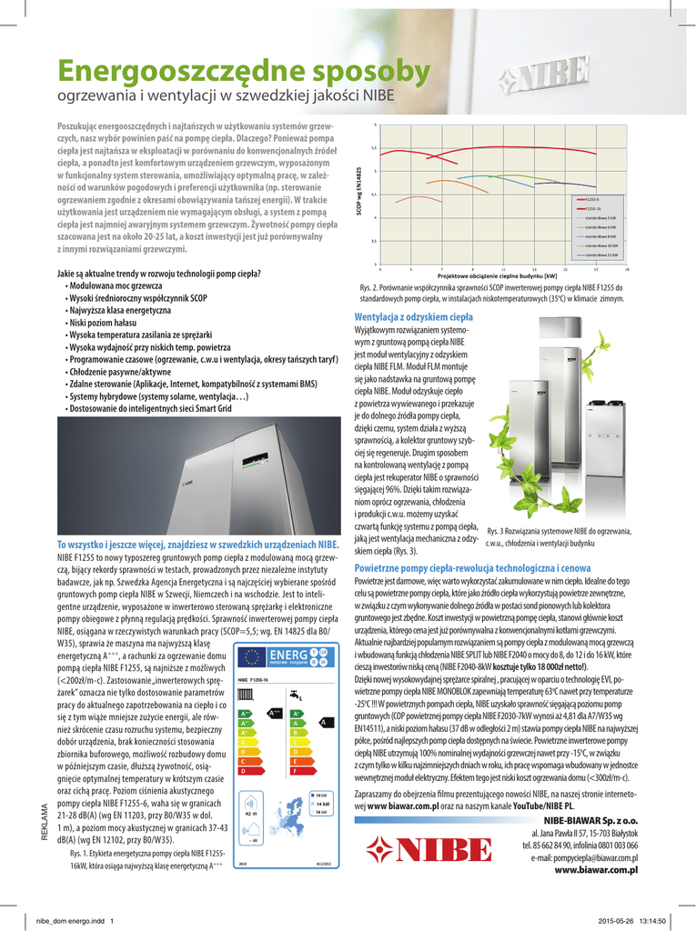 Energooszczędne sposoby ogrzewania i wentylacji w szwedzkiej jakości NIBE Poszukując energooszczędnych i najtańszych w użytkowaniu systemów grzewczych, nasz wybór powinien paść na pompę ciepła. Dlaczego? Ponieważ pompa ciepła jest najtańsza w eksploatacji w porównaniu do konwencjonalnych źródeł ciepła, a ponadto jest komfortowym urządzeniem grzewczym, wyposażonym w funkcjonalny system sterowania, umożliwiający optymalną pracę, w zależności od warunków pogodowych i preferencji użytkownika (np. sterowanie ogrzewaniem zgodnie z okresami obowiązywania tańszej energii). W trakcie użytkowania jest urządzeniem nie wymagającym obsługi, a system z pompą ciepła jest najmniej awaryjnym systemem grzewczym. Żywotność pompy ciepła szacowana jest na około 20-25 lat, a koszt inwestycji jest już porównywalny z innymi rozwiązaniami grzewczymi. Jakie są aktualne trendy w rozwoju technologii pomp ciepła? • Modulowana moc grzewcza • Wysoki średnioroczny współczynnik SCOP • Najwyższa klasa energetyczna • Niski poziom hałasu • Wysoka temperatura zasilania ze sprężarki • Wysoka wydajność przy niskich temp. powietrza • Programowanie czasowe (ogrzewanie, c.w.u i wentylacja, okresy tańszych taryf) • Chłodzenie pasywne/aktywne • Zdalne sterowanie (Aplikacje, Internet, kompatybilność z systemami BMS) • Systemy hybrydowe (systemy solarne, wentylacja…) • Dostosowanie do inteligentnych sieci Smart Grid REKLAMA To wszystko i jeszcze więcej, znajdziesz w szwedzkich urządzeniach NIBE. NIBE F1255 to nowy typoszereg gruntowych pomp ciepła z modulowaną mocą grzewczą, bijący rekordy sprawności w testach, prowadzonych przez niezależne instytuty badawcze, jak np. Szwedzka Agencja Energetyczna i są najczęściej wybierane spośród gruntowych pomp ciepła NIBE w Szwecji, Niemczech i na wschodzie. Jest to inteligentne urządzenie, wyposażone w inwerterowo sterowaną sprężarkę i elektroniczne pompy obiegowe z płynną regulacją prędkości. Sprawność inwerterowej pompy ciepła NIBE, osiągana w rzeczywistych warunkach pracy (SCOP=5,5; wg. EN 14825 dla B0/ W35), sprawia że maszyna ma najwyższą klasę energetyczną A+++, a rachunki za ogrzewanie domu pompą ciepła NIBE F1255, są najniższe z możliwych (<200zł/m-c). Zastosowanie „inwerterowych sprężarek” oznacza nie tylko dostosowanie parametrów pracy do aktualnego zapotrzebowania na ciepło i co się z tym wiąże mniejsze zużycie energii, ale również skrócenie czasu rozruchu systemu, bezpieczny dobór urządzenia, brak konieczności stosowania zbiornika buforowego, możliwość rozbudowy domu w późniejszym czasie, dłuższą żywotność, osiągnięcie optymalnej temperatury w krótszym czasie oraz cichą pracę. Poziom ciśnienia akustycznego pompy ciepła NIBE F1255-6, waha się w granicach 21-28 dB(A) (wg EN 11203, przy B0/W35 w dol. 1 m), a poziom mocy akustycznej w granicach 37-43 dB(A) (wg EN 12102, przy B0/W35). Rys. 1. Etykieta energetyczna pompy ciepła NIBE F125516kW, która osiąga najwyższą klasę energetyczną A+++ nibe_dom energo.indd 1 Rys. 2. Porównanie współczynnika sprawności SCOP inwerterowej pompy ciepła NIBE F1255 do standardowych pomp ciepła, w instalacjach niskotemperaturowych (35oC) w klimacie zimnym. Wentylacja z odzyskiem ciepła Wyjątkowym rozwiązaniem systemowym z gruntową pompą ciepła NIBE jest moduł wentylacyjny z odzyskiem ciepła NIBE FLM. Moduł FLM montuje się jako nadstawka na gruntową pompę ciepła NIBE. Moduł odzyskuje ciepło z powietrza wywiewanego i przekazuje je do dolnego źródła pompy ciepła, dzięki czemu, system działa z wyższą sprawnością, a kolektor gruntowy szybciej się regeneruje. Drugim sposobem na kontrolowaną wentylację z pompą ciepła jest rekuperator NIBE o sprawności sięgającej 96%. Dzięki takim rozwiązaniom oprócz ogrzewania, chłodzenia i produkcji c.w.u. możemy uzyskać czwartą funkcję systemu z pompą ciepła, Rys. 3 Rozwiązania systemowe NIBE do ogrzewania, jaką jest wentylacja mechaniczna z odzy- c.w.u., chłodzenia i wentylacji budynku skiem ciepła (Rys. 3). Powietrzne pompy ciepła-rewolucja technologiczna i cenowa Powietrze jest darmowe, więc warto wykorzystać zakumulowane w nim ciepło. Idealne do tego celu są powietrzne pompy ciepła, które jako źródło ciepła wykorzystują powietrze zewnętrzne, w związku z czym wykonywanie dolnego źródła w postaci sond pionowych lub kolektora gruntowego jest zbędne. Koszt inwestycji w powietrzną pompę ciepła, stanowi głównie koszt urządzenia, którego cena jest już porównywalna z konwencjonalnymi kotłami grzewczymi. Aktualnie najbardziej popularnym rozwiązaniem są pompy ciepła z modulowaną mocą grzewczą i wbudowaną funkcją chłodzenia NIBE SPLIT lub NIBE F2040 o mocy do 8, do 12 i do 16 kW, które cieszą inwestorów niską ceną (NIBE F2040-8kW kosztuje tylko 18 000zł netto!). Dzięki nowej wysokowydajnej sprężarce spiralnej , pracującej w oparciu o technologię EVI, powietrzne pompy ciepła NIBE MONOBLOK zapewniają temperaturę 63oC nawet przy temperaturze -25oC !!! W powietrznych pompach ciepła, NIBE uzyskało sprawność sięgającą poziomu pomp gruntowych (COP powietrznej pompy ciepła NIBE F2030-7kW wynosi aż 4,81 dla A7/W35 wg EN14511), a niski poziom hałasu (37 dB w odległości 2 m) stawia pompy ciepła NIBE na najwyższej półce, pośród najlepszych pomp ciepła dostępnych na świecie. Powietrzne inwerterowe pompy ciepłą NIBE utrzymują 100% nominalnej wydajności grzewczej nawet przy -15oC, w związku z czym tylko w kilku najzimniejszych dniach w roku, ich pracę wspomaga wbudowany w jednostce wewnętrznej moduł elektryczny. Efektem tego jest niski koszt ogrzewania domu (<300zł/m-c). Zapraszamy do obejrzenia filmu prezentującego nowości NIBE, na naszej stronie internetowej www biawar.com.pl oraz na naszym kanale YouTube/NIBE PL. NIBE-BIAWAR Sp. z o.o. al. Jana Paw