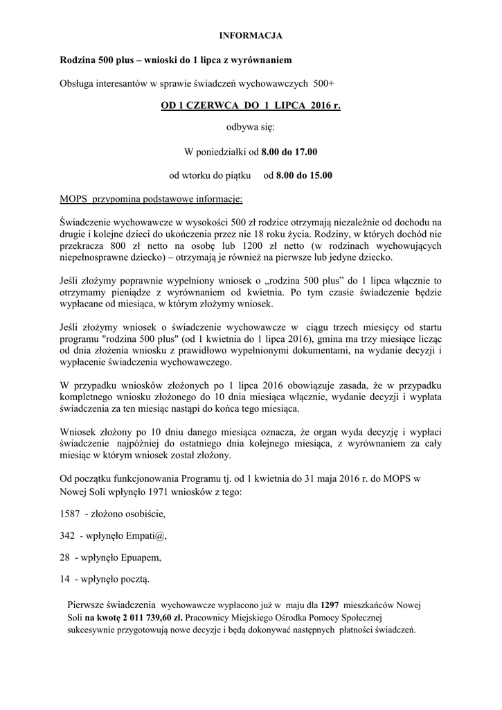 INFORMACJA Rodzina 500 plus – wnioski do 1 lipca z wyrównaniem Obsługa interesantów w sprawie świadczeń wychowawczych 500+ OD 1 CZERWCA DO 1 LIPCA 2016 r. odbywa się: W poniedziałki od 8.00 do 17.00 od wtorku do piątku od 8.00 do 15.00 MOPS przypomina podstawowe informacje: Świadczenie wychowawcze w wysokości 500 zł rodzice otrzymają niezależnie od dochodu na drugie i kolejne dzieci do ukończenia przez nie 18 roku życia. Rodziny, w których dochód nie przekracza 800 zł netto na osobę lub 1200 zł netto (w rodzinach wychowujących niepełnosprawne dziecko) – otrzymają je również na pierwsze lub jedyne dziecko. Jeśli złożymy poprawnie wypełniony wniosek o „rodzina 500 plus” do 1 lipca włącznie to otrzymamy pieniądze z wyrównaniem od kwietnia. Po tym czasie świadczenie będzie wypłacane od miesiąca, w którym złożymy wniosek. Jeśli złożymy wniosek o świadczenie wychowawcze w ciągu trzech miesięcy od startu programu "rodzina 500 plus" (od 1 kwietnia do 1 lipca 2016), gmina ma trzy miesiące licząc od dnia złożenia wniosku z prawidłowo wypełnionymi dokumentami, na wydanie decyzji i wypłacenie świadczenia wychowawczego. W przypadku wniosków złożonych po 1 lipca 2016 obowiązuje zasada, że w przypadku kompletnego wniosku złożonego do 10 dnia miesiąca włącznie, wydanie decyzji i wypłata świadczenia za ten miesiąc nastąpi do końca tego miesiąca. Wniosek złożony po 10 dniu danego miesiąca oznacza, że organ wyda decyzję i wypłaci świadczenie najpóźniej do ostatniego dnia kolejnego miesiąca, z wyrównaniem za cały miesiąc w którym wniosek został złożony. Od początku funkcjonowania Programu tj. od 1 kwietnia do 31 maja 2016 r. do MOPS w Nowej Soli wpłynęło 1971 wniosków z tego: 1587 - złożono osobiście, 342 - wpłynęło Empati@, 28 - wpłynęło Epuapem, 14 - wpłynęło pocztą. Pierwsze świadczenia wychowawcze wypłacono już w maju dla 1297 mieszkańców Nowej Soli na kwotę 2 011 739,60 zł. Pracownicy Miejskiego Ośrodka Pomocy Społecznej sukcesywnie przygotowują nowe decyzje i będą dokonywać następnych płatności świadczeń.