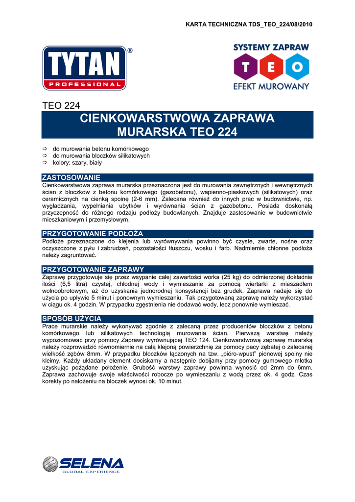 KARTA TECHNICZNA TDS_TEO_224/08/2010 TEO 224 CIENKOWARSTWOWA ZAPRAWA MURARSKA TEO 224 do murowania betonu komórkowego do murowania bloczków silikatowych kolory: szary, biały ZASTOSOWANIE Cienkowarstwowa zaprawa murarska przeznaczona jest do murowania zewnętrznych i wewnętrznych ścian z bloczków z betonu komórkowego (gazobetonu), wapienno-piaskowych (silikatowych) oraz ceramicznych na cienką spoinę (2-6 mm). Zalecana również do innych prac w budownictwie, np. wygładzania, wypełniania ubytków i wyrównania ścian z gazobetonu. Posiada doskonałą przyczepność do różnego rodzaju podłoży budowlanych. Znajduje zastosowanie w budownictwie mieszkaniowym i przemysłowym. PRZYGOTOWANIE PODŁOŻA Podłoże przeznaczone do klejenia lub wyrównywania powinno być czyste, zwarte, nośne oraz oczyszczone z pyłu i zabrudzeń, pozostałości tłuszczu, wosku i farb. Nadmiernie chłonne podłoża należy zagruntować. PRZYGOTOWANIE ZAPRAWY Zaprawę przygotowuje się przez wsypanie całej zawartości worka (25 kg) do odmierzonej dokładnie ilości (6,5 litra) czystej, chłodnej wody i wymieszanie za pomocą wiertarki z mieszadłem wolnoobrotowym, aż do uzyskania jednorodnej konsystencji bez grudek. Zaprawa nadaje się do użycia po upływie 5 minut i ponownym wymieszaniu. Tak przygotowaną zaprawę należy wykorzystać w ciągu ok. 4 godzin. W przypadku zgęstnienia nie dodawać wody, lecz ponownie wymieszać. SPOSÓB UŻYCIA Prace murarskie należy wykonywać zgodnie z zalecaną przez producentów bloczków z betonu komórkowego lub silikatowych technologią murowania ścian. Pierwszą warstwę należy wypoziomować przy pomocy Zaprawy wyrównującej TEO 124. Cienkowarstwową zaprawę murarską należy rozprowadzić równomiernie na całą klejoną powierzchnię za pomocy pacy zębatej o zalecanej wielkość zębów 8mm. W przypadku bloczków łączonych na tzw. „pióro-wpust” pionowej spoiny nie kleimy. Każdy układany element dociskamy a następnie dobijamy przy pomocy gumowego młotka uzyskując pożądane położenie. Grubość warstwy zaprawy powinna wynosić od 2mm do 6mm. Zaprawa zachowuje swoje właściwości robocze po wymieszaniu z wodą przez ok. 4 godz. Czas korekty po nałożeniu na bloczek wynosi ok. 10 minut. KARTA TECHNICZNA TDS_TEO_224/08/2010 DANE TECHNICZNE proporcje mieszania grubość warstwy Max. wielkość kruszywa zgodnie z normą Gęstość nasypowa gęstość objętościowa świeżej zaprawy wytrzymałość na ściskanie początkowa wytrzymałość na ścinanie: Współczynnik przewodzenia ciepła (λ10, dry) czas zachowania właściwości roboczych Czas korekty temperatura stosowania Trwałość po związaniu kolor ok. 6,5 litrów wody na 25 kg suchej mieszanki 2- 6mm <2,0 mm 3 1630 kg/m ±10% 3 1660 kg/m ±5% 2 ≥ 10 N/mm 2 0,3 N/mm (wartość tab.) 0,76 W/mK (wartość tab.) do 4 h do 10 minut od + 5ºC do +25ºC Mrozoodporna (po 25 cyklach zamrażania – rozmrażania : spadek wytrzymałości o 2%, ubytek masy 0%) szary lub biały SKŁADOWANIE I TRANSPORT Zaprawę należy przewozić i przechowywać w suchych warunkach na paletach i w oryginalnych, nie uszkodzonych opakowaniach. Tak przechowywany produkt posiada okres przydatności do użycia 12 miesięcy. Chronić przed wilgocią. ZGODNOŚĆ Z NORMAMI I WYMAGANIAMI JAKOŚCIOWYMI Produkt jest zgodny z Polską Normą PN-EN 998-2 oraz posiada Deklaracje Zgodności WE 14/1/2010 z dnia 09.07.2010. Aktualizacja 31.08.2010 Powyższe dane, zalecenia i wskazówki opierają się na naszej najlepszej wiedzy, badaniach oraz doświadczeniach i zostały udzielone w dobrej wierze zgodnie z zasadami obowiązującymi w naszej firmie i u naszych dostawców. Zaproponowane sposoby postępowania uznane są za powszechne, jednak każdy z użytkowników tego materiału powinien upewnić się na wszelkie możliwe sposoby, włącznie ze sprawdzeniem produktu końcowego w odpowiednich warunkach, o przydatności dostarczanych materiałów dla osiągnięcia celów przez niego zamierzonych. Ani Spółka, ani jej upoważnieni przedstawiciele nie mogą ponosić odpowiedzialności za jakiekolwiek straty poniesione na skutek nieprawidłowego, bądź błędnego użycia jej materiałów.