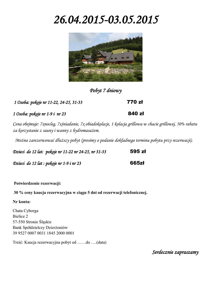 26.04.2015-03.05.2015 Pobyt 7 dniowy 1 Osoba: pokoje nr 11-22, 24-25, 31-33 770 zł 1 Osoba: pokoje nr 1-9 i nr 23 840 zł Cena obejmuje: 7xnocleg, 7xśniadanie, 7x obiadokolacje, 1 kolacja grillowa w chacie grillowej, 50% rabatu za korzystanie z sauny i wanny z hydromasażem. Można zarezerwować dłuższy pobyt (prosimy o podanie dokładnego terminu pobytu przy rezerwacji). Dzieci do 12 lat: pokoje nr 11-22 nr 24-25, nr 31-33 595 zł Dzieci do 12 lat : pokoje nr 1-9 i nr 23 665zł Potwierdzenie rezerwacji: 30 % ceny kaucja rezerwacyjna w ciągu 5 dni od rezerwacji telefonicznej. Nr konta: Chata Cyborga Bielice 2 57-550 Stronie Śląskie Bank Spółdzielczy Dzierżoniów 39 9527 0007 0031 1845 2000 0001 Treść: Kaucja rezerwacyjna pobyt od ……do ….(data) Serdecznie zapraszamy