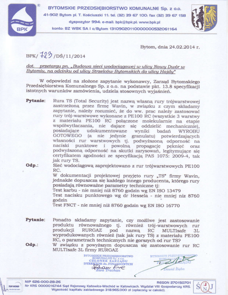 BYToMSK|€ PRz€ D s|ĘB|oRsTwo KoMUNALN€ 5p. z o.o' 41.9oa Bgtom P|'T. Kościusżki1'|lt€ | . (Ba) 39 67 too fex (3e) 39 67 15B dgspozgtor 994. € . mail: [email protected]|: www.bPkp| konto: BZ WBK SA I o/Bgtom 131O9OeOl tOOOOOOOS3aO61t64 Bytom, dnia 24.02.2014r. 4aA^ BPK/ ?4',) /DS lrr l2or4 dot. przetąrgu prt '.Blldowa sieci u.lodociąaouei u uticu Nouu Duór u Butomiu. ną,odcinlq, od,ulica strzetóu Bl]tomskich da ulicu Haidu, w odpowiedzj na złożone zap'.ta'j"ie wykonawry, za].ząd Bytomskiego Przedsiębiorctwa Komunalnego Sp. z o.o. na podstawie pkt' 13'8 specy{ikacji istotnych waJunków zamówienia' udziela stosownych w}jaśnień. PTrtalte: ołlp.: Pytalie: odp.: Rura Ts (Total security} jest nazwą własną rury trójwa$twowej zastr?śżo!|ąprzez fi.rmę Wavin, w związklt z czym składamy zapytanie, na]eąr rozumieć, że do ww. prac naJeŻy zastosować rury troj-warstwowewykonarle z pE100 RC (wsrystkie 3 warstwy z matefia]u PE100 Rc połączone molekularnie na etapie współwytłaczania' nie dające się oddzielić mechanicznie), posiadające udokumentowane wyniki badań wYRoBU GoTowEGo (a nie jedynie granulatu) potwierdzających własności IuI walstwowych tj' podtYższoną odpornoŚć na punktowe i powo1ną plopagację pęklięć naciski otaz podwżs^)ną odporność na skutki zaĄrsowań, legitymujące się certJrlikatem zgodnościze specyfikacją PAs 1075: 2oo9-4, tak jak rury TS. Sieć wodociągowązaprojektowano z rur trójwarstwowych PE1oo RC. w dokumentacji projeldowej prądęto rury Iirmy Wavin, "TS" jednakźe dopuszcza się kaźdego innego producenta, którego rury posiadają równowaźnepaIametry techniczne tj; Test ka-rbu . nie mniej niż 8760 godzin wg EN Iso 13479 Test nacisku punktowego wg dr Hessela - nie mniej niz 8760 godzin Test FNCT - nie mniej niż 8760 godzrn urg EN Iso 16770 Ponadto składamy zapytanie, czy możdiwe jest zastosowanie produktu równowaźnego tj. również trój-waIstwowych rur plodukcji RURGAZ pod nazwą Rc MULTIsafe 3L vĄrprodukowanych rólr'nież (tak jak rury TS) z materiału PE10O Rc, o pa'rametIach technicznych nie gorsą/ch od rur TS? W związku z powirsz',tĄ dopuszcza się zastosowanie rur Rc MULTIsafe 3L firmy RURGAZ BYr.OlIs}{n PEf EostI+BroRbTwo czŁoNl!K zAjiZjDU DYREł{g) t. dŚ' Fn\+!so tł,YcH ołq-Jao*L f,v€ Łwa 1rucnan '\ I|yfi|. N|P5e6.ooo-?&a5 R€ G oN a7o15o7o1 . Nr KRs ooooo1572l4 sąd R€jonow! Katowi.€-Wschód w Katowicach' Wudfial VI|l Gospodafcfg wgsokość kap|ta|Uzakładowego31a'965ooo fl (oPEconq w całośći)' KE5'