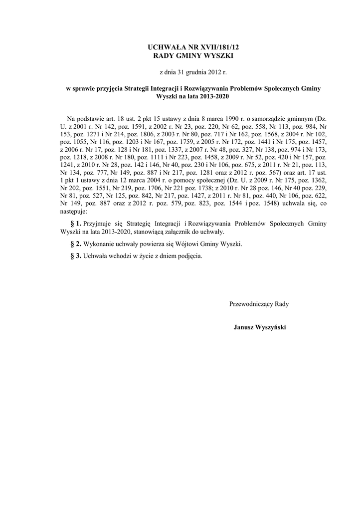 UCHWAŁA NR XVII/181/12 RADY GMINY WYSZKI z dnia 31 grudnia 2012 r. w sprawie przyjęcia Strategii Integracji i Rozwiązywania Problemów Społecznych Gminy Wyszki na lata 2013-2020 Na podstawie art. 18 ust. 2 pkt 15 ustawy z dnia 8 marca 1990 r. o samorządzie gminnym (Dz. U. z 2001 r. Nr 142, poz. 1591, z 2002 r. Nr 23, poz. 220, Nr 62, poz. 558, Nr 113, poz. 984, Nr 153, poz. 1271 i Nr 214, poz. 1806, z 2003 r. Nr 80, poz. 717 i Nr 162, poz. 1568, z 2004 r. Nr 102, poz. 1055, Nr 116, poz. 1203 i Nr 167, poz. 1759, z 2005 r. Nr 172, poz. 1441 i Nr 175, poz. 1457, z 2006 r. Nr 17, poz. 128 i Nr 181, poz. 1337, z 2007 r. Nr 48, poz. 327, Nr 138, poz. 974 i Nr 173, poz. 1218, z 2008 r. Nr 180, poz. 1111 i Nr 223, poz. 1458, z 2009 r. Nr 52, poz. 420 i Nr 157, poz. 1241, z 2010 r. Nr 28, poz. 142 i 146, Nr 40, poz. 230 i Nr 106, poz. 675, z 2011 r. Nr 21, poz. 113, Nr 134, poz. 777, Nr 149, poz. 887 i Nr 217, poz. 1281 oraz z 2012 r. poz. 567) oraz art. 17 ust. 1 pkt 1 ustawy z dnia 12 marca 2004 r. o pomocy społecznej (Dz. U. z 2009 r. Nr 175, poz. 1362, Nr 202, poz. 1551, Nr 219, poz. 1706, Nr 221 poz. 1738; z 2010 r. Nr 28 poz. 146, Nr 40 poz. 229, Nr 81, poz. 527, Nr 125, poz. 842, Nr 217, poz. 1427, z 2011 r. Nr 81, poz. 440, Nr 106, poz. 622, Nr 149, poz. 887 oraz z 2012 r. poz. 579, poz. 823, poz. 1544 i poz. 1548) uchwala się, co następuje: § 1. Przyjmuje się Strategię Integracji i Rozwiązywania Problemów Społecznych Gminy Wyszki na lata 2013-2020, stanowiącą załącznik do uchwały. § 2. Wykonanie uchwały powierza się Wójtowi Gminy Wyszki. § 3. Uchwała wchodzi w życie z dniem podjęcia. Przewodniczący Rady Janusz Wyszyński Załącznik do uchwały Nr XVII/181/12 Rady Gminy Wyszki z dnia 31 grudnia 2012 r. STRATEGIA INTEGRACJI I ROZWIĄZYWANIA PROBLEMÓW SPOŁECZNYCH GMINY WYSZKI NA LATA 2013 – 2020 2 WPROWADZENIE Integracja oraz rozwiązywanie problemów społecznych stanowi obok rozwoju infrastruktury jedno z najważniejszych zadań polityki społecznej każdej gminy. Chociaż forma wdrażania rozwiązań społecznych przybiera kształt programów i projektów, to podstawowym elementem odpowiedzi na problemy i potrzeby społeczne jest dokument strategiczny. Gminna Strategia Integracji i Rozwiązywania Problemów Społecznych ma stanowić podstawę do realizacji względnie trwałych wzorów interwencji społecznych, podejmowanych w celu zmiany (poprawy) tych stanów rzeczy (zjawisk) występujących w obrębie danej społeczności, które oceniane są negatywnie. W najbardziej ogólnym ujęciu oznacza sposób osiągania wyznaczonych celów poprzez sterowanie procesem rozwoju, integracji i polityki społecznej. Formuła otwartego, ciągłego przewidywania i projektowania przyszłości powinna stanowić przydatne, pragmatyczne narzędzie regulacji rozwoju w sytuacji, gdy nadmiar celów w stosunku do ograniczonych środków utrudnia podejmowanie bieżących i przyszłych decyzji. Zmienność uwarunkowań zewnętrznych, występowanie sprzeczności a nawet konfliktów interesów i dążeń różnych grup społecznych narzuca konieczność przyjęcia negocjacyjnej formuły zarządzania polityką społeczną. Istotą jej jest dochodzenie do porozumienia społecznego, minimalizując sytuacje konfliktowe. Musi to być zatem formuła kształtowania strategii elastycznych, otwartych i dynamicznych wobec przyszłości. Cele integracji powinny być wyrazem dążeń i aspiracji społeczności lokalnej zmierzających do rozwiązania zidentyfikowanych problemów, likwidacji barier i zagrożeń oraz do wykorzystania wszelkich szans tkwiących w potencjale ludzkim i materialnym dla przyszłej integracji. Dzięki określeniu podstawowych priorytetów, celów i zadań w dziedzinie polityki społecznej, gmina zyskuje skonkretyzowaną wizję z zakresu rozwiązywania istniejących problemów oraz działań profilaktycznych jakie powinno się podjąć w celu przeciwdziałania powstawaniu nowych problemów. Dokument charakteryzuje w szczególności działania publicznych instytucji jak i organizacji pozarządowych rozwiązujących kwestie społeczne, podejmowane dla poprawy warunków zaspokojenia potrzeb przez wybrane kategorie osób i rodzin. Zamieszczone w dalszej części informacje stanowią diagnozę aktualnej sytuacji i stanu, który w niektórych kwestiach jest zadawalający, 3 zaś w innych wymaga zinterdyscyplinowanych działań na rzecz lokalnej wspólnoty. Charakterystyka odnosi się do przeciwdziałania konkretnym kwestiom społecznym i dotyczy spraw: bezrobocia, marginalizacji osób starszych i niepełnosprawnych, dzieci i młodzieży, patologii społecznych, ochrony zdrowia, edukacji. Zgodnie z zaleceniami legislacyjnymi (opracowanie i realizacja gminnej strategii rozwiązywania problemów społecznych należy do zadań własnych gminy o charakterze obowiązkowym zgodnie z ustawą z dnia 12 marca 2004 r. o pomocy społecznej Dz. U. Nr 64 poz. 593 z późn. zm.). Ponadto art. 16b ust. 2 ww. ustawy określa, że strategia rozwiązywania problemów społecznych winna zawierać, w szczególności następujące elementy: 1) diagnozę sytuacji społecznej; 2) prognozę zmian w zakresie objętym strategią; 3) określenie: a) celów strategicznych projektowanych zmian, b) kierunków niezbędnych działań, c) sposobu realizacji strategii oraz jej ram finansowych, d) wskaźników realizacji działań. Opracowując gminną strategię rozwiązywania problemów społecznych, uwzględniono dokumenty programowe, w których akcentuje się konieczność zapewnienia partnerskiej współpracy instytucji rządowych, samorządowych, organizacji pozarządowych. Uznaje się także za niezbędną partnerską współpracę z osobami podlegającymi wykluczeniu społecznemu. Strategia Integracji i Rozwiązywania Problemów Społecznych Gminy Wyszki na lata 2013-2020 jest instrumentem umożliwiającym podejmowanie decyzji zarówno w najbliższym okresie, jak i w odległej perspektywie. Strategia b