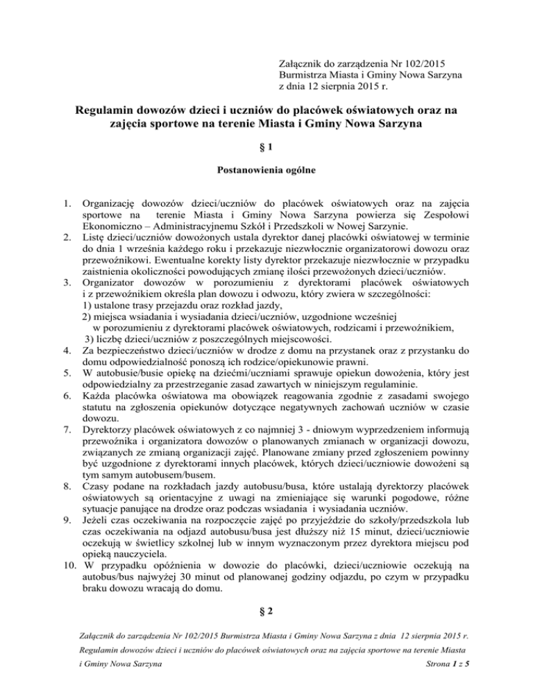 Załącznik do zarządzenia Nr 102/2015 Burmistrza Miasta i Gminy Nowa Sarzyna z dnia 12 sierpnia 2015 r. Regulamin dowozów dzieci i uczniów do placówek oświatowych oraz na zajęcia sportowe na terenie Miasta i Gminy Nowa Sarzyna §1 Postanowienia ogólne 1. 2. 3. 4. 5. 6. 7. 8. 9. 10. Organizację dowozów dzieci/uczniów do placówek oświatowych oraz na zajęcia sportowe na terenie Miasta i Gminy Nowa Sarzyna powierza się Zespołowi Ekonomiczno – Administracyjnemu Szkół i Przedszkoli w Nowej Sarzynie. Listę dzieci/uczniów dowożonych ustala dyrektor danej placówki oświatowej w terminie do dnia 1 września każdego roku i przekazuje niezwłocznie organizatorowi dowozu oraz przewoźnikowi. Ewentualne korekty listy dyrektor przekazuje niezwłocznie w przypadku zaistnienia okoliczności powodujących zmianę ilości przewożonych dzieci/uczniów. Organizator dowozów w porozumieniu z dyrektorami placówek oświatowych i z przewoźnikiem określa plan dowozu i odwozu, który zwiera w szczególności: 1) ustalone trasy przejazdu oraz rozkład jazdy, 2) miejsca wsiadania i wysiadania dzieci/uczniów, uzgodnione wcześniej w porozumieniu z dyrektorami placówek oświatowych, rodzicami i przewoźnikiem, 3) liczbę dzieci/uczniów z poszczególnych miejscowości. Za bezpieczeństwo dzieci/uczniów w drodze z domu na przystanek oraz z przystanku do domu odpowiedzialność ponoszą ich rodzice/opiekunowie prawni. W autobusie/busie opiekę na dziećmi/uczniami sprawuje opiekun dowożenia, który jest odpowiedzialny za przestrzeganie zasad zawartych w niniejszym regulaminie. Każda placówka oświatowa ma obowiązek reagowania zgodnie z zasadami swojego statutu na zgłoszenia opiekunów dotyczące negatywnych zachowań uczniów w czasie dowozu. Dyrektorzy placówek oświatowych z co najmniej 3 - dniowym wyprzedzeniem informują przewoźnika i organizatora dowozów o planowanych zmianach w organizacji dowozu, związanych ze zmianą organizacji zajęć. Planowane zmiany przed zgłoszeniem powinny być uzgodnione z dyrektorami innych placówek, których dzieci/uczniowie dowożeni są tym samym autobusem/busem. Czasy podane na rozkładach jazdy autobusu/busa, które ustalają dyrektorzy placówek oświatowych są orientacyjne z uwagi na zmieniające się warunki pogodowe, różne sytuacje panujące na drodze oraz podczas wsiadania i wysiadania uczniów. Jeżeli czas oczekiwania na rozpoczęcie zajęć po przyjeździe do szkoły/przedszkola lub czas oczekiwania na odjazd autobusu/busa jest dłuższy niż 15 minut, dzieci/uczniowie oczekują w świetlicy szkolnej lub w innym wyznaczonym przez dyrektora miejscu pod opieką nauczyciela. W przypadku opóźnienia w dowozie do placówki, dzieci/uczniowie oczekują na autobus/bus najwyżej 30 minut od planowanej godziny odjazdu, po czym w przypadku braku dowozu wracają do domu. §2 Załącznik do zarządzenia Nr 102/2015 Burmistrza Miasta i Gminy Nowa Sarzyna z dnia 12 sierpnia 2015 r. Regulamin dowozów dzieci i uczniów do placówek oświatowych oraz na zajęcia sportowe na terenie Miasta i Gminy Nowa Sarzyna Strona 1 z 5 Obowiązki opiekuna 1. Opiekun jest odpowiedzialny za bezpieczeństwo dzieci/uczniów w trakcie wsiadania i wysiadania ze środka transportu oraz w trakcie przejazdu. 2. Opiekun przewozu ponosi odpowiedzialność za przewożone dzieci/uczniów: 1) od chwili wejścia do autobusu/busa, do chwili wyjścia z pojazdu i przekazania ich pod opiekę placówki, 2) w drodze powrotnej od chwili wejścia ucznia do autobusu/busa przy placówce do chwili opuszczenia autobusu przez ucznia na przystanku w swojej miejscowości. 3. W trakcie wykonywania czynności związanych z opieką ściśle współpracuje z kierowcą pojazdu w zakresie bezpieczeństwa przewozu a mianowicie: 1) w trakcie realizacji przewozu przebywa wewnątrz środka transportu (w miejscu zapewniającym dobrą widoczność wszystkich dzieci i uczniów), 2) w trakcie wsiadania i wysiadania dzieci i uczniów, po zatrzymaniu pojazdu, otwiera drzwi autobusu (jeżeli nie są to drzwi automatyczne) i wychodzi na zewnątrz, w razie potrzeby służy pomocą uczniom, 3) obowiązek wychodzenia na zewnątrz autobusu przez opiekuna nie dotyczy pojedynczych osób wsiadających i wysiadających w grupie młodzieży starszej (klasy IV-VI szkoły podstawowej i gimnazjum), 4) po wejściu wszystkich dzieci i uczniów do pojazdu według porządku ustalonego przez siebie opiekun sprawdza, czy uczniowie zajęli miejsca siedzące, 5) w trakcie przejazdu opiekun na bieżąco kontroluje stan ładu i bezpieczeństwa w pojeździe, podejmując skuteczną interwencje w razie jego naruszenia, 6) opiekun każdego kursu odbiera uczniów od opiekuna świetlicy lub nauczyciela, który doprowadza uczniów do autobusu, 7) w czasie pracy opiekun jest zobowiązany do noszenia kamizelki odblaskowej, 8) w razie potrzeby opiekun przeprowadza dzieci w miejscu bezpiecznym na drugą stronę ulicy i podczas pobytu na drodze powinien stosować tabliczkę ze znakiem „STOP” w odniesieniu do nadjeżdżających pojazdów, 9) po opuszczeniu przez uczniów autobusu opiekun dokonuje przeglądu pojazdu i w przypadku znalezienia przedmiotów pozostawionych przez uczniów (np. plecak, odzież, telefon) powiadamia o tym kierowcę i dyrektora placówki oświatowej, 10) w przypadku awarii lub wypadku autobusu/busa opiekun ściśle współpracuje z kierowcą oraz sprawuje opiekę nad dowożonymi dziećmi i uczniami zapewniając im bezpieczeństwo do czasu przyjazdu autobusu zastępczego lub rodziców uczniów. Opiekun informuje o tym właściwego dyrektora placówki lub organizatora dowozu, 4. O nieodpowiednim zachowaniu uczniów opiekun informuje ustnie dyrektora placówki oświatowej, do której uczeń uczęszcza. §3 Prawa i obowiązki dzieci/uczniów 1. Z dowozu może korzystać każde dziecko/uczeń, który znajduje się na liście dzieci/uczniów dowożonych do danej placówki oświatowej i posiada aktualny bilet miesięcz