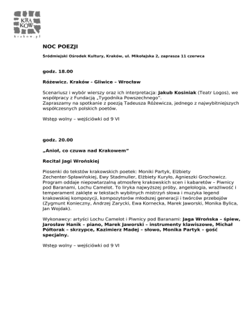 NOC POEZJI Śródmiejski Ośrodek Kultury, Kraków, ul. Mikołajska 2, zaprasza 11 czerwca godz. 18.00 Różewicz. Kraków - Gliwice – Wrocław Scenariusz i wybór wierszy oraz ich interpretacja: Jakub Kosiniak (Teatr Logos), we współpracy z Fundacją „Tygodnika Powszechnego”. Zapraszamy na spotkanie z poezją Tadeusza Różewicza, jednego z najwybitniejszych współczesnych polskich poetów. Wstęp wolny – wejściówki od 9 VI godz. 20.00 „Anioł, co czuwa nad Krakowem” Recital Jagi Wrońskiej Piosenki do tekstów krakowskich poetek: Moniki Partyk, Elżbiety Zechenter-Spławińskiej, Ewy Stadmuller, Elżbiety Kuryło, Agnieszki Grochowicz. Program oddaje niepowtarzalną atmosferę krakowskich scen i kabaretów – Piwnicy pod Baranami, Lochu Camelot. To liryka najwyższej próby, angelologia, wrażliwość i temperament zaklęte w tekstach wybitnych mistrzyń słowa i muzyka legend krakowskiej kompozycji, kompozytorów młodszej generacji i twórców przebojów (Zygmunt Konieczny, Andrzej Zarycki, Ewa Kornecka, Marek Jaworski, Monika Bylica, Jan Wojdak). Wykonawcy: artyści Lochu Camelot i Piwnicy pod Baranami: Jaga Wrońska – śpiew, Jarosław Hanik – piano, Marek Jaworski – instrumenty klawiszowe, Michał Półtorak – skrzypce, Kazimierz Madej – słowo, Monika Partyk – gość specjalny. Wstęp wolny – wejściówki od 9 VI Powered by TCPDF (www.tcpdf.org)