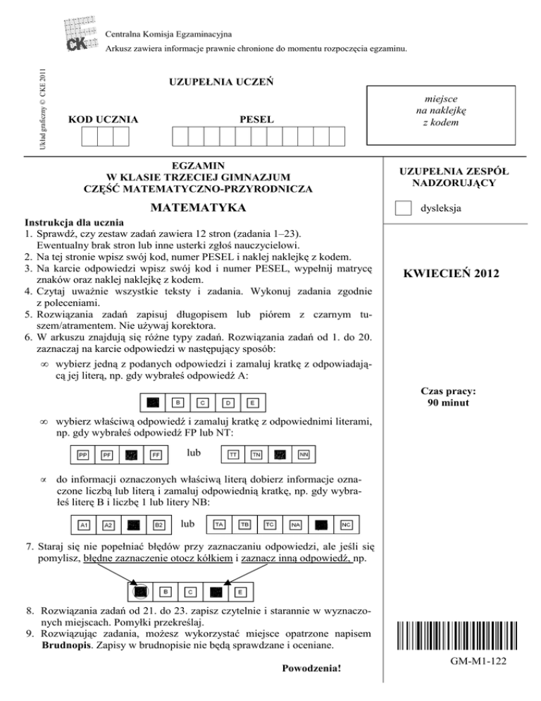Centralna Komisja Egzaminacyjna Układ graficzny © CKE 2011 Arkusz zawiera informacje prawnie chronione do momentu rozpoczęcia egzaminu. UZUPEŁNIA UCZEŃ miejsce na naklejkę z kodem PESEL KOD UCZNIA EGZAMIN W KLASIE TRZECIEJ GIMNAZJUM CZĘŚĆ MATEMATYCZNO-PRZYRODNICZA MATEMATYKA UZUPEŁNIA ZESPÓŁ NADZORUJĄCY dysleksja Instrukcja dla ucznia 1. Sprawdź, czy zestaw zadań zawiera 12 stron (zadania 1–23). Ewentualny brak stron lub inne usterki zgłoś nauczycielowi. 2. Na tej stronie wpisz swój kod, numer PESEL i naklej naklejkę z kodem. 3. Na karcie odpowiedzi wpisz swój kod i numer PESEL, wypełnij matrycę znaków oraz naklej naklejkę z kodem. 4. Czytaj uwaŜnie wszystkie teksty i zadania. Wykonuj zadania zgodnie z poleceniami. 5. Rozwiązania zadań zapisuj długopisem lub piórem z czarnym tuszem/atramentem. Nie uŜywaj korektora. 6. W arkuszu znajdują się róŜne typy zadań. Rozwiązania zadań od 1. do 20. zaznaczaj na karcie odpowiedzi w następujący sposób: KWIECIEŃ 2012 • wybierz jedną z podanych odpowiedzi i zamaluj kratkę z odpowiadającą jej literą, np. gdy wybrałeś odpowiedź A: Czas pracy: 90 minut • wybierz właściwą odpowiedź i zamaluj kratkę z odpowiednimi literami, np. gdy wybrałeś odpowiedź FP lub NT: lub • do informacji oznaczonych właściwą literą dobierz informacje oznaczone liczbą lub literą i zamaluj odpowiednią kratkę, np. gdy wybrałeś literę B i liczbę 1 lub litery NB: lub 7. Staraj się nie popełniać błędów przy zaznaczaniu odpowiedzi, ale jeśli się pomylisz, błędne zaznaczenie otocz kółkiem i zaznacz inną odpowiedź, np. 8. Rozwiązania zadań od 21. do 23. zapisz czytelnie i starannie w wyznaczonych miejscach. Pomyłki przekreślaj. 9. Rozwiązując zadania, moŜesz wykorzystać miejsce opatrzone napisem Brudnopis. Zapisy w brudnopisie nie będą sprawdzane i oceniane. Powodzenia! GM-M1-122 Zadanie 1. Na diagramie przedstawiono wyniki pracy klasowej z matematyki w pewnej klasie. Dokończ zdanie tak, aby otrzymać zdanie prawdziwe. Z informacji podanych na diagramie wynika, Ŝe A. pracę klasową pisało 30 uczniów. B. najczęściej powtarzającą się oceną jest 4. C. mediana wyników z pracy klasowej wynosi 2. D. średnia wyników z pracy klasowej jest równa 3,6. Zadanie 2. Dokończ zdanie tak, aby otrzymać zdanie prawdziwe. Odległość na osi liczbowej między największą i najmniejszą spośród liczb: 0, 3 , − 5 , − 2 4 2 jest równa A. 1 3 4 B. 3 1 4 C. 2 3 4 D. 1 1 4 Zadanie 3. Dokończ zdanie tak, aby otrzymać zdanie prawdziwe. Połowa uczestników wycieczki urodziła się w Polsce, co trzeci urodził się w Niemczech, a pięciu pozostałych we Francji. W wycieczce brało udział A. 26 osób. B. 30 osób. C. 46 osób. PRZENIEŚ ROZWIĄZANIA NA KARTĘ ODPOWIEDZI! Strona 2 z 12 D. 60 osób. Zadanie 4. Dokończ zdanie tak, aby otrzymać zdanie prawdziwe. Liczba A. 3 32 + 32 + 32 jest równa 33 0 B. 31 C. 32 D. 33 Zadanie 5. Oceń prawdziwość podanych zdań. Wybierz P, jeśli zdanie jest prawdziwe, lub F – jeśli jest fałszywe. Liczba 1725 jest liczbą podzielną przez 15. P F Liczba 1725 jest wielokrotnością 125. P F Zadanie 6. Glazurnik układał płytki. Wykres przedstawia liczbę ułoŜonych płytek w zaleŜności od czasu w trakcie ośmiogodzinnego dnia pracy. liczba płytek 250 200 150 100 50 700 800 900 1000 1100 1200 1300 1400 1500 godzina Na podstawie wykresu wybierz zdanie fałszywe. A. B. C. D. O godzinie 1000 glazurnik rozpoczął godzinną przerwę. Od 700 do 800 glazurnik ułoŜył mniej płytek niŜ od 1100 do 1200. W ciągu kaŜdej godziny glazurnik układał taką samą liczbę płytek. Przez ostatnie trzy godziny pracy glazurnik ułoŜył 50 płytek. PRZENIEŚ ROZWIĄZANIA NA KARTĘ ODPOWIEDZI! Strona 3 z 12 Zadanie 7. Dokończ zdanie tak, aby otrzymać zdanie prawdziwe. Cena płyty kompaktowej po 30% obniŜce wynosi 49 zł. Cena tej płyty przed obniŜką była równa A. 14,70 zł. B. 34,30 zł. C. 63,70 zł. D. 70,00 zł. Informacje do zadań 8. i 9. W turnieju szachowym wzięło udział 48 uczniów pewnego gimnazjum. Liczby uczestników turnieju z klas pierwszych, drugich i trzecich są do siebie w proporcji 3 : 8 : 5. Zadanie 8. Jaki procent uczestników turnieju stanowili drugoklasiści? Wybierz odpowiedź spośród podanych. A. 17% B. 24% C. 33% D. 50% Zadanie 9. Dokończ zdanie tak, aby otrzymać zdanie prawdziwe. Liczba uczniów klas pierwszych, którzy wzięli udział w turnieju, jest równa A. 8 B. 9 C. 10 D. 11 Zadanie 10. Organizatorzy konkursu matematycznego przygotowali zestaw, w którym było 10 pytań z algebry i 8 pytań z geometrii. Uczestnicy konkursu losowali kolejno po jednym pytaniu, które po wylosowaniu było usuwane z zestawu. Pierwszy uczestnik wylosował pytanie z algebry. Oceń prawdziwość podanych zdań. Wybierz P, jeśli zdanie jest prawdziwe, lub F – jeśli jest fałszywe. Prawdopodobieństwo wyciągnięcia przez drugą osobę pytania z algebry jest równe 9 . 17 P F Prawdopodobieństwo wyciągnięcia przez drugą osobę pytania z geometrii się nie zmieniło. P F PRZENIEŚ ROZWIĄZANIA NA KARTĘ ODPOWIEDZI! Strona 4 z 12 Informacje do zadań 11.–13. Małgosia narysowała równoległobok połoŜony w układzie współrzędnych tak jak na pierwszym rysunku. Kolejne przystające do niego równoległoboki rysowała w taki sposób, Ŝe dolny lewy wierzchołek rysowanego równoległoboku był środkiem górnego boku poprzedniego równoległoboku (rysunek 2.). Rysunek 1. Rysunek 2. Zadanie 11. Dokończ zdanie tak, aby otrzymać zdanie prawdziwe. Małgosia narysowała w opisany sposób czwarty równoległobok. Współrzędna y prawego górnego wierzchołka tego równoległoboku jest równa A. 8 B. 9 C. 10 D. 11 Zadanie 12. Dokończ zdanie tak, aby otrzymać zdanie prawdziwe. Agnieszka narysowała w taki sam sposób n równoległoboków. Współrzędna y prawego górnego wierzchołka ostatniego równoległoboku jest równa A. n + 2 B