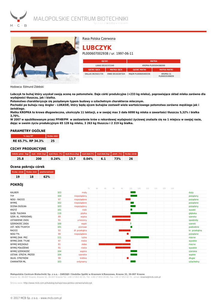 Rasa Polska Czerwona LUBCZYK PL000607002938 / ur. 1997-06-11 OJCIEC MATKA LUKAS DE102372349 KROPKA PL005004388369 OJCIEC OJCA MATKA OJCA OJCIEC MATKI MATKA MATKI DALLAS DE25021735 ENNE DE102287324 MAJOR PL000605400336 KROPKA 31 PL000035306839 Hodowca: Edmund Zdebski Lubczyk to buhaj który uzyskał swoją ocenę na potomstwie. Daje córki produkcyjne (+233 kg mleka), poprawiające skład mleka zarówno dla wydajności tłuszczu, jak i białka. Potomstwo charakteryzuje się pożądanym typem budowy o szlachetnym charakterze mlecznym. Pochodzi po buhaju rasy Angler – LUKASIE, który będą ojcem buhajów zostawił wiele wartościowego potomstwa zarówno męskiego jak i żeńskiego. Matka KROPKA to krowa długowieczna, ukończyła 11 laktacji, a w swojej max 3 dała 6098 kg mleka o zawartości tłuszczu 5,32% i białka 3,70%. W 2007 w opublikowanym przez PFHBIPM w zestawienie krów o rekordowej wydajności życiowej znalazła się na 1 miejscu w swojej rasie, dając w swoim życiu produkcyjnym 65 128 kg mleka, 3 263 kg tłuszczu i 2 319 kg białka. PARAMETRY OGÓLNE % rasy RP liczba obór RE 65.7%. RP 34.3% 25 CECHY PRODUKCYJNE indeks prod. [kg] wyd. mlek [kg] wyd.tłusz. [%] wyd.tłusz.[kg] wyd.biał.[%] wyd.biał.[kg] powt. [%} liczba córek 25.8 200 0.24% 13.7 0.04% 6.1 73% 26 Ocena pokroju córek liczba córek liczba obór powtarzalność 19 18 62% POKRÓJ 75 80 85 90 95 100 105 110 115 120 125 KALIBER 103 mały TYP 104 niepożądany pożądany NOGI - RACICE 97 niepożądane pożądane WYMIĘ 102 niepożądane pożądane OCENA OGÓLNA 103 niepożądany pożądany KRZYŻ 101 niski GŁĘB. TUŁOWIA 110 płytka głęboka SZER. KL. PIERSIOWEJ 89 wąska szeroka USTAWIENIE ZADU 91 uniesiony SZEROKOŚĆ ZADU 100 wąski UST. NÓG TYLNYCH 101 pionowe RACICE 93 dł. przekątna kr. przekątna NOGI TYŁ 99 niepożądane pożądane WYMIĘ ZAW. PRZ. 111 luźne mocne WYMIĘ ZAW. TYLNE 97 niskie wysokie WYMIĘ WIĘZADŁO 81 słabe mocne WYMIĘ POŁOŻENIE 91 niskie wysokie WYMIĘ SZEROKOŚĆ 104 wąskie szerokie USTAW. STRZYK. PRZÓD 104 szerokie DŁUG. STRZYKÓW 99 krótkie CHARAKTER ML. 103 ordynarny Małopolskie Centrum Biotechniki Sp. z o.o. - ZARZĄD i Siedziba Spółki w Krasnem k/Rzeszowa, Krasne 32, 36-007 Krasne Krasne 32, 36-007 Krasne, Krasne 32, 36-007 Krasne Tel. +48 17 853 42 01, Tel. +48 17 853 20 88, Fax +48 17 853 42 71 , email: [email protected] Strona www: http://www.mcb.com.pl/katalog-buhaje/rasa-polska-czerwona/lubczyk © 2017 MCB Sp. z o.o. - www.mcb.com.pl duży wysoki spadzisty szeroki podsiebne wąskie długie szlachetny
