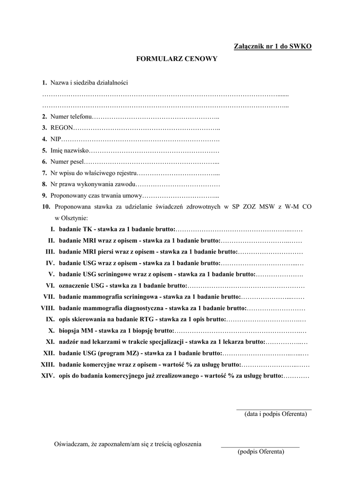 Załącznik nr 1 do SWKO FORMULARZ CENOWY 1. Nazwa i siedziba działalności ………………………………………………………………………………………………....... …………………………………………………………………………………………………... 2. Numer telefonu………………………………………………….. 3. REGON………………………………………………………….. 4. NIP………………………………………………………………. 5. Imię nazwisko…………………………………………………… 6. Numer pesel……………………………………………………... 7. Nr wpisu do właściwego rejestru………………………………... 8. Nr prawa wykonywania zawodu………………………………… 9. Proponowany czas trwania umowy……………………………... 10. Proponowana stawka za udzielanie świadczeń zdrowotnych w SP ZOZ MSW z W-M CO w Olsztynie: I. badanie TK - stawka za 1 badanie brutto:……………………………………………..…… II. badanie MRI wraz z opisem - stawka za 1 badanie brutto:…………………………..…… III. badanie MRI piersi wraz z opisem - stawka za 1 badanie brutto:………………………… IV. badanie USG wraz z opisem - stawka za 1 badanie brutto:……………………………...… V. badanie USG scriningowe wraz z opisem - stawka za 1 badanie brutto:…………………. VI. oznaczenie USG - stawka za 1 badanie brutto:……………………………………………… VII. badanie mammografia scriningowa - stawka za 1 badanie brutto:…………………...…… VIII. badanie mammografia diagnostyczna - stawka za 1 badanie brutto:……………………… IX. opis skierowania na badanie RTG - stawka za 1 opis brutto:…………………………….… X. biopsja MM - stawka za 1 biopsję brutto:………………………………………………….… XI. nadzór nad lekarzami w trakcie specjalizacji - stawka za 1 lekarza brutto:……………..… XII. badanie USG (program MZ) - stawka za 1 badanie brutto:…………………………..…...… XIII. badanie komercyjne wraz z opisem - wartość % za usługę brutto:……………………..…… XIV. opis do badania komercyjnego już zrealizowanego - wartość % za usługę brutto:………… _______________________ (data i podpis Oferenta) Oświadczam, że zapoznałem/am się z treścią ogłoszenia ________________________ (podpis Oferenta)