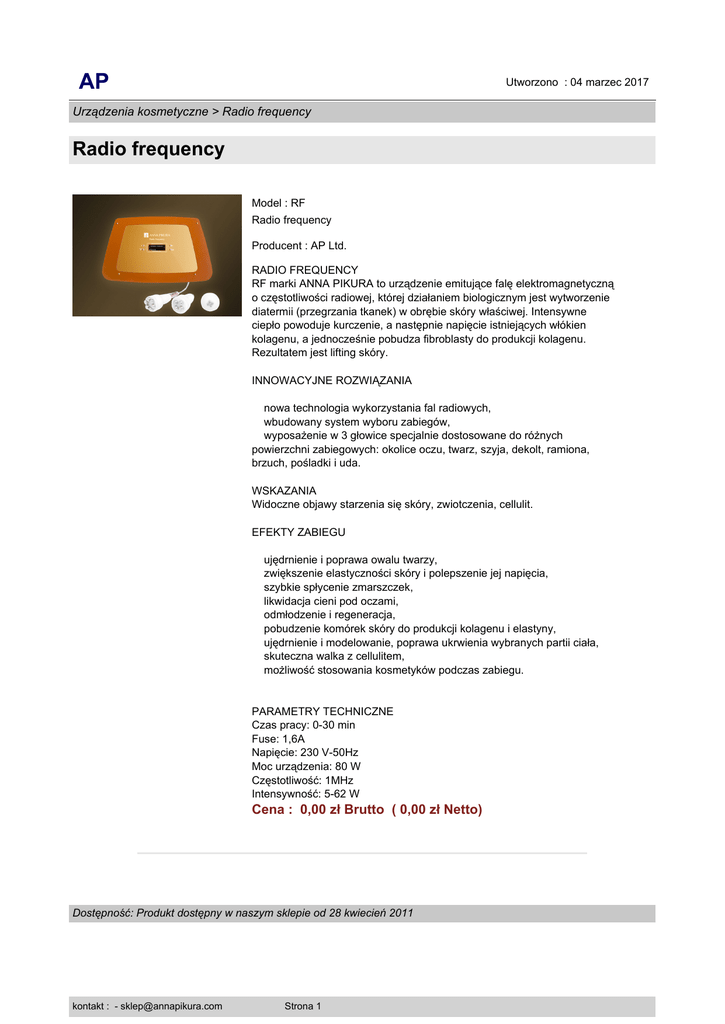 AP Utworzono : 04 marzec 2017 Urządzenia kosmetyczne > Radio frequency Radio frequency Model : RF Radio frequency Producent : AP Ltd. RADIO FREQUENCY RF marki ANNA PIKURA to urządzenie emitujące falę elektromagnetyczną o częstotliwości radiowej, której działaniem biologicznym jest wytworzenie diatermii (przegrzania tkanek) w obrębie skóry właściwej. Intensywne ciepło powoduje kurczenie, a następnie napięcie istniejących włókien kolagenu, a jednocześnie pobudza fibroblasty do produkcji kolagenu. Rezultatem jest lifting skóry. INNOWACYJNE ROZWIĄZANIA nowa technologia wykorzystania fal radiowych, wbudowany system wyboru zabiegów, wyposażenie w 3 głowice specjalnie dostosowane do różnych powierzchni zabiegowych: okolice oczu, twarz, szyja, dekolt, ramiona, brzuch, pośladki i uda. WSKAZANIA Widoczne objawy starzenia się skóry, zwiotczenia, cellulit. EFEKTY ZABIEGU ujędrnienie i poprawa owalu twarzy, zwiększenie elastyczności skóry i polepszenie jej napięcia, szybkie spłycenie zmarszczek, likwidacja cieni pod oczami, odmłodzenie i regeneracja, pobudzenie komórek skóry do produkcji kolagenu i elastyny, ujędrnienie i modelowanie, poprawa ukrwienia wybranych partii ciała, skuteczna walka z cellulitem, możliwość stosowania kosmetyków podczas zabiegu. PARAMETRY TECHNICZNE Czas pracy: 0-30 min Fuse: 1,6A Napięcie: 230 V-50Hz Moc urządzenia: 80 W Częstotliwość: 1MHz Intensywność: 5-62 W Cena : 0,00 zł Brutto ( 0,00 zł Netto) Dostępność: Produkt dostępny w naszym sklepie od 28 kwiecień 2011 kontakt : - [email protected] Strona 1