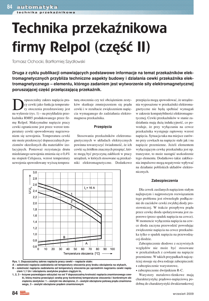 84 technika przekaünikowa Technika przekaźnikowa firmy Relpol (część II) Tomasz Ochocki, Bartłomiej Szydłowski Druga z cyklu publikacji omawiajπcych podstawowe informacje na temat przekaünikÛw elektromagnetycznych przybliøa techniczne aspekty budowy i dzia≥ania cewki przekaünika elektromagnetycznego ñ elementu, ktÛrego zadaniem jest wytworzenie si≥y elektromagnetycznej poruszajπcej czÍúÊ prze≥πczajπcπ przekaünik. D opuszczalny zakres napiÍcia pracy cewki jako funkcja temperatury otoczenia przedstawiony jest na wykresie (rys. 1) ñ na przyk≥adzie przekaünika RM85 produkowanego przez firmÍ Relpol. Maksymalne napiÍcie pracy cewki ograniczone jest przez wzrost temperatury cewki spowodowany nagrzewaniem siÍ uzwojenia. Temperatura cewki nie moøe przekroczyÊ dopuszczalnych poziomÛw okreúlonych dla materia≥Ûw izolacyjnych. Poniewaø rezystancja drutu miedzianego uzwojenia zmienia siÍ o 0,4% na stopieÒ Celsjusza, wzrost temperatury uzwojenia spowodowany wyøszπ tempera- turπ otoczenia czy teø obciπøeniem zestykÛw skutkuje zmniejszeniem siÍ prπdu cewki i w rezultacie zwiÍkszeniem napiÍcia wymaganego do zadzia≥ania elektromagnesu przekaünika. PrzepiÍcia Stosowaniu przekaünikÛw elektromagnetycznych w uk≥adach elektrycznych powinna towarzyszyÊ úwiadomoúÊ, øe ich cewki sπ ürÛd≥em znacznych przepiÍÊ, ktÛre mogπ byÊ przyczynπ zak≥ÛceÒ w pracy urzπdzeÒ, w ktÛrych stosowane sπ przekaüniki elektromagnetyczne. Dodatkowo przepiÍcia mogπ spowodowaÊ, øe urzπdzenia wyposaøone w przekaüniki elektromagnetyczne nie bÍdπ spe≥niaÊ wymagaÒ w zakresie kompatybilnoúci elektromagnetycznej. Cewki przekaünikÛw w stanie zadzia≥ania majπ duøπ indukcyjnoúÊ, co powoduje, øe przy wy≥πczaniu na cewce przekaünika wystÍpuje raptowny wzrost napiÍcia. Sytuacja taka ma miejsce zarÛwno przy cewkach na napiÍcie sta≥e jak i na napiÍcie przemienne. Jeøeli elementem wy≥πczajπcym cewkÍ przekaünika jest np. tranzystor, to moøe nastπpiÊ uszkodzenie tego elementu. Dodatkowo takie zak≥Ûcenia impulsowe mogπ negatywnie wp≥ywaÊ na dzia≥anie pobliskich uk≥adÛw elektronicznych. Zabezpieczenia Rys. 1. Dopuszczalny zakres napiÍcia pracy cewki ñ napiÍcie sta≥e: A ñ zaleønoúÊ napiÍcia zadzia≥ania od temperatury otoczenia przy braku obciπøenia na stykach, B ñ zaleønoúÊ napiÍcia zadzia≥ania od temperatury otoczenia po uprzednim nagrzaniu cewki napiÍciem 1,1 Un i obciπøeniu zestykÛw prπdem ciπg≥ym In, 1, 2, 3 ñ krzywe pozwalajπce odczytaÊ na osi Y dopuszczalnπ krotnoúÊ napiÍcia znamionowego cewki, ktÛrπ moøna przeciπøyÊ cewkÍ przy konkretnej temperaturze otoczenia i konkretnym obciπøeniu zestykÛw: 1 ñ zestyki nie obciπøone, 2 ñ zestyki obciπøone po≥owπ prπdu znamionowego, 3 ñ zestyki obciπøone prπdem znamionowym 84 Dla cewek zasilanych napiÍciem sta≥ym najlepszym i najprostszym rozwiπzaniem tego problemu jest rÛwnoleg≥e pod≥πczenie do zaciskÛw cewki zwyk≥ej diody prostowniczej. W trakcie przep≥ywu prπdu przez cewkÍ dioda spolaryzowana jest zaporowo (przez spadek napiÍcia na cewce). W momencie wy≥πczenia napiÍcia na cewce dioda zaczyna przewodziÊ powodujπc zwiÍkszenie napiÍcia na cewce przekaünika tylko o spadek napiÍcia na przewodzπcej diodzie. Zabezpieczenie diodowe z oczywistych wzglÍdÛw nie moøe byÊ stosowane w przekaünikach z cewkami na napiÍcie przemienne. W takich przypadkach najczÍúciej stosuje siÍ dwa rodzaje zabezpieczeÒ: ï zabezpieczenie warystorowe, ï zabezpieczenie dwÛjnikiem R-C. Warystory metalowo-tlenkowe majπ charakterystykÍ prπdowo-napiÍciowπ podobnπ do charakterystyki dwukierunkowej wrzesieÒ 2009 Konstrukcje przekaünikÛw Relpol Firma Relpol posiada w swojej ofercie zarÛwno przekaüniki, w ktÛrych elementy przeciwprzepiÍciowe mogπ byÊ montowane w ich wnÍtrzu (diody lub warystory), jak i gotowe modu≥y przeciwprzepiÍciowe przeznaczone do montaøu w gniazdach wtykowych. Tomasz Ochocki Bart≥omiej Szyd≥owski Autorzy sπ pracownikami firmy Relpol Relpol S.A. 68-200 Øary ul. 11 Listopada 37 tel. (68) 47 90 800 fax (68) 37 43 866 Rys. 4. Przekaünik R4 z gniazdem GZM4 oraz modu≥em przeciwprzepiÍciowym e-mail: [email protected] www.relpol.com.pl M A L W przekaünikach R2, R3, R4 z cewkami na napiÍcie sta≥e (DC) dostÍpne sπ wykonania z diodπ gaszπcπ zamontowanπ wewnπtrz przekaünika. Natomiast wewnπtrz tych przekaünikÛw nie montuje siÍ warystorÛw. Do przekaünikÛw moøna stosowaÊ gotowe modu≥y przeciwprzepiÍciowe serii M, montujπc je w gniazdach wtykowych serii GZT i GZM. DostÍpne sπ modu≥y z diodπ (cewki DC) lub z warystorem (cewki DC lub AC/DC). Przekaüniki R15 wykonywane sπ wy≥πcznie z elementami przeciwprzepiÍciowymi zamontowanymi w ich wnÍtrzu: ï z diodami gaszπcymi dla cewek na napiÍcia sta≥e (DC) ñ wersje dwu-, trzy- i czterostykowe, ï z warystorami dla cewek na napiÍcia przemienne (AC) ñ wersje dwu-, trzystykowe. W przypadku zastosowania diody gaszπcej jako elementu przeciwprzepiÍciowego zamontowanego wewnπtrz przekaünikÛw obowiπzuje ustalona biegunowoúÊ zasilania cewki: wyprowadzenie A1 Ñ+î, wyprowadzenie A2 Ñ-Ñ. Oznaczenia elementÛw przepiÍciowych zamontowanych wewnπtrz przekaünikÛw w oznaczeniu kodowym (wystÍpujπ jako wyposaøenie dodatkowe) to: D ñ dioda gaszπca, V ñ warystor. K diody Zenera. Warystor zaczyna przewodziÊ, gdy napiÍcie miÍdzy jego koÒcÛwkami przekroczy pewnπ wartoúÊ granicznπ, tym samym bocznikuje swojπ opornoúciπ wewnÍtrznπ obciπøenie indukcyjne, jakie stanowi cewka przekaünika. Maksymalna wartoúÊ przepiÍcia przy wy≥πczaniu zaleøy od napiÍcia ograniczenia warystora. Drugim sposobem ograniczenia przepiÍÊ podczas wy≥πczania cewki przekaünika jest pod≥πczenie rÛwnolegle do cewki dwÛjnika RC. Uk≥ad ten dobrze ogranicza przepiÍcia, jest tani i tylko nieznac