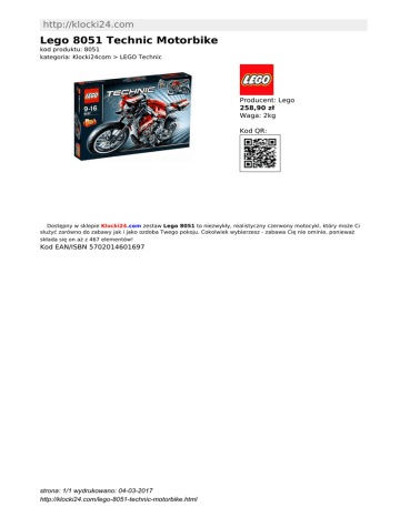 http://klocki24.com Lego 8051 Technic Motorbike kod produktu: 8051 kategoria: Klocki24com > LEGO Technic Producent: Lego 258,90 zł Waga: 2kg Kod QR: Dostępny w sklepie Klocki24.com zestaw Lego 8051 to niezwykły, realistyczny czerwony motocykl, który może Ci służyć zarówno do zabawy jak i jako ozdoba Twego pokoju. Cokolwiek wybierzesz - zabawa Cię nie ominie, ponieważ składa się on aż z 467 elementów! Kod EAN/ISBN 5702014601697 strona: 1/1 wydrukowano: 04-03-2017 http://klocki24.com/lego-8051-technic-motorbike.html