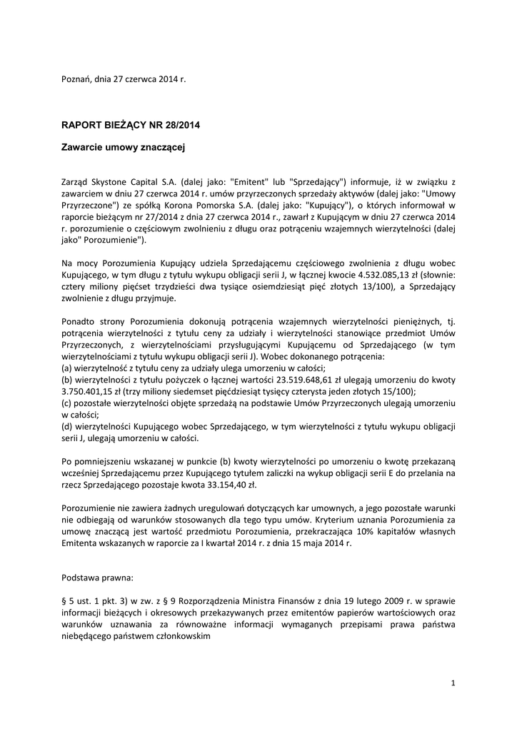 Poznań, dnia 27 czerwca 2014 r. RAPORT BIEŻĄCY NR 28/2014 Zawarcie umowy znaczącej Zarząd Skystone Capital S.A. (dalej jako: "Emitent" lub "Sprzedający") informuje, iż w związku z zawarciem w dniu 27 czerwca 2014 r. umów przyrzeczonych sprzedaży aktywów (dalej jako: "Umowy Przyrzeczone") ze spółką Korona Pomorska S.A. (dalej jako: "Kupujący"), o których informował w raporcie bieżącym nr 27/2014 z dnia 27 czerwca 2014 r., zawarł z Kupującym w dniu 27 czerwca 2014 r. porozumienie o częściowym zwolnieniu z długu oraz potrąceniu wzajemnych wierzytelności (dalej jako" Porozumienie"). Na mocy Porozumienia Kupujący udziela Sprzedającemu częściowego zwolnienia z długu wobec Kupującego, w tym długu z tytułu wykupu obligacji serii J, w łącznej kwocie 4.532.085,13 zł (słownie: cztery miliony pięćset trzydzieści dwa tysiące osiemdziesiąt pięć złotych 13/100), a Sprzedający zwolnienie z długu przyjmuje. Ponadto strony Porozumienia dokonują potrącenia wzajemnych wierzytelności pieniężnych, tj. potrącenia wierzytelności z tytułu ceny za udziały i wierzytelności stanowiące przedmiot Umów Przyrzeczonych, z wierzytelnościami przysługującymi Kupującemu od Sprzedającego (w tym wierzytelnościami z tytułu wykupu obligacji serii J). Wobec dokonanego potrącenia: (a) wierzytelność z tytułu ceny za udziały ulega umorzeniu w całości; (b) wierzytelności z tytułu pożyczek o łącznej wartości 23.519.648,61 zł ulegają umorzeniu do kwoty 3.750.401,15 zł (trzy miliony siedemset pięćdziesiąt tysięcy czterysta jeden złotych 15/100); (c) pozostałe wierzytelności objęte sprzedażą na podstawie Umów Przyrzeczonych ulegają umorzeniu w całości; (d) wierzytelności Kupującego wobec Sprzedającego, w tym wierzytelności z tytułu wykupu obligacji serii J, ulegają umorzeniu w całości. Po pomniejszeniu wskazanej w punkcie (b) kwoty wierzytelności po umorzeniu o kwotę przekazaną wcześniej Sprzedającemu przez Kupującego tytułem zaliczki na wykup obligacji serii E do przelania na rzecz Sprzedającego pozostaje kwota 33.154,40 zł. Porozumienie nie zawiera żadnych uregulowań dotyczących kar umownych, a jego pozostałe warunki nie odbiegają od warunków stosowanych dla tego typu umów. Kryterium uznania Porozumienia za umowę znaczącą jest wartość przedmiotu Porozumienia, przekraczająca 10% kapitałów własnych Emitenta wskazanych w raporcie za I kwartał 2014 r. z dnia 15 maja 2014 r. Podstawa prawna: § 5 ust. 1 pkt. 3) w zw. z § 9 Rozporządzenia Ministra Finansów z dnia 19 lutego 2009 r. w sprawie informacji bieżących i okresowych przekazywanych przez emitentów papierów wartościowych oraz warunków uznawania za równoważne informacji wymaganych przepisami prawa państwa niebędącego państwem członkowskim 1 Podpisy: Piotr Kardach Prezes Zarządu Andrzej Marciniak Wiceprezes Zarządu 2