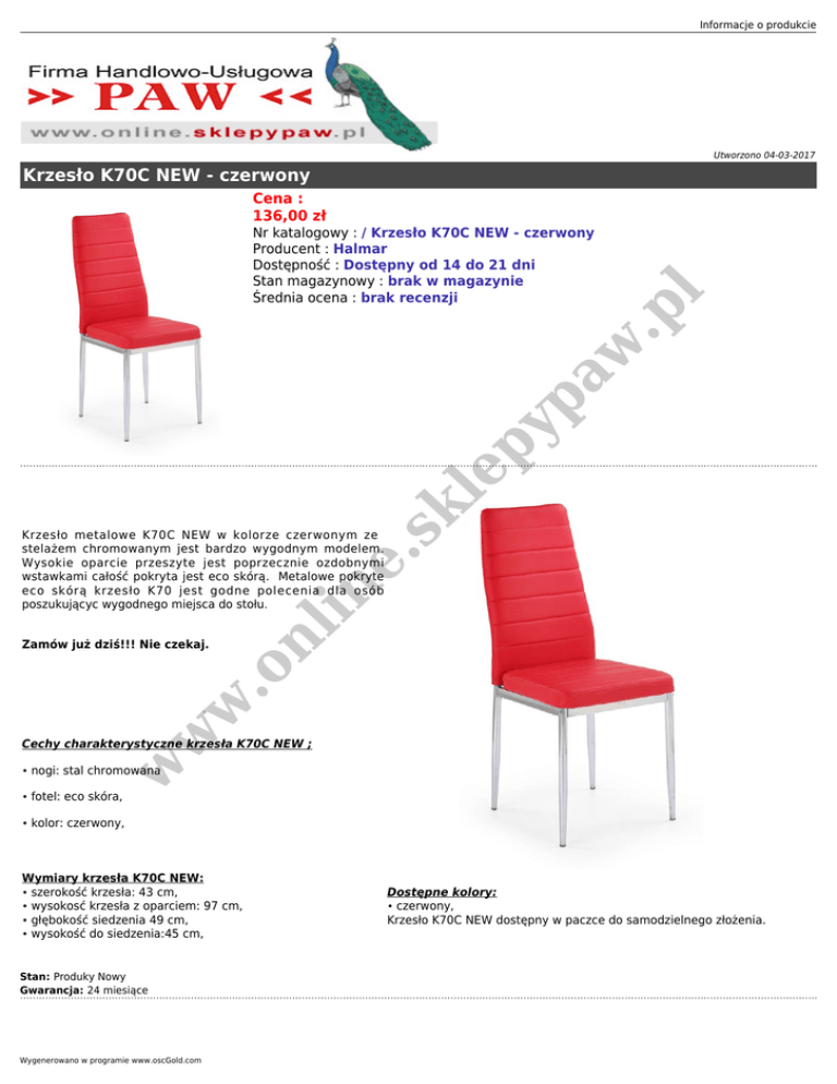 Informacje o produkcie Utworzono 04-03-2017 Krzesło K70C NEW - czerwony Cena : 136,00 zł sk le py pa w .p l Nr katalogowy : / Krzesło K70C NEW - czerwony Producent : Halmar Dostępność : Dostępny od 14 do 21 dni Stan magazynowy : brak w magazynie Średnia ocena : brak recenzji w w w .o Zamów już dziś!!! Nie czekaj. nl in e. Krzesło metalowe K70C NEW w kolorze czerwonym ze stelażem chromowanym jest bardzo wygodnym modelem. Wysokie oparcie przeszyte jest poprzecznie ozdobnymi wstawkami całość pokryta jest eco skórą. Metalowe pokryte eco skórą krzesło K70 jest godne polecenia dla osób poszukującyc wygodnego miejsca do stołu. Cechy charakterystyczne krzesła K70C NEW ; • nogi: stal chromowana • fotel: eco skóra, • kolor: czerwony, Wymiary krzesła K70C NEW: • szerokość krzesła: 43 cm, • wysokosć krzesła z oparciem: 97 cm, • głębokość siedzenia 49 cm, • wysokość do siedzenia:45 cm, Stan: Produky Nowy Gwarancja: 24 miesiące Wygenerowano w programie www.oscGold.com Dostępne kolory: • czerwony, Krzesło K70C NEW dostępny w paczce do samodzielnego złożenia.