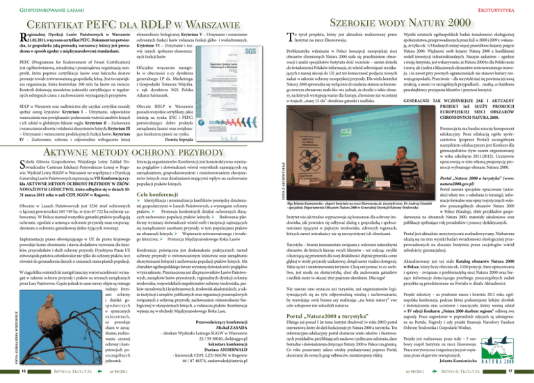Gospodarowanie lasami Ekoturystyka CERTYFIKAT PEFC DLA RDLP W WARSZAWIE R egionalnej Dyrekcji Lasów Państwowych w Warszawie 21.02.2011, wręczono certyfikat PEFC. Dokument ten potwierdza, że gospodarka jaką prowadzą warszawscy leśnicy jest prowadzona w sposób zgodny z międzynarodowymi standardami. PEFC (Programme for Endorsement of Forest Certification) jest ogólnoświatową, niezależną i pozarządową organizacją nonprofit, która poprzez certyfikacje lasów oraz łańcucha dostaw promuje trwale zrównoważoną gospodarkę leśną. Jest to największa organizacja, która kontroluje 200 mln ha lasów na świecie. Kontroli dokonują niezależne jednostki certyfikujące w regularnych odstępach czasu z zachowaniem wymaganych przepisów. RDLP w Warszawie oraz nadleśnictwa aby uzyskać certyfikat musiały spełnić szereg kryteriów: Kryterium I – Utrzymanie, odpowiednie wzmocnienie oraz powiększanie i podnoszenie wartości zasobów leśnych i ich udział w globalnym bilansie węgla; Kryterium II – Zachowanie i wzmocnienie zdrowia i witalności ekosystemów leśnych; Kryterium III – Utrzymanie i wzmocnienie produkcyjnych funkcji lasów; Kryterium IV – Zachowanie, ochrona i odpowiednie wzbogacenie leśnej Obecnie w Lasach Państwowych jest 3256 stref ochronnych o łącznej powierzchni 165 749 ha, w tym 67 722 ha ochrony całorocznej. W Polsce niemal wszystkie gatunki ptaków podlegają ochronie, zgodnie z ustawą o ochronie przyrody oraz rozporządzeniem o ochronie gatunkowej dziko żyjących zwierząt. Implementacja prawa obowiązującego w UE do prawa krajowego powoduje liczne obostrzenia i stawia dodatkowe wyzwania dla leśników, przyrodników i służb ochrony przyrody. Dyrektywa Ptasia UE zobowiązała państwa członkowskie nie tylko do ochrony ptaków, lecz również do gromadzenia danych o zmianach stanu ptasich populacji. FOTO: ALEKSANDRA WÓJTOWICZ Problematyka wdrażania w Polsce koncepcji europejskiej sieci obszarów chronionych Natura 2000 stała się przedmiotem obserwacji i analiz specjalistów Instytutu dość wcześnie – zanim dotarła do świadomości Polaków informacja, że wśród zobowiązań wynikających z naszej akcesji do UE jest też konieczność podjęcia nowych zadań w zakresie ochrony europejskiej przyrody. Dla wielu kontekst Natury 2000 sprowadza się wyłącznie do nadania statusu ochronnego nowym obszarom; mało kto wie jednak, że chodzi o takie obszary, na których występują ważne dla Europy, chronione już wcześniej w krajach „starej 15-tki” określone gatunki i siedliska. Oficjalne wręczenie nastąpiło w obecności z-cy dyrektora generalnego LP ds. Marketingu i Gospodarki Tomasza Wójcika, z rąk dyrektora SGS Polska Adama Sarnaszek. Obecnie RDLP w Warszawie posiada wszystkie certyfikaty, jakie istnieją na rynku (FSC i PEFC) potwierdzające dobre praktyki zarządzania lasami oraz zwiększające konkurencyjność na rynku. Dorota Szpojda Wyniki ostatnich ogólnopolskich badań świadomości ekologicznej społeczeństwa, przeprowadzonych przez InE w 2008 i 2009 r. wskazują, że tylko ok. 1/3 badanych mniej więcej prawidłowo kojarzy pojęcie Natura 2000. Większość osób kojarzy Naturę 2000 z konfliktami wokół inwestycji infrastrukturalnych. Naszym zadaniem – zgodnie z misją Instytutu, jest wskazywanie, że Natura 2000 to dla Polski może i nowy, ale i jeden z kluczowych elementów zrównoważonego rozwoju, i że nawet przy pewnych ograniczeniach nie stanowi bariery rozwoju gospodarki. Przeciwnie – dla turystyki stać się powinna jej nową atrakcją, a może i w szczególnych przypadkach…marką, co każdemu przedsiębiorcy przysparza klientów i przynosi korzyści. GENERALNIE TAK WCZEŚNIEJSZE JAK I AKTUALNY PROJEKT InE SŁUŻY PROMOCJI EUROPEJSKIEJ SIECI OBSZARÓW CHRONIONYCH NATURA 2000. Promocja ta ma bardzo mocny komponent edukacyjny. Poza edukacją ogółu społeczeństwa (poprzez Portal) szczególnym narzędziem edukacyjnym jest Konkurs dla gimnazjalistów (tym razem organizowany w roku szkolnym 2011/2012). Uczniowie opracowują w nim własną propozycję promocji wybranego obszaru Natura 2000. AKTYWNE METODY OCHRONY PRZYRODY zkoła Główna Gospodarstwa Wiejskiego Leśny Zakład Doświadczalny Centrum Edukacji Przyrodniczo-Leśnej w Rogowie, Wydział Leśny SGGW w Warszawie we współpracy z Dyrekcją Generalną Lasów Państwowych zapraszają na VII Konferencję z cyklu AKTYWNE METODY OCHRONY PRZYRODY W ZRÓWNOWAŻONYM LEŚNICTWIE, która odbędzie się w dniach 3031 marca 2011 roku w auli CEPL SGGW w Rogowie. W ciągu kilku ostatnich lat nastąpił znaczny wzrost oczekiwań i wymagań w zakresie ochrony przyrody i ptaków na terenach zarządzanych przez Lasy Państwowe. Często jednak te same tereny objęte są różnego rodzaju formami ochrony i działań gosp o d arc z ych o sprzecznych zaleceniach, co powoduje chaos w zarządzaniu, realizowaniu czynnej ochrony i kompetencjach poszczególnych jednostek. 16 o tytuł projektu, który jest aktualnie realizowany przez Instytut na rzecz Ekorozwoju. Biznes & Ekologia nr 98/2011 Intencją organizatorów Konferencji jest konstruktywna wymiana poglądów i doświadczeń wśród wszystkich zajmujących się zarządzaniem, gospodarowaniem i monitorowaniem ekosystemów leśnych oraz działaniami mającymi wpływ na zachowanie populacji ptaków leśnych. Cele konferencji Identyfikacja i minimalizacja konfliktów pomiędzy działaniami gospodarczymi w Lasach Państwowych, a wymogami ochrony ptaków; Promocja konkretnych działań ochronnych służących zachowaniu populacji ptaków leśnych; Budowanie platformy wymiany doświadczeń wśród osób i instytucji zajmujących się zarządzaniem zasobami przyrody, w tym populacjami ptaków na obszarach leśnych; Wspieranie zrównoważonego i trwałego leśnictwa; Promocja Międzynarodowego Roku Lasów Konferencja poświęcona jest doskonaleniu praktycznych metod ochrony przyrody w zrównoważonym leśnictwie oraz 