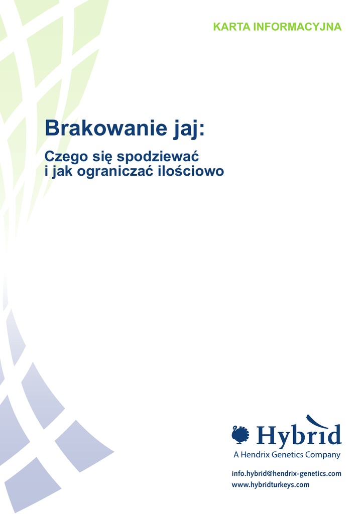 KARTA INFORMACYJNA Brakowanie jaj: Czego się spodziewać i jak ograniczać ilościowo [email protected] www.hybridturkeys.com BRAKOWANIE JAJ: CZEGO SIĘ SPODZIEWAĆ I JAK OGRANICZAĆ ILOŚCIOWO Wprowadzenie Na przestrzeni lat klienci Hybrid pytają, jakich liczb należy się spodziewać, jeśli chodzi o brakowanie jaj pochodzących od stada reprodukcyjnego indyczek Hybrid – zwłaszcza nowi klienci, którzy być może nie mieli wcześniej zbyt wielu doświadczeń ze stadami Hybrid, a chcą wyznaczyć wewnętrzne standardy czy cele w zakresie produkcji indyka i zadań dla swojego personelu. Mając to na względzie, zespół Obsługi technicznej Hybrid pozyskuje dane od klientów posiadających stada nieśne ze stad rodzicielskich (PS) Converter, którzy prowadzą statystyki ilości i typów brakowanych jaj produkowanych w ciągu okresu nieśności. W niniejszej Karcie informacyjnej znajduje się podsumowanie tych danych oraz próba scharakteryzowania przypadków i potencjalnych skutków występowania brakowanych jaj w „przeciętnym” stadzie nieśnym ze stad rodzicielskich Hybrid. Po zainicjowaniu produkcji jaj należy również pamiętać, że nie wszystkie indyczki reagują z jednakową gotowością i intensywnością. Nasza zdolność do utrzymania jednorodności stada, jeśli chodzi o te kryteria (wiek, waga i wrażliwość na światło) wpływa w olbrzymim stopniu na osiąganie satysfakcjonujących wyników w zakresie produkcji jaj w całym stadzie nieśnym. W fazie produkcji nasza zdolność do monitorowania wzorców nieśności każdej indyczki w stadzie jest naturalnie ograniczona. Z tego powodu mamy tendencję do rejestrowania danych produkcyjnych w ujęciu czasowym (według godziny zbioru, dziennie, tygodniowo itd.) oraz dla całego stada nieśnego jako jednostki zbiorczej. Zestawiając wszystkie dane, produkcja jaj danego stada indyczek PS może zostać przedstawiona w sposób graficzny tak jak na Rys. 1 poniżej. Rysunek 1. Produkcja jaj indyczek Converter Dane Produkcja jaj Rozpoczęcie produkcji jaj przez indyczkę reprodukcyjną wymaga spełnienia 3 podstawowych kryteriów. Indyczka musi osiągnąć odpowiedni WIEK dojrzałości płciowej oraz krytyczną WAGĘ CIAŁA lub masę ciała, musi być również wystawiona na działanie odpowiedniej DŁUGOŚCI DNIA świetlnego (cyklu oświetlenia), by uaktywnić fotoreceptory w mózgu pobudzające układ endokrynny i wywołujące przez to lawinę reakcji w organizmie zwierzęcia prowadzących do zainicjowania produkcji jaj. Tak jak istnieją indywidualne różnice pomiędzy indyczkami w danym stadzie reprodukcyjnym, podobnie każde stado reprodukcyjne będzie miało inne wyniki produkcyjne, ponieważ stopień koordynacji wszystkich 3 powyższych kryteriów (pod względem czasu i intensywności) będzie różnił się w zależności od stada i pory roku. KARTA INFORMACYJNA | BRAKOWANIE JAJ | 2 120 80 70 100 % produkcji jaj % Egg Production 60 80 50 60 40 30 40 20 20 10 0 0 1 3 5 7 9 11 13 15 17 19 21 23 25 Tydzień nieśności Week of lay %% produkcji jaj Egg Production Cel PJHGoal EPH W zależności od pory roku i indywidualnych wyników, stada mogą być utrzymywane w produkcji od 26 do 32 tygodni nieśności. Poziom produkcji, koszt i popyt na jaja, a także odsetek zalężenia i wylęgalności składanych jaj – wszystko to odgrywa rolę w podejmowaniu decyzji dotyczącej tego, jak długo indyczki będą składały jaja w cyklu produkcyjnym. Narastająco PJH Cum EPH Przedstawione tutaj liczby dotyczą jaj składanych w okresie 3 lat, od 2005 do końca 2007 roku. W niniejszym zestawieniu uwzględniono dane pochodzące od 10 firm z Ameryki Północnej (Stanów Zjednoczonych i Kanady), ulokowanych we wschodniej, środkowej i zachodniej części kontynentu. Obejmują one 91 stad reprodukcyjnych PS, w tym stada, które wchodziły w fazę nieśności w każdym miesiącu kalendarzowym w roku. Tak więc zestaw danych jest zróżnicowany i dosłownie reprezentuje całoroczny okres produkcji jaj na przestrzeni 3 lat. Przeciętna wielkość stada w niniejszym podsumowaniu to ponad 10 tys. indyczek reprodukcyjnych Converter z całkowitej liczby przekraczającej 900 tys. indyczek PS (ze stad rodzicielskich) w całym okresie uwzględnionym w niniejszym zestawie danych. Całkowita liczba jaj wylęgowych wyprodukowanych przez te indyczki przekracza 88 mln sztuk. BRAKOWANIE JAJ: CZEGO SIĘ SPODZIEWAĆ I JAK OGRANICZAĆ ILOŚCIOWO Brakowane jaja Produkcja jaj w większości stad opisywana jest liczbą jaj wyklutych lub nasadzanych, jednak w całkowitej liczbie jaj wyprodukowanych przez wszystkie indyczki znajduje się również pewien niewielki odsetek jaj brakowanych (nienadających się na sprzedaż czy do inkubacji). Do końca trzeciego tygodnia produkcji liczba brakowanych jaj dla stada nieśnego powinna oscylować wokół 5% całkowitej liczby jaj i spadać w ciągu kolejnych dwóch tygodni do poziomu pomiędzy 4,0 a 4,5% (Rys. 2). Jaja składające się na ten procent brakowanych sztuk mogą być podzielone na 5 różnych grup: małe, podwójne żółtko, z popękaną skorupą, gorszej jakości, pozagniazdowe. Opis i charakterystyka każdej z 5 wymienionych grup znajduje się poniżej. Rysunek 2. Kategorie brakowanych jaj by według Figure 2. Sorted Cull Eggs Weektygodnia of Lay nieśności 20 % of Total Eggs % całkowitej liczby jaj 15 10 5 0 1 3 5 7 9 11 13 15 17 19 21 23 25 Tydzień Week nieśności of lay Małe jaja Small Jaja z Double podwójnym żółtkiem Jaja z Cracked popękaną skorupą Jaja Poor gorszej jakości Jaja Floor pozagniazdowe Małe jaja Każda firma podejmuje indywidualną decyzję w zakresie parametrów wagowych jaj. Większość zintegrowanych przedsiębiorstw hodowlanych uzna 70 gram za minimalną akceptowalną wagę jaja, podczas gdy inne zakłady wylęgowe mogą „podnieść poprzeczkę” do 72 lub nawet 74 gram w celu poprawy jednorodności piskląt i zwiększenia wagi wykluwających się ptaków. Niezale