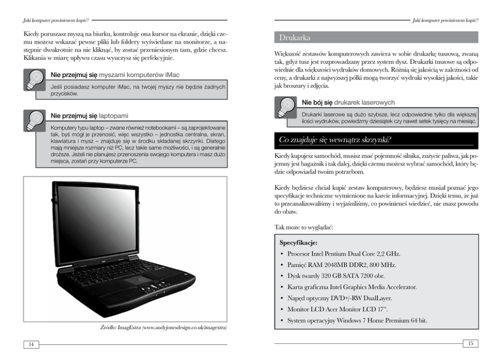Jaki komputer powinienem kupić? Jaki komputer powinienem kupić? Kiedy poruszasz myszą na biurku, kontroluje ona kursor na ekranie, dzięki czemu możesz wskazać pewne pliki lub foldery wyświetlane na monitorze, a następnie dwukrotnie na nie kliknąć, by zostać przeniesionym tam, gdzie chcesz. Klikania w miarę upływu czasu wyuczysz się perfekcyjnie. Nie przejmuj się myszami komputerów iMac Jeśli posiadasz komputer iMac, na twojej myszy nie będzie żadnych przycisków. Drukarka Większość zestawów komputerowych zawiera w sobie drukarkę tuszową, zwaną tak, gdyż tusz jest rozprowadzany przez system dysz. Drukarki tuszowe są odpowiednie dla większości wydruków domowych. Różnią się jakością w zależności od ceny, a drukarki z najwyższej półki mogą tworzyć wydruki wysokiej jakości, takie jak broszury i zdjęcia. Nie bój się drukarek laserowych Nie przejmuj się laptopami Komputery typu laptop – zwane również notebookami – są zaprojektowane tak, byś mógł je przenosić, więc wszystko – jednostka centralna, ekran, klawiatura i mysz – znajduje się w środku składanej skrzynki. Dlatego mają mniejsze rozmiary niż PC, lecz takie same możliwości, i są generalnie droższe. Jeżeli nie planujesz przenoszenia swojego komputera i masz dużo miejsca, zostań przy komputerze PC. Drukarki laserowe są dużo szybsze, lecz odpowiednie tylko dla większej ilości wydruków, powiedzmy dziesiątek czy nawet setek tysięcy na miesiąc. Co znajduje się wewnątrz skrzynki? Kiedy kupujesz samochód, musisz znać pojemność silnika, zużycie paliwa, jak pojemny jest bagażnik i tak dalej, dzięki czemu możesz wybrać samochód, który będzie odpowiadał twoim potrzebom. Kiedy będziesz chciał kupić zestaw komputerowy, będziesz musiał poznać jego specyfikacje techniczne wymienione na karcie informacyjnej. Dzięki temu, że już to przeanalizowaliśmy i wyjaśniliśmy, co powinieneś wiedzieć, nie masz powodu do obaw. Tak może to wyglądać: Specyfikacje: • Procesor Intel Pentium Dual Core 2,2 GHz. • Pamięć RAM 2048MB DDR2, 800 MHz. • Dysk twardy 320 GB SATA 7200 obr. • Karta graficzna Intel Graphics Media Accelerator. • Napęd optyczny DVD+/-RW DualLayer. • Monitor LCD Acer Monitor LCD 17”. Źródło: ImagExtra (www.andyjonesdesign.co.uk/imagextra) 14 • System operacyjny Windows 7 Home Premium 64 bit. 15