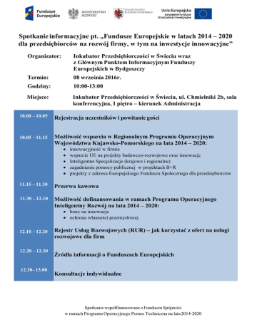 Spotkanie informacyjne pt. „Fundusze Europejskie w latach 2014 – 2020 dla przedsiębiorców na rozwój firmy, w tym na inwestycje innowacyjne” Organizator: Inkubator Przedsiębiorczości w Świeciu wraz z Głównym Punktem Informacyjnym Funduszy Europejskich w Bydgoszczy Termin: 08 września 2016r. Godziny: 10:00-13:00 Miejsce: Inkubator Przedsiębiorczości w Świeciu, ul. Chmielniki 2b, sala konferencyjna, I piętro – kierunek Administracja 10.00 – 10.05 Rejestracja uczestników i powitanie gości 10.05 – 11.15 Możliwość wsparcia w Regionalnym Programie Operacyjnym Województwa Kujawsko-Pomorskiego na lata 2014 – 2020: 11.15 – 11.30 11.30 – 12.10 innowacyjność w firmie wsparcie UE na projekty badawczo-rozwojowe oraz innowacje Inteligentne Specjalizacje (krajowe i regionalne) zagadnienie pomocy publicznej w projektach B+R projekty z zakresu Europejskiego Funduszu Społecznego dla przedsiębiorców Przerwa kawowa Możliwość dofinansowania w ramach Programu Operacyjnego Inteligentny Rozwój na lata 2014 – 2020: bony na innowacje ochrona własności przemysłowej 12.10 – 12.20 12.20 – 12.30 12.30– 13.00 Rejestr Usług Rozwojowych (RUR) – jak korzystać z ofert na usługi rozwojowe dla firm Źródła informacji o Funduszach Europejskich Konsultacje indywidualne Spotkanie współfinansowane z Funduszu Spójności w ramach Programu Operacyjnego Pomoc Techniczna na lata 2014-2020
