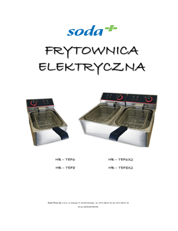 FRYTOWNICA ELEKTRYCZNA HB – TEF6 HB – TEF6X2 HB – TEF8 HB – TEF8X2 Soda Pluss Sp. z o.o. ul. Hufcowa 17, 52-244 Wrocław, tel:. (071) 356 91 33, fax: (071) 356 91 34 Nr rej. GIOŚ E0010912W Dziękujemy paostwu za zakupienie naszego produktu. Przed pierwszym użyciem należy dokładnie zapoznad się z niniejszą instrukcją obsługi. Instrukcję należy przechowywad w bezpiecznym oraz dostępnym dla każdego użytkownika miejscu. Poprawna konserwacja oraz użytkowanie urządzenia umożliwi optymalne wykorzystanie jego funkcji. WSKAZÓWKI BEZPIECZEOSTWA Urządzenie należy zawsze ustawiad na równym, stabilnym podłożu. Jedynie autoryzowany serwisant lub wykwalifikowany technik powinien zajmowad się instalowaniem oraz naprawami, w przypadku wystąpienia usterek. Nie wolno samodzielnie demontowad urządzenia. Poziom oleju NIGDY nie powinien wykraczad poza wskaźniki MIN i MAX. Niezastosowanie się do niniejszego zalecenia może spowodowad pożar. Do smażenia należy używad wyłącznie olejów jadalnych. Przed umieszczeniem żywności we frytkownicy należy je bardzo dokładnie osuszyd aby zapobiec spienieniu się i pryskaniu gorącego oleju. Należy regularnie wymieniad olej. Im bardziej zużyty olej tym większe prawdopodobieostwo jego samozapłonu. ZABRANIA SIĘ przykrywania pojemnika na fryturę podczas smażenia. ZABRANIA SIĘ zanurzania urządzenia w wodzie. Niektóre powierzchnie nagrzewają się podczas pracy – należy zachowad ostrożnośd podczas korzystania z urządzenia. Urządzenie należy ZAWSZE wyłączyd oraz odłączyd kabel zasilający z sieci, gdy nie jest używane. URZĄDZENIE NADAJE SIĘ TYLKO DO UŻYTKU W POMIESZCZENIACH. Urządzenie może byd obsługiwane jedynie zgodnie z niniejszą instrukcją oraz przez osoby do tego przygotowane. ZABRANIA SIĘ obsługi urządzenia przez dzieci. Opakowanie należy przechowywad w miejscu niedostępnym dla dzieci. W przypadku uszkodzenia kabla sieciowego, musi on byd niezwłocznie wymieniony przez autoryzowanego serwisanta lub wykwalifikowanego technika, w celu uniknięcia porażenia prądem. OPIS PRODUKTÓW HB – TEF6 – Frytkownica pojedyncza 6 l HB – TEF8 – Frytkownica pojedyncza 8 l HB – TEF6 -2- Frytkownica podwójna 6l HB – TEF8 -2- Frytkownica podwójna 8l ZAWARTOŚD OPAKOWANIA Opakowanie zawiera: - Frytkownicę - Kosz z uchwytem - Pokrywę - Instrukcję obsługi OSTRZEŻENIE! Nie należy stawiad łatwopalnych substancji, gazu lub innych niebezpiecznych przedmiotów w pobliżu urządzenia. Soda Pluss Sp. z o.o. ul. Hufcowa 17, 52-244 Wrocław, tel:. (071) 356 91 33, fax: (071) 356 91 34 Nr rej. GIOŚ E0010912W 2 PANEL KONTROLNY DANE TECHNICZNE Nazwa Model Napięcie Moc Liczba zbiorników na olej Rozmiar zbiornika na olej (mm) Objętośd Liczba koszy Rozmiar kosza Wymiary(mm) Długośd uchwytu (mm) Waga Frytownica pojedyncza JS-4L 220~240,50/60Hz 2000W Nazwa Model Napięcie Moc Liczba zbiorników na olej Rozmiar zbiornika na olej (mm) Objętośd Liczba koszy Rozmiar kosza Wymiary(mm) Długośd uchwytu (mm) Waga Frytownica podwójna JS-4L-2 220~240,50/60Hz 2×2000W JS-6L 220~240V,50/60Hz 2500W JS-8L 220~240V,50/60Hz 3250W JS-11L 220~240V,50/60Hz 3500W 1 1 1 1 185×270×175 240×300×150 240×300×200 300×325×200 4(L) 1 140×210×125 220×400×315 6(L) 1 185×240×100 265×430×290 8(L) 1 185×240×140 265×430×340 11(L) 1 200×270×140 325×460×340 240 240 240 240 5.5kg 6kg 7.2kg 8.1kg JS-6L-2 220~240V,50/60Hz 2×2500W JS-8L-2 220~240V,50/60Hz 2×3250W JS-11L-2 220~240V,50/60Hz 2×3500W 2 2 2 2 185×270×175 240×300×150 240×300×200 300×325×200 2×4(L) 2 140×210×125 220×400×315 2×6(L) 2 185×240×100 265×430×290 2×8(L) 2 185×240×140 265×430×340 2×11(L) 2 200×270×140 325×460×340 240 240 240 240 10.2kg 11.1kg 13.1kg 14.6kg UWAGA! ILOŚD SMAŻONYCH POTRAW W JEDNYM MOMENCIE NIE POWINNA PRZEKROCZYD WARTOŚCI PODANYCH W PONIŻSZEJ TABELCE JS-4L/4L-2 JS-6L/6L-2 JS-8L/8L-2 JS-11L/11L-2 0.6Kg/POJEMNIK 0.9Kg/POJEMNIK 1.2Kg/POJEMNIK 1.6Kg/POJEMNIK Soda Pluss Sp. z o.o. ul. Hufcowa 17, 52-244 Wrocław, tel:. (071) 356 91 33, fax: (071) 356 91 34 Nr rej. GIOŚ E0010912W 3 UWAGA! 1. Ilośd potraw w zbiorniku nie może przekraczad powyższych wartości aby uniknąd przelania się oleju ze zbiornika. 2. Potrawy przeznaczone do smażenia nie powinny byd wilgotne , ponieważ może to spowodowad rozpryskiwanie oleju na zewnątrz. INSTALACJA PANELU KONTROLNEGO / GRZAŁEK W celu ułatwienia czyszczenia urządzenia spirala grzejna z panelem kontrolnym zostały wykonane jako oddzielne elementy, odłączane od całości urządzenia. Aby je zamontowad do frytkownicy należy: 1. 2. 3. Wsunąd zaczepy znajdujące się w tylniej części obudowy panelu kontrolnego w uszy znajdujące się w tylnej części obudowy urządzenia. Upewnid się, że wyłącznik bezpieczeostwa umieszczony na spodzie panelu kontrolnego, znajduje się w odpowiedniej pozycji w stosunku do otworów urządzenia. Umieścid obudowę panelu na urządzeniu, upewniając się, ze został on poprawnie zamontowany. OBSŁUGA URZĄDZENIA 1. 2. 3. 4. 5. 6. 7. 8. 9. 10. 11. 12. 13. 14. 15. Po prawidłowym rozpakowaniu i usytuowaniu urządzenia należy włożyd wtyczkę zasilającą do gniazda sieciowego. Zapali się lampka zielona, która zasygnalizuje gotowośd urządzenia do użycia. Następnie należy wypełnid pojemnik na fryturę odpowiednim olejem spożywczym. Na panelu sterowania należy ustawid żądaną temperaturę – zapali się kontrolka pomaraoczowa- sygnalizująca włączenie grzałki. Zgaśnięcie pomaraoczowej kontrolki oznacza, że urządzenie uzyskało żądaną temperaturę. Należy umieścid potrawę w koszyku i zanurzyd koszyk w oleju. Jeśli temperatura grzałki nadmiernie wzrośnie bezpiecznik odetnie zasilanie. W momencie gdy temperatura zacznie spadad grzałka ponownie się włączy – zaświeci się kontrolka pomaraoczowa i urządzenie będzie kontynuowad pracę. W trakcie smażenia grzałka wielokrotnie włącza się i 