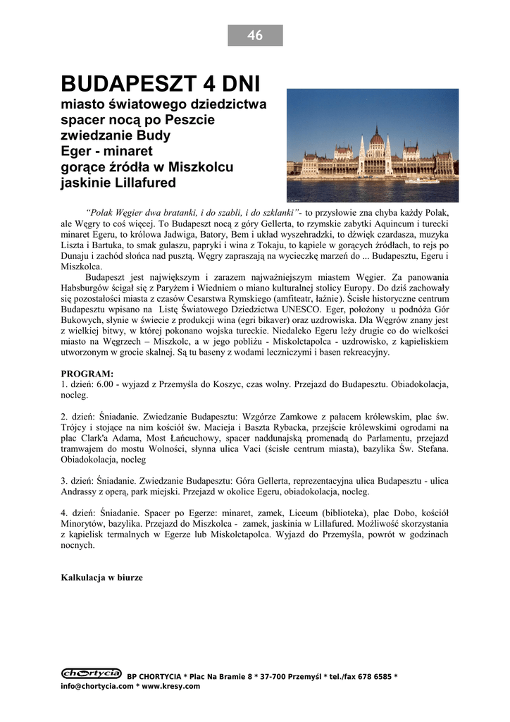 46 BUDAPESZT 4 DNI miasto światowego dziedzictwa spacer nocą po Peszcie zwiedzanie Budy Eger - minaret gorące źródła w Miszkolcu jaskinie Lillafured “Polak Węgier dwa bratanki, i do szabli, i do szklanki”- to przysłowie zna chyba każdy Polak, ale Węgry to coś więcej. To Budapeszt nocą z góry Gellerta, to rzymskie zabytki Aquincum i turecki minaret Egeru, to królowa Jadwiga, Batory, Bem i układ wyszehradzki, to dźwięk czardasza, muzyka Liszta i Bartuka, to smak gulaszu, papryki i wina z Tokaju, to kąpiele w gorących źródłach, to rejs po Dunaju i zachód słońca nad pusztą. Węgry zapraszają na wycieczkę marzeń do ... Budapesztu, Egeru i Miszkolca. Budapeszt jest największym i zarazem najważniejszym miastem Węgier. Za panowania Habsburgów ścigał się z Paryżem i Wiedniem o miano kulturalnej stolicy Europy. Do dziś zachowały się pozostałości miasta z czasów Cesarstwa Rymskiego (amfiteatr, łaźnie). Ścisłe historyczne centrum Budapesztu wpisano na Listę Światowego Dziedzictwa UNESCO. Eger, położony u podnóża Gór Bukowych, słynie w świecie z produkcji wina (egri bikaver) oraz uzdrowiska. Dla Węgrów znany jest z wielkiej bitwy, w której pokonano wojska tureckie. Niedaleko Egeru leży drugie co do wielkości miasto na Węgrzech – Miszkolc, a w jego pobliżu - Miskolctapolca - uzdrowisko, z kąpieliskiem utworzonym w grocie skalnej. Są tu baseny z wodami leczniczymi i basen rekreacyjny. PROGRAM: 1. dzień: 6.00 - wyjazd z Przemyśla do Koszyc, czas wolny. Przejazd do Budapesztu. Obiadokolacja, nocleg. 2. dzień: Śniadanie. Zwiedzanie Budapesztu: Wzgórze Zamkowe z pałacem królewskim, plac św. Trójcy i stojące na nim kościół św. Macieja i Baszta Rybacka, przejście królewskimi ogrodami na plac Clark'a Adama, Most Łańcuchowy, spacer naddunajską promenadą do Parlamentu, przejazd tramwajem do mostu Wolności, słynna ulica Vaci (ścisłe centrum miasta), bazylika Św. Stefana. Obiadokolacja, nocleg 3. dzień: Śniadanie. Zwiedzanie Budapesztu: Góra Gellerta, reprezentacyjna ulica Budapesztu - ulica Andrassy z operą, park miejski. Przejazd w okolice Egeru, obiadokolacja, nocleg. 4. dzień: Śniadanie. Spacer po Egerze: minaret, zamek, Liceum (biblioteka), plac Dobo, kościół Minorytów, bazylika. Przejazd do Miszkolca - zamek, jaskinia w Lillafured. Możliwość skorzystania z kąpielisk termalnych w Egerze lub Miskolctapolca. Wyjazd do Przemyśla, powrót w godzinach nocnych. Kalkulacja w biurze BP CHORTYCIA * Plac Na Bramie 8 * 37-700 Przemyśl * tel./fax 678 6585 * [email protected] * www.kresy.com