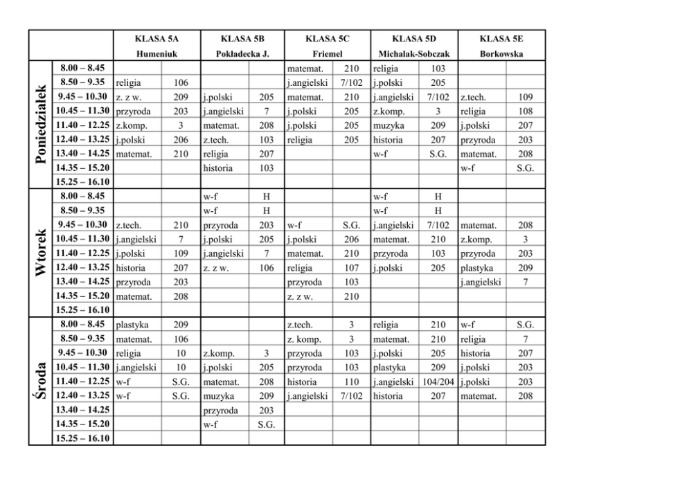 Poniedziałek Wtorek Środa 8.00 – 8.45 8.50 – 9.35 9.45 – 10.30 10.45 – 11.30 11.40 – 12.25 12.40 – 13.25 13.40 – 14.25 14.35 – 15.20 15.25 – 16.10 8.00 – 8.45 8.50 – 9.35 9.45 – 10.30 10.45 – 11.30 11.40 – 12.25 12.40 – 13.25 13.40 – 14.25 14.35 – 15.20 15.25 – 16.10 8.00 – 8.45 8.50 – 9.35 9.45 – 10.30 10.45 – 11.30 11.40 – 12.25 12.40 – 13.25 13.40 – 14.25 14.35 – 15.20 15.25 – 16.10 KLASA 5A KLASA 5B KLASA 5C KLASA 5D KLASA 5E Humeniuk Pokładecka J. Friemel Michalak-Sobczak Borkowska religia z. z w. przyroda z.komp. j.polski matemat. 106 209 203 3 206 210 z.tech. j.angielski j.polski historia przyroda matemat. 210 7 109 207 203 208 plastyka matemat. religia j.angielski w-f w-f 209 106 10 10 S.G. S.G. j.polski j.angielski matemat. z.tech. religia historia 205 7 208 103 207 103 w-f w-f przyroda j.polski j.angielski z. z w. H H 203 205 7 106 z.komp. j.polski matemat. muzyka przyroda w-f 3 205 208 209 203 S.G. matemat. j.angielski matemat. j.polski j.polski religia 210 7/102 210 205 205 205 w-f j.polski matemat. religia przyroda z. z w. S.G. 206 210 107 103 210 z.tech. z. komp. przyroda przyroda historia j.angielski 3 3 103 103 110 7/102 religia j.polski j.angielski z.komp. muzyka historia w-f 103 205 7/102 3 209 207 S.G. w-f w-f j.angielski matemat. przyroda j.polski H H 7/102 210 103 205 z.tech. religia j.polski przyroda matemat. w-f 109 108 207 203 208 S.G. matemat. z.komp. przyroda plastyka j.angielski 208 3 203 209 7 religia 210 w-f matemat. 210 religia j.polski 205 historia plastyka 209 j.polski j.angielski 104/204 j.polski historia 207 matemat. S.G. 7 207 203 203 208 Czwartek Piątek 8.00 – 8.45 8.50 – 9.35 9.45 – 10.30 10.45 – 11.30 11.40 – 12.25 12.40 – 13.25 13.40 – 14.25 14.35 – 15.20 15.25 – 16.10 16.15 – 17.00 8.00 – 8.45 8.50 – 9.35 9.45 – 10.30 10.45 – 11.30 11.40 – 12.25 12.40 – 13.25 13.40 – 14.25 14.35 – 15.20 15.25 – 16.10 16.15 – 17.00 j.polski j.polski w-f matemat. przyroda przyroda 206 206 S.G. 210 203 203 j.polski matemat. matemat. plastyka 107 208 208 208 j.polski 205 z.tech. j.angielski 104/204 przyroda historia 207 przyroda w-f B j.polski w-f B j.polski z. z w. w-f j.angielski historia muzyka j.polski S.G. 210 207 209 208 j.angielski historia przyroda przyroda j.polski religia w-f 7 207 203 203 205 209 S.G. muzyka j.polski w-f przyroda matemat. plastyka 209 205 S.G. 103 210 207 w-f przyroda matemat. matemat. 3 103 103 205 205 205 S.G. 103 210 210 muzyka j.angielski z. z w. j.polski w-f w-f 209 7 3 206 S.G. S.G. matemat. j.polski j.angielski historia przyroda przyroda 208 203 7 205 203 203