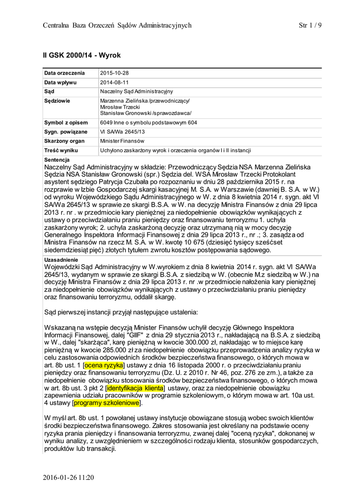 Centralna Baza Orzeczeń Sądów Administracyjnych Str 1 / 9 II GSK 2000/14 - Wyrok Data orzeczenia 2015-10-28 Data wpływu 2014-08-11 Sąd Naczelny Sąd Administracyjny Sędziowie Marzenna Zielińska /przewodniczący/ Mirosław Trzecki Stanisław Gronowski /sprawozdawca/ Symbol z opisem 6049 Inne o symbolu podstawowym 604 Sygn. powiązane VI SA/Wa 2645/13 Skarżony organ Minister Finansów Treść wyniku Uchylono zaskarżony wyrok i orzeczenia organów I i II instancji Sentencja Naczelny Sąd Administracyjny w składzie: Przewodniczący Sędzia NSA Marzenna Zielińska Sędzia NSA Stanisław Gronowski (spr.) Sędzia del. WSA Mirosław Trzecki Protokolant asystent sędziego Patrycja Czubała po rozpoznaniu w dniu 28 października 2015 r. na rozprawie w Izbie Gospodarczej skargi kasacyjnej M. S.A. w Warszawie (dawniej B. S.A. w W.) od wyroku Wojewódzkiego Sądu Administracyjnego w W. z dnia 8 kwietnia 2014 r. sygn. akt VI SA/Wa 2645/13 w sprawie ze skargi B.S.A. w W. na decyzję Ministra Finansów z dnia 29 lipca 2013 r. nr . w przedmiocie kary pieniężnej za niedopełnienie obowiązków wynikających z ustawy o przeciwdziałaniu praniu pieniędzy oraz finansowaniu terroryzmu 1. uchyla zaskarżony wyrok; 2. uchyla zaskarżoną decyzję oraz utrzymaną nią w mocy decyzję Generalnego Inspektora Informacji Finansowej z dnia 29 lipca 2013 r., nr .; 3. zasądz a od Ministra Finansów na rzecz M. S.A. w W. kwotę 10 675 (dziesięć tysięcy sześćset siedemdziesiąt pięć) złotych tytułem zwrotu kosztów postępowania sądowego. Uzasadnienie Wojewódzki Sąd Administracyjny w W.wyrokiem z dnia 8 kwietnia 2014 r. sygn. akt VI SA/Wa 2645/13, wydanym w sprawie ze skargi B.S.A. z siedzibą w W. (obecnie M.z siedzibą w W.) na decyzję Ministra Finansów z dnia 29 lipca 2013 r. nr .w przedmiocie nałożenia kary pieniężnej za niedopełnienie obowiązków wynikających z ustawy o przeciwdziałaniu praniu pieniędzy oraz finansowaniu terroryzmu, oddalił skargę. Sąd pierwszej instancji przyjął następujące ustalenia: Wskazaną na wstępie decyzją Minister Finansów uchylił decyzję Głównego Inspektora Informacji Finansowej, dalej "GIIF" z dnia 29 stycznia 2013 r., nakładającą na B.S.A. z siedzibą w W., dalej "skarżąca", karę pieniężną w kwocie 300.000 zł, nakładając w to miejsce karę pieniężną w kwocie 285.000 zł za niedopełnienie obowiązku przeprowadzenia analizy ryzyka w celu zastosowania odpowiednich środków bezpieczeństwa finansowego, o których mowa w art. 8b ust. 1 [ocena ryzyka] ustawy z dnia 16 listopada 2000 r. o przeciwdziałaniu praniu pieniędzy oraz finansowaniu terroryzmu (Dz. U. z 2010 r. Nr 46, poz. 276 ze zm.), a także za niedopełnienie obowiązku stosowania środków bezpieczeństwa finansowego, o których mowa w art. 8b ust. 3 pkt 2 [identyfikacja klienta] ustawy, oraz za niedopełnienie obowiązku zapewnienia udziału pracowników w programie szkoleniowym, o którym mowa w art. 10a ust. 4 ustawy [programy szkoleniowe]. W myśl art. 8b ust. 1 powołanej ustawy instytucje obowiązane stosują wobec swoich klientów środki bezpieczeństwa finansowego. Zakres stosowania jest określany na podstawie oceny ryzyka prania pieniędzy i finansowania terroryzmu, zwanej dalej "oceną ryzyka", dokonanej w wyniku analizy, z uwzględnieniem w szczególności rodzaju klienta, stosunków gospodarczych, produktów lub transakcji. 2016-01-26 11:20 Centralna Baza Orzeczeń Sądów Administracyjnych Str 2 / 9 Zgodnie z art. 8b ust. 3 pkt 2 ustawy środki bezpieczeństwa finansowego, o których mowa w ust. 1, polegają na podejmowaniu czynności, z zachowaniem należytej staranności, w celu identyfikacji beneficjenta rzeczywistego i stosowaniu uzależnionych od oceny ryzyka odpowiednich środków weryfikacji jego tożsamości w celu uzyskania przez instytucję obowiązaną danych dotyczących tożsamości beneficjenta rzeczywistego, w tym ustalaniu struktury własności i zależności klienta. Stosownie do art. 10a ust. 4 ustawy instytucje obowiązane zapewniają udział pracowników, wykonujących obowiązki związane z przeciwdziałaniem praniu pieniędzy i finansowaniu terroryzmu w instytucji obowiązanej, w programach szkoleniowych dotyczących tych obowiązków. Ponadto podstawę materialnoprawną decyzji stanowiły przepisy art. 34a pkt 2, 3 i 5 oraz art. 34c ust. 1 i 2 powołanej ustawy. W świetle art. 34 a pkt 2, 3 i 5 ustawy instytucja obowiązana, z wyłączeniem Narodowego Banku Polskiego, która: 2) nie dopełnia obowiązku przeprowadzenia analizy ryzyka w celu zastosowania odpowiednich środków bezpieczeństwa finansowego; 3) nie dopełnia obowiązku stosowania środków bezpieczeństwa finansowego; 5) nie dopełnia obowiązku zapewnienia udziału pracowników w programie szkoleniowym, - podlega karze pieniężnej. Stosownie do art. 34c ustawy karę pieniężną nakłada GIIF w drodze decyzji, w wysokości nie większej niż 750.000 zł, a w razie naruszenia, o którym mowa w art. 34a pkt 5 - w wysokości nie większej niż 100.000 zł (ust. 1). Ustalając wysokość kary pieniężnej, GIIF uwzględnia rodzaj i zakres naruszenia, dotychczasową działalność instytucji obowiązanej oraz jej możliwości finansowe (ust. 2). Podstawę faktyczną decyzji nakładającej karę pieniężną stanowiły wyniki kontroli przeprowadzonej dniach od 27 do 30 marca 2012 r. z upoważnienia GIIF w B.S.A. z siedzibą w W., dalej "skarżąca", obejmującej okres od dnia 22 października 2009 r. do dnia 16 marca 2012 r. Odnosząc się do zarzutów skarżącej co do bezpodstawności nałożenia kary pieniężnej przewidzianej w art. 34a pkt 2 powołanej ustawy za niedopełnienie obowiązku przeprowadzenia analizy ryzyka w celu zastosowania odpowiednich środków bezpieczeństwa finansowego, o którym mowa w art. 8b ust. 1 tej ustawy, jak zauważył Minister Finansów, ustawodawca celowo nie określił formy przeprowadzania analizy oceny ryzyka, pozostawiając dec
