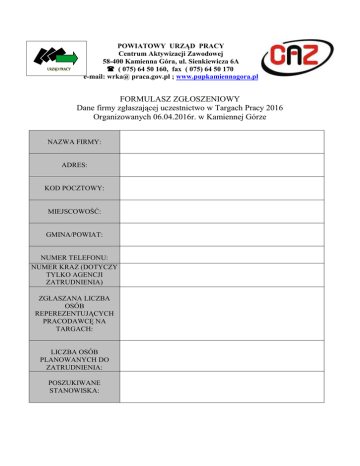 POWIATOWY URZĄD PRACY Centrum Aktywizacji Zawodowej 58-400 Kamienna Góra, ul. Sienkiewicza 6A ( 075) 64 50 160, fax ( 075) 64 50 170 e-mail: wrka@ praca.gov.pl ; www.pupkamiennagora.pl FORMULASZ ZGŁOSZENIOWY Dane firmy zgłaszającej uczestnictwo w Targach Pracy 2016 Organizowanych 06.04.2016r. w Kamiennej Górze NAZWA FIRMY: ADRES: KOD POCZTOWY: MIEJSCOWOŚĆ: GMINA/POWIAT: NUMER TELEFONU: NUMER KRAZ (DOTYCZY TYLKO AGENCJI ZATRUDNIENIA) ZGŁASZANA LICZBA OSÓB REPEREZENTUJĄCYCH PRACODAWCĘ NA TARGACH: LICZBA OSÓB PLANOWANYCH DO ZATRUDNIENIA: POSZUKIWANE STANOWISKA: Informacje organizacyjne: 1. Uczestnictwo w Targach Pracy organizowanych przez Powiatowy Urząd Pracy w Kamiennej Górze jest całkowicie bezpłatne 2. Prosimy o pozostanie na stanowiskach do godziny 14.00 3. Miejsce targów: Hala Sportowa Zespołu Szkół Zawodowych i Ogólnokształcących w Kamiennej Górze ul. Traugutta 2 4. Kontakt: Tel. 756450169; 756450160; 601741315 e-mail: [email protected]; [email protected]