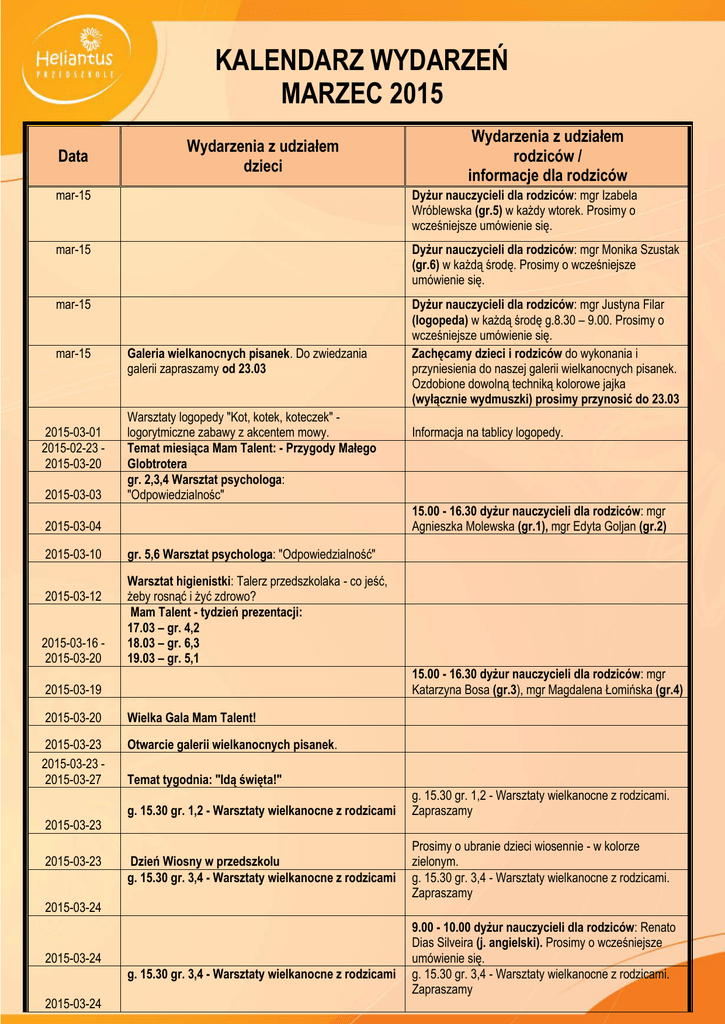 KALENDARZ WYDARZEŃ MARZEC 2015 Data Wydarzenia z udziałem dzieci Wydarzenia z udziałem rodziców / informacje dla rodziców mar-15 Dyżur nauczycieli dla rodziców: mgr Izabela Wróblewska (gr.5) w każdy wtorek. Prosimy o wcześniejsze umówienie się. mar-15 Dyżur nauczycieli dla rodziców: mgr Monika Szustak (gr.6) w każdą środę. Prosimy o wcześniejsze umówienie się. mar-15 Dyżur nauczycieli dla rodziców: mgr Justyna Filar (logopeda) w każdą środę g.8.30 – 9.00. Prosimy o wcześniejsze umówienie się. Zachęcamy dzieci i rodziców do wykonania i przyniesienia do naszej galerii wielkanocnych pisanek. Ozdobione dowolną techniką kolorowe jajka (wyłącznie wydmuszki) prosimy przynosić do 23.03 mar-15 2015-03-01 2015-02-23 2015-03-20 2015-03-03 Galeria wielkanocnych pisanek. Do zwiedzania galerii zapraszamy od 23.03 Warsztaty logopedy "Kot, kotek, koteczek" logorytmiczne zabawy z akcentem mowy. Temat miesiąca Mam Talent: - Przygody Małego Globtrotera gr. 2,3,4 Warsztat psychologa: "Odpowiedzialnośc" 15.00 - 16.30 dyżur nauczycieli dla rodziców: mgr Agnieszka Molewska (gr.1), mgr Edyta Goljan (gr.2) 2015-03-04 2015-03-10 2015-03-12 2015-03-16 2015-03-20 gr. 5,6 Warsztat psychologa: "Odpowiedzialność" Warsztat higienistki: Talerz przedszkolaka - co jeść, żeby rosnąć i żyć zdrowo? Mam Talent - tydzień prezentacji: 17.03 – gr. 4,2 18.03 – gr. 6,3 19.03 – gr. 5,1 15.00 - 16.30 dyżur nauczycieli dla rodziców: mgr Katarzyna Bosa (gr.3), mgr Magdalena Łomińska (gr.4) 2015-03-19 2015-03-20 Wielka Gala Mam Talent! 2015-03-23 2015-03-23 2015-03-27 Otwarcie galerii wielkanocnych pisanek. 2015-03-23 2015-03-23 Temat tygodnia: "Idą święta!" g. 15.30 gr. 1,2 - Warsztaty wielkanocne z rodzicami Dzień Wiosny w przedszkolu g. 15.30 gr. 3,4 - Warsztaty wielkanocne z rodzicami 2015-03-24 2015-03-24 g. 15.30 gr. 3,4 - Warsztaty wielkanocne z rodzicami 2015-03-24 Informacja na tablicy logopedy. g. 15.30 gr. 1,2 - Warsztaty wielkanocne z rodzicami. Zapraszamy Prosimy o ubranie dzieci wiosennie - w kolorze zielonym. g. 15.30 gr. 3,4 - Warsztaty wielkanocne z rodzicami. Zapraszamy 9.00 - 10.00 dyżur nauczycieli dla rodziców: Renato Dias Silveira (j. angielski). Prosimy o wcześniejsze umówienie się. g. 15.30 gr. 3,4 - Warsztaty wielkanocne z rodzicami. Zapraszamy 2015-03-25 2015-03-27 gr. 2,3,4 wyjazd do Teatru Lalka "Pani Kreseczka" g. 15.30 gr. 5,6 – Warsztaty wielkanocne z rodzicami. Zapraszamy. Śniadanie dla gr.2,3,4 g. 815. Wyjazd g. 9.00. Prosimy rodziców o podpisywanie zgody na udział dziecka w wycieczce. 2015-03-30 Śniadanie Wielkanocne Prosimy o ubranie dzieci w strój odświętny. g. 15.30 gr. 5,6 – Warsztaty wielkanocne z rodzicami