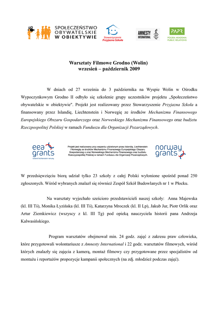 Warsztaty Filmowe Grodno (Wolin) wrzesień – październik 2009 W dniach od 27 września do 3 października na Wyspie Wolin w Ośrodku Wypoczynkowym Grodno II odbyło się szkolenie grupy uczestników projektu „Społeczeństwo obywatelskie w obiektywie". Projekt jest realizowany przez Stowarzyszenie Przyjazna Szkoła a finansowany przez Islandię, Liechtenstein i Norwegię ze środków Mechanizmu Finansowego Europejskiego Obszaru Gospodarczego oraz Norweskiego Mechanizmu Finansowego oraz budżetu Rzeczpospolitej Polskiej w ramach Funduszu dla Organizacji Pozarządowych. W przedsięwzięciu biorą udział tylko 23 szkoły z całej Polski wyłonione spośród ponad 250 zgłoszonych. Wśród wybranych znalazł się również Zespół Szkół Budowlanych nr 1 w Płocku. Na warsztaty wyjechało sześcioro przedstawicieli naszej szkoły: Anna Majewska (kl. III Tś), Monika Łyzińska (kl. III Tś), Katarzyna Mroczek (kl. II Lp), Jakub Jur, Piotr Orlik oraz Artur Ziemkiewicz (wszyscy z kl. III Tg) pod opieką nauczyciela historii pana Andrzeja Kalwasińskiego. Program warsztatów obejmował min. 24 godz. zajęć z zakresu praw człowieka, które przygotowali wolontariusze z Amnesty International i 22 godz. warsztatów filmowych, wśród których znalazły się zajęcia z kamerą, montaż filmowy czy przygotowane przez specjalistów od montażu i reportażów propozycje kampanii społecznych (na zdj. młodzież podczas zajęć). Całość zajęć miała 2 cele: przygotować do dalszej samodzielnej pracy nad reportażem, oraz zintegrowanie młodzieży z województw: mazowieckiego, wielkopolskiego, podlaskiego, pomorskiego, zachodniopomorskiego i świętokrzyskiego tak by czas wspólnie spędzany okazał się owocny nie tylko dla nich ale i dla ludzi, którym przygotowane przez nich kampanie mają pomóc (na zdj. młodzież podczas zajęć z reżyserii). Podczas całego pobytu młodzież intensywnie pracowała nad swymi projektami których celem jest przeprowadzenie kampanii obywatelskiej podczas której zaprezentowany zostanie wybrany problem z jakim boryka się społeczność lokalna i zaproponowanie sposobu jego rozwiązania, oraz nad krótkimi filmami stanowiącymi wprawkę do pracy z kamerą pod czujnym okiem doświadczonych instruktorów z zakresu konstruowania kampanii społecznych, montażu i reżyserii filmowej między innymi z panem Radosławem Bugajskim (na zdj. drugi od prawej strony). Owocem współpracy z uczniami Zespołu Szkół Nr1 im. Powstańców Wielkopolskich w Swarzędzu był wspólnie stworzony film pod tytułem Black Angels, który jest naszą wizją ostatniego odcinka przygód słynnych Aniołków Charliego. Wolne chwile od zajęć młodzież wykorzystywała na obcowanie z przyrodą Wolińskiego Parku Narodowego, zabawę na plaży czy podziwianie zachodów słońca nad brzegiem jakże urokliwego o tej porze roku Morza Bałtyckiego. Co bardziej wytrwali kontynuowali zabawę z kamerą czy aparatem fotograficznym szlifując zdobytą wiedzę oraz by uwiecznić każdą chwilę fantastycznej przygody. opracował Andrzej Kalwasiński Wprowadzenie do projektu Cele projektu • Zwiększenie poziomu aktywności społecznej uczniów i nauczycieli • Podniesienie w szkołach poziomu wiedzy na temat społeczeństwa obywatelskiego • Uwrażliwienie dzieci na problematykę praw człowieka czyniąc tym samym szkołę miejscem integracji społecznej Udostępniany materiał edukacyjny Materiał składa się z trzech bloków: 1. Podstawy społeczeństwa obywatelskiego 2. Formy i narzędzia wykorzystywane w kampaniach społecznych 3. Wykorzystanie reportażu do prezentacji problemów społeczeństwa obywatelskiego Każdy blok składać się będzie ze: a) scenariuszy zajęć dla nauczycieli b) kursu e-learningowego podsumowującego temat zajęć Harmonogram działań projektowych Kwiecień – czerwiec 2009 Zajęcia z uczniami Kwiecień – czerwiec 2009 • Udostępniamy pierwszy blok materiału edukacyjnego: „Podstawy społeczeństwa obywatelskiego” Kwiecień – czerwiec 2009 • Nauczyciel wśród uczniów z całej szkoły rekrutuje 20 dzieci, z którymi prowadzi minimum 4 zajęcia po 45 min, z podstaw społeczeństwa obywatelskiego. • Na zajęciach wykorzystywany jest kurs e-learningowy, który zawiera scenariusze zajęć. Kwiecień – czerwiec 2009 • Kurs e-learningowy dla każdego uczestnika kończy się testem. • Podczas prowadzonych zajęć nauczyciel zachęca uczniów do opisania lokalnego problemu, którym chcieliby się zająć. • Nauczyciel na podstawie projektów i wyników testów wybiera 7 uczniów. Wybrani uczniowie pojadą na warsztaty „Prawa człowieka i film w kampaniach społecznych” Wrzesień - październik 2009 Wrzesień – październik 2009 „Prawa człowieka i film w kampaniach społecznych” Wrzesień - październik 2009 • Warsztaty będą się odbywać na malowniczej wyspie Wolin, gdzie dzieci odcięte od codziennych zajęć wezmą udział w warsztatach. • Cele warsztatów: – aktywizacja – pobudzenie kreatywności i wrażliwości uczniów Wrzesień - październik 2009 Wstępny podział: I termin 14-18 .09.2009- województwa : małopolskie, podkarpackie, lubelskie II termin 21-25.09.2009- województwa : mazowieckie (Gimnazjum w Ożarowie Mazowieckim), łódzkie , lubuskie, warmińsko-mazurskie, kujawsko-pomorskie III termin 28.09.-02.10.2009 – województwa : zachodniopomorskie, pomorskie , podlaskie, wielkopolskie, świętokrzyskie, mazowieckie (ZSB Płock) IV termin 05.10- 09.10.2009 – województwa : śląskie, opolskie, dolnośląskie Warsztaty na wyspie Wolin 1 - 2 dzień • Warsztaty integracyjne – podstawy praw człowieka • Pakiet „antydyskryminacja”: – „Każdy różny wszyscy równi” warsztaty z zakresu praw człowieka – dyskryminacja, stereotypy, bariery społeczne, niepełnosprawność – „Kobiety pochodzą z Wenus a mężczyźni z Marsa?” warsztaty z zakresu praw człowieka – kwestie związane z ge