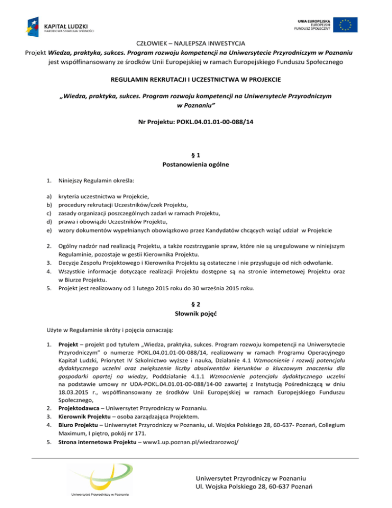 CZŁOWIEK – NAJLEPSZA INWESTYCJA Projekt Wiedza, praktyka, sukces. Program rozwoju kompetencji na Uniwersytecie Przyrodniczym w Poznaniu jest współfinansowany ze środków Unii Europejskiej w ramach Europejskiego Funduszu Społecznego REGULAMIN REKRUTACJI I UCZESTNICTWA W PROJEKCIE „Wiedza, praktyka, sukces. Program rozwoju kompetencji na Uniwersytecie Przyrodniczym w Poznaniu” Nr Projektu: POKL.04.01.01-00-088/14 §1 Postanowienia ogólne 1. Niniejszy Regulamin określa: a) b) c) d) e) kryteria uczestnictwa w Projekcie, procedury rekrutacji Uczestników/czek Projektu, zasady organizacji poszczególnych zadań w ramach Projektu, prawa i obowiązki Uczestników Projektu, wzory dokumentów wypełnianych obowiązkowo przez Kandydatów chcących wziąć udział w Projekcie 2. Ogólny nadzór nad realizacją Projektu, a także rozstrzyganie spraw, które nie są uregulowane w niniejszym Regulaminie, pozostaje w gestii Kierownika Projektu. Decyzje Zespołu Projektowego i Kierownika Projektu są ostateczne i nie przysługuje od nich odwołanie. Wszystkie informacje dotyczące realizacji Projektu dostępne są na stronie internetowej Projektu oraz w Biurze Projektu. Projekt jest realizowany od 1 lutego 2015 roku do 30 września 2015 roku. 3. 4. 5. §2 Słownik pojęć Użyte w Regulaminie skróty i pojęcia oznaczają: 1. 2. 3. 4. 5. Projekt – projekt pod tytułem „Wiedza, praktyka, sukces. Program rozwoju kompetencji na Uniwersytecie Przyrodniczym” o numerze POKL.04.01.01-00-088/14, realizowany w ramach Programu Operacyjnego Kapitał Ludzki, Priorytet IV Szkolnictwo wyższe i nauka, Działanie 4.1 Wzmocnienie i rozwój potencjału dydaktycznego uczelni oraz zwiększenie liczby absolwentów kierunków o kluczowym znaczeniu dla gospodarki opartej na wiedzy, Poddziałanie 4.1.1 Wzmocnienie potencjału dydaktycznego uczelni na podstawie umowy nr UDA-POKL.04.01.01-00-088/14-00 zawartej z Instytucją Pośredniczącą w dniu 18.03.2015 r., współfinansowany ze środków Unii Europejskiej w ramach Europejskiego Funduszu Społecznego, Projektodawca – Uniwersytet Przyrodniczy w Poznaniu. Kierownik Projektu – osoba zarządzająca Projektem. Biuro Projektu – Uniwersytet Przyrodniczy w Poznaniu, ul. Wojska Polskiego 28, 60-637- Poznań, Collegium Maximum, I piętro, pokój nr 171. Strona internetowa Projektu – www1.up.poznan.pl/wiedzarozwoj/ Uniwersytet Przyrodniczy w Poznaniu Ul. Wojska Polskiego 28, 60-637 Poznań CZŁOWIEK – NAJLEPSZA INWESTYCJA Projekt Wiedza, praktyka, sukces. Program rozwoju kompetencji na Uniwersytecie Przyrodniczym w Poznaniu jest współfinansowany ze środków Unii Europejskiej w ramach Europejskiego Funduszu Społecznego 6. Kandydat – osoba aplikująca do udziału w Projekcie. Student/ka ostatniego semestru stacjonarnych studiów licencjackich (I stopnia) lub magisterskich (II stopnia) na jednym z Wydziałów: 1. Rolnictwa i Bioinżynierii (kierunki: Biotechnologia, Ochrona Środowiska, Rolnictwo, Technika Rolnicza i Leśna); 2. Ogrodnictwa i Architektury Krajobrazu (kierunek: Ogrodnictwo); 3. Ekonomiczno-Społecznym (kierunki: Ekonomia, Finanse i Rachunkowość); 4. Medycyny Weterynaryjnej i Nauk o Zwierzętach (kierunki: Biologia, Zootechnika) Uniwersytetu Przyrodniczego w Poznaniu. 7. Uczestnik Projektu – osoba zakwalifikowana do udziału w Projekcie. 8. Osoba nieaktywna zawodowo – osoba pozostająca bez zatrudnienia, która jednocześnie nie zalicza się do kategorii bezrobotni, w tym mająca status studenta. 9. Szkolenia – formy wsparcia oferowane w ramach Projektu w postaci bezpłatnych zajęć dodatkowych, mające na celu rozwój kompetencji poszukiwanych na rynku pracy, do których zaliczamy: warsztaty przedsiębiorczości/warsztaty interpersonalne/warsztaty analityczne, zewnętrzne kursy/szkolenia zawodowe, kończące się nadaniem uprawnień zawodowych bądź zaświadczeniem o nabytych kompetencjach zawodowych wizyty studyjne do wybranych pracodawców o profilu działalności powiązanym z kierunkiem studiów. 10. Ścieżka wsparcia – indywidualny program (obejmujący wybrany/e rodzaj/e szkoleń oraz – opcjonalnie - staż zawodowy), który ma zrealizować każdy z Uczestników Projektu. 11. Indywidualne zdarzenie losowe – nagłe, niespodziewane, pojedyncze i niezależne od człowieka zdarzenie wywołane przyczynami zewnętrznymi, których nie można było przewidzieć przy zachowaniu należytej staranności (np. wypadek, pożar, powódź). §3 Zakres wsparcia Projekt oferuje wsparcie w ramach następujących zadań: 1. Budowanie praktycznych kompetencji zawodowych poprzez realizację: 30 wizyt studyjnych dla wszystkich Uczestników Projektu (Każdy Uczestnik Projektu weźmie udział w jednej 1-dniowej lub 3-dniowej wizycie studyjnej w przedsiębiorstwie bądź instytucji, którego/której profil działalności odpowiada kierunkowi studiów). certyfikowanych szkoleń zawodowych dla 140 studentów z 6 kierunków (uwaga – szkolenia zawodowe są zarezerwowane dla 6 wybranych kierunków z 9 biorących udział w Projekcie, dotyczą wyłącznie Studentów/ek studiów magisterskich) z następujących dziedzin: Operator maszyn rolniczych dla co najmniej 12 Studentów/ek kierunku Technika Rolnicza i Leśna oraz dla co najmniej 18 studentów/ek kierunku Rolnictwo Drwal-pilarz dla co najmniej 6 Studentów/ek kierunku Ogrodnictwo Arborysta dla co najmniej 6 Studentów/ek kierunku Ogrodnictwo Kurs florystyczny dla co najmniej 6 Studentów/ek kierunku Ogrodnictwo Rachunkowość rolnicza w systemie FADN dla co najmniej 10 Studentów/ek kierunku Ekonomia Marketing produktów rolnych dla co najmniej 10 Studentów/ek kierunku Ekonomia Doradca rolny dla co najmniej 10 Studentów/ek kierunku Ekonomia Kurs inseminacyjny dla co najmniej 30 Studentów/ek kierunku Zootechnika Kurs korekcji racic dla co najmniej 12 Studentów/ek kierunku Zootechnika Uniwersytet Przyrodniczy w Poznaniu Ul. Wojska Polskiego 28, 60-637 Poznań CZŁOWIEK – NAJLEPSZA INWESTY