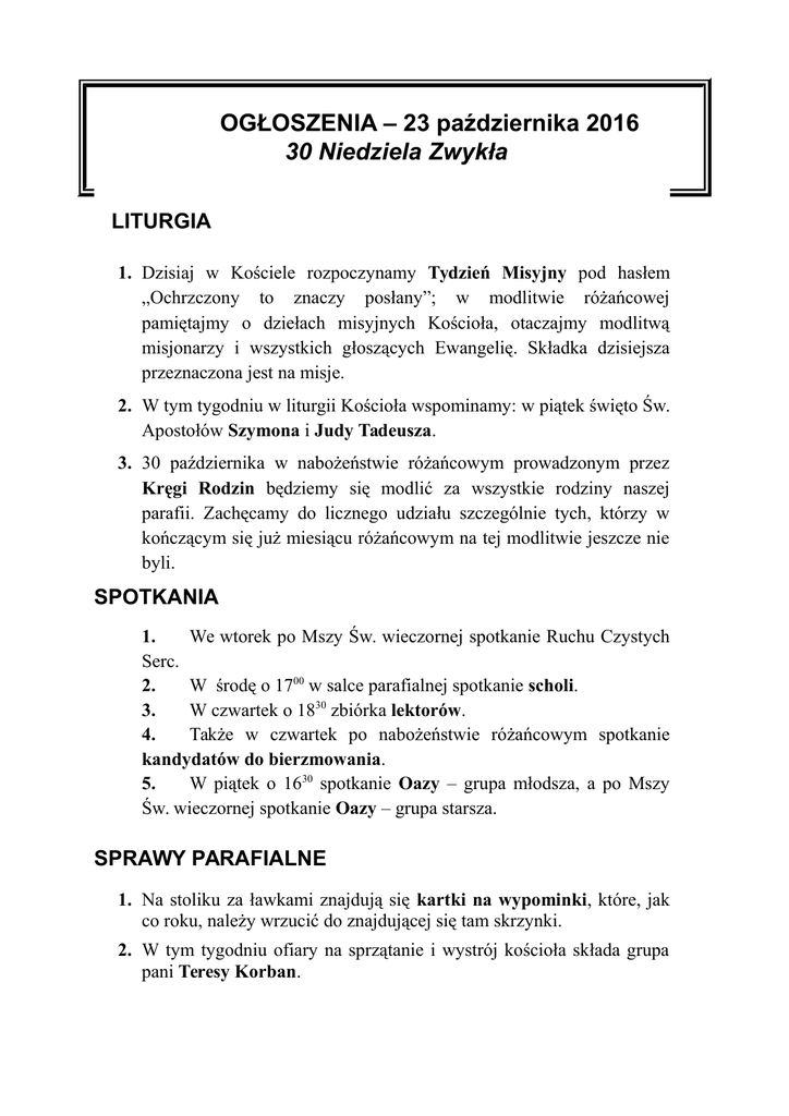 OGŁOSZENIA – 23 października 2016 30 Niedziela Zwykła