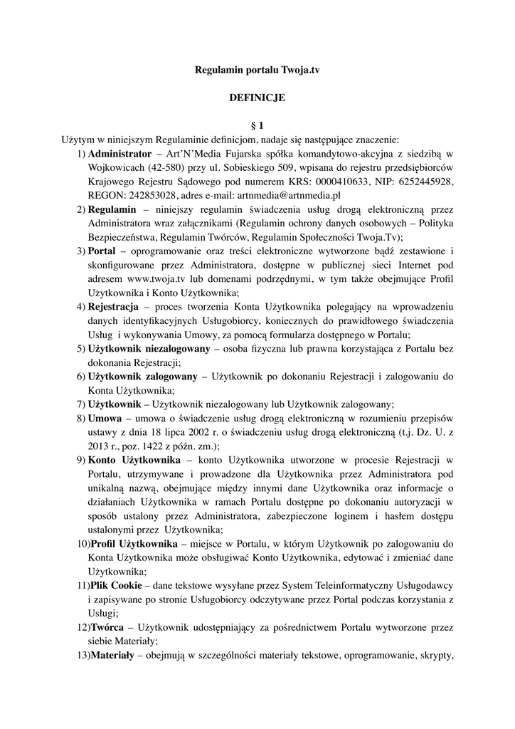 Regulamin portalu Twoja.tv DEFINICJE §1 Użytym w niniejszym Regulaminie definicjom, nadaje się następujące znaczenie: 1) Administrator – Art’N’Media Fujarska spółka komandytowo-akcyjna z siedzibą w Wojkowicach (42-580) przy ul. Sobieskiego 509, wpisana do rejestru przedsiębiorców Krajowego Rejestru Sądowego pod numerem KRS: 0000410633, NIP: 6252445928, REGON: 242853028, adres e-mail: [email protected] 2) Regulamin – niniejszy regulamin świadczenia usług drogą elektroniczną przez Administratora wraz załącznikami (Regulamin ochrony danych osobowych – Polityka Bezpieczeństwa, Regulamin Twórców, Regulamin Społeczności Twoja.Tv); 3) Portal – oprogramowanie oraz treści elektroniczne wytworzone bądź zestawione i skonfigurowane przez Administratora, dostępne w publicznej sieci Internet pod adresem www.twoja.tv lub domenami podrzędnymi, w tym także obejmujące Profil Użytkownika i Konto Użytkownika; 4) Rejestracja – proces tworzenia Konta Użytkownika polegający na wprowadzeniu danych identyfikacyjnych Usługobiorcy, koniecznych do prawidłowego świadczenia Usług i wykonywania Umowy, za pomocą formularza dostępnego w Portalu; 5) Użytkownik niezalogowany – osoba fizyczna lub prawna korzystająca z Portalu bez dokonania Rejestracji; 6) Użytkownik zalogowany – Użytkownik po dokonaniu Rejestracji i zalogowaniu do Konta Użytkownika; 7) Użytkownik – Użytkownik niezalogowany lub Użytkownik zalogowany; 8) Umowa – umowa o świadczenie usług drogą elektroniczną w rozumieniu przepisów ustawy z dnia 18 lipca 2002 r. o świadczeniu usług drogą elektroniczną (t.j. Dz. U. z 2013 r., poz. 1422 z późn. zm.); 9) Konto Użytkownika – konto Użytkownika utworzone w procesie Rejestracji w Portalu, utrzymywane i prowadzone dla Użytkownika przez Administratora pod unikalną nazwą, obejmujące między innymi dane Użytkownika oraz informacje o działaniach Użytkownika w ramach Portalu dostępne po dokonaniu autoryzacji w sposób ustalony przez Administratora, zabezpieczone loginem i hasłem dostępu ustalonymi przez Użytkownika; 10)Profil Użytkownika – miejsce w Portalu, w którym Użytkownik po zalogowaniu do Konta Użytkownika może obsługiwać Konto Użytkownika, edytować i zmieniać dane Użytkownika; 11)Plik Cookie – dane tekstowe wysyłane przez System Teleinformatyczny Usługodawcy i zapisywane po stronie Usługobiorcy odczytywane przez Portal podczas korzystania z Usługi; 12)Twórca – Użytkownik udostępniający za pośrednictwem Portalu wytworzone przez siebie Materiały; 13)Materiały – obejmują w szczególności materiały tekstowe, oprogramowanie, skrypty, grafikę, zdjęcia, dźwięk, muzykę, nagrania wideo, materiały audiowizualne, elementy interaktywne i inne materiały, które Użytkownik może przeglądać, do których może uzyskać dostęp lub które może zamieścić przy użyciu Portalu; 14)Żetony – wewnętrzna jednostka płatnicza obowiązująca w ramach Portalu uprawniająca do głosowania na Materiały oraz skorzystania z rabatów przy zakupie towarów lub usług z Katalogu nagród, oferowanych przez partnerów Administratora; 15)Katalog nagród – część Portalu zawierająca katalog towarów i usług, które Użytkownik Zalogowany może nabyć z wykorzystaniem usługi rabatowej u partnerów Administratora, wykorzystując posiadane przez siebie Żetony; 16)Kanał Główny – kanał telewizyjny dostępny za pośrednictwem Portalu; 17)Operator płatności – Krajowy Integrator Płatności Spółka Akcyjna z siedzibą w Poznaniu (61-808) przy ul. Świętego Marcina 73/6 wpisana do rejestru przedsiębiorców Krajowego Rejestru Sądowego pod numerem KRS: 0000412357, NIP: 7773061579, REGON: 300878437. POSTANOWIENIA OGÓLNE §2 1. Użytkownik nie może korzystać z Portalu i nie może przyjąć Regulaminy, jeżeli: 1) nie jest w wieku, który umożliwia zawarcie z Administratorem wiążącej umowy; 2) jest osobą, wobec której został wydany wiążący zakaz otrzymywania usług oferowanych za pośrednictwem Portalu lub korzystania z nich, na podstawie przepisów prawa kraju, w którym ma stałe miejsce zamieszkania lub z którego uzyskuje dostęp do ww. usług lub z nich korzysta. 2. Użytkownik zobowiązuje się, że w każdym czasie podczas korzystania z Portalu będzie przestrzegał wszystkich pozostałych postanowień Regulaminu oraz załączników stanowiących jego integralną część, tj. Regulaminu społeczności Twoja.tv, Regulaminu ochrony danych osobowych – Polityki Bezpieczeństwa, Regulaminu Twórców. REJESTRACJA §3 1. Dokonując Rejestracji Użytkownik zobowiązuje się przestrzegać niniejszego Regulaminu. 2. Rejestracja w Portalu równoznaczna jest z zawarcie pomiędzy Użytkownikiem, a Administratorem Umowy . 3. Umowa zawierana jest na czas nieoznaczony. 4. Przedmiotem Umowy jest w szczególności zapewnienie możliwości umieszczania Materiałów na Portalu, a także przechowywanie i prezentowanie publiczności Materiałów Użytkownika za pośrednictwem Portalu lub Kanału Głównego. 5. Rejestracji można dokonać zamieszczony w tym celu na Portalu formularz lub poprzez powiązanie posiadanego przez siebie konta w serwisie społecznościowym Facebook lub Google +. 6. Dokonując Rejestracji Użytkownik wyraża zgodę na gromadzenie i przetwarzanie swoich danych osobowych w związku z korzystaniem z Portalu. 7. Administratorem danych osobowych w rozumieniu ustawy z dnia 29 sierpnia 1997 r. o ochronie danych osobowych (t.j. Dz. U. z 2014 r., poz. 1182 z późn. zm.) jest Art’N’Media Fujarska spółka komandytowo-akcyjna z siedzibą w Wojkowicach (Administrator). §4 1. Przed dokonaniem Rejestracji Użytkownik zobowiązany jest do zapoznania się z minimalnymi wymaganiami technicznymi niezbędnymi dla prawidłowego korzystania z Portalu. 2. Minimalne wymagania techniczne niezbędne dla prawidłowego korzystania z Portalu: 1)Urządzenie z dostępem do Internetu; 2)Przeglądarka