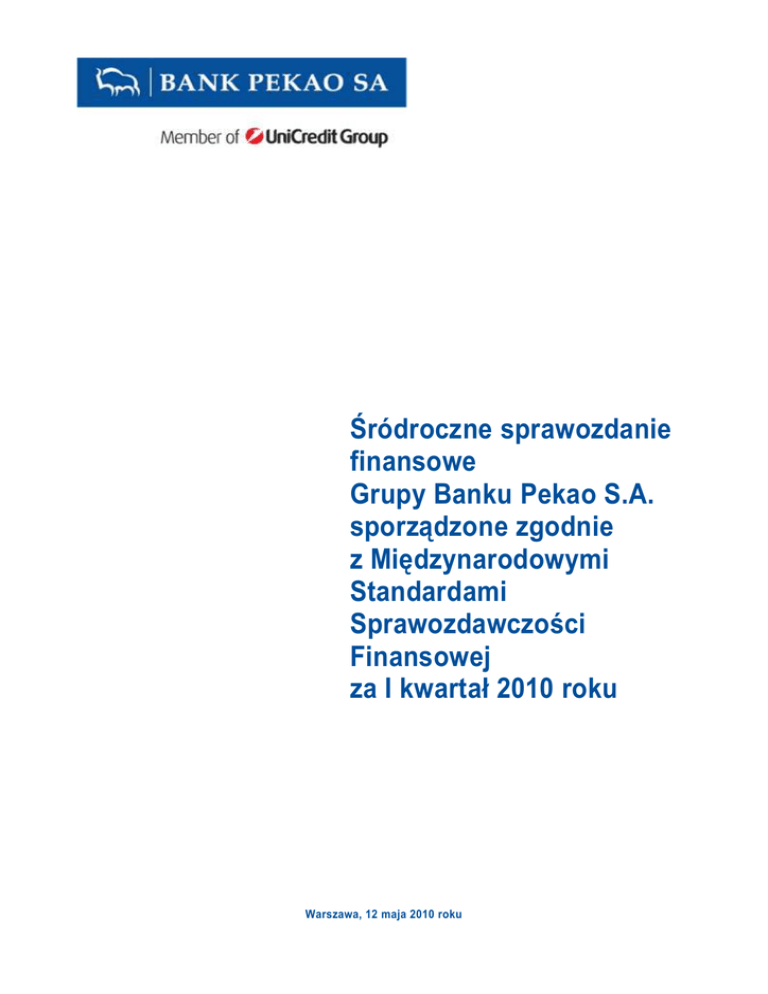 Śródroczne sprawozdanie finansowe Grupy Banku Pekao S.A. sporządzone zgodnie z Międzynarodowymi Standardami Sprawozdawczości Finansowej za I kwartał 2010 roku Warszawa, 12 maja 2010 roku Śródroczne sprawozdanie finansowe Grupy Banku Pekao S.A. za I kwartał 2010 roku Spis treści WYBRANE DANE FINANSOWE ....................................................................................................... 3 PODSUMOWANIE ............................................................................................................................. 4 ZASADY PRZYJĘTE PRZY SPORZĄDZANIU RAPORTU .............................................................. 5 SPRAWOZDANIE FINANSOWE ....................................................................................................... 6 SPRAWOZDANIE SKONSOLIDOWANE .................................................................................... 6 SPRAWOZDANIE JEDNOSTKOWE ......................................................................................... 14 RACHUNEK ZYSKÓW I STRAT W UJĘCIU KWARTALNYM .................................................. 22 SPRAWOZDANIE Z CAŁKOWITYCH DOCHODÓW W UJĘCIU KWARTALNYM................... 24 INFORMACJA DODATKOWA......................................................................................................... 25 OPIS GRUPY............................................................................................................................. 25 WYNIKI OSIĄGNIĘTE W I KWARTALE 2010 R. I CZYNNIKI MAJĄCE NA NIE WPŁYW ....... 27 DANE DOTYCZĄCE SEGMENTÓW BRANśOWYCH.............................................................. 38 KOREKTY Z TYTUŁU REZERW, REZERWA I AKTYWA Z TYTUŁU ODROCZONEGO PODATKU DOCHODOWEGO .................................................................................................. 40 ODPISY AKTUALIZUJĄCE WARTOŚĆ SKŁADNIKÓW AKTYWÓW....................................... 40 SKONSOLIDOWANE DANE DOTYCZĄCE ZMIAN ZOBOWIĄZAŃ WARUNKOWYCH LUB AKTYWÓW WARUNKOWYCH ................................................................................................. 40 ZMIANY WE WŁADZACH BANKU ............................................................................................ 41 WYDARZENIA PO DACIE BILANSU ........................................................................................ 42 OBJAŚNIENIA DOTYCZĄCE SEZONOWOŚCI LUB CYKLICZNOŚCI DZIAŁALNOŚCI......... 42 INFORMACJA DOTYCZĄCA EMISJI, WYKUPU I SPŁATY DŁUśNYCH PAPIERÓW WARTOŚCIOWYCH .................................................................................................................. 42 PODZIAŁ ZYSKU ZA 2009 R. ................................................................................................... 43 OBJAŚNIENIA DOTYCZĄCE DYWIDENDY ............................................................................. 43 WSKAZANIE SKUTKÓW ZMIAN W STRUKTURZE GRUPY................................................... 43 STANOWISKO ZARZĄDU ODNOŚNIE DO MOśLIWOŚCI REALIZACJI WCZEŚNIEJ PUBLIKOWANYCH PROGNOZ ................................................................................................ 43 INFORMACJA O AKCJONARIUSZACH POSIADAJĄCYCH CO NAJMNIEJ 5% OGÓLNEJ LICZBY GŁOSÓW NA WZ BANKU PEKAO S.A....................................................................... 43 INFORMACJA O STANIE POSIADANIA AKCJI EMITENTA PRZEZ OSOBY ZARZĄDZAJĄCE I NADZORUJĄCE ...................................................................................................................... 44 INFORMACJE O TOCZĄCYCH SIĘ POSTĘPOWANIACH ...................................................... 44 OCENY WIARYGODNOŚCI FINANSOWEJ BANKU PEKAO S.A. .......................................... 45 TRANSAKCJE PODMIOTÓW POWIĄZANYCH ....................................................................... 45 CZYNNIKI, KTÓRE BĘDĄ MIAŁY WPŁYW NA WYNIKI CO NAJMNIEJ NASTĘPNEGO KWARTAŁU ............................................................................................................................... 45 Bank Pekao S.A. 2 Śródroczne sprawozdanie finansowe Grupy Banku Pekao S.A. za I kwartał 2010 roku Wybrane dane finansowe Wybrane dane finansowe RACHUNEK ZYSKÓW I STRAT Wynik z tytułu odsetek Przychody z tytułu dywidend i z jednostek ujmowanych metodą praw własności Wynik z tytułu odsetek, dywidend i z jednostek ujmowanych metodą praw własności razem Dochody z transakcji swap Wynik z tytułu odsetek łącznie z dochodami z transakcji swap Wynik z tytułu prowizji i opłat Zysk brutto Zysk netto Zysk netto przypadający na akcjonariuszy Banku Zysk netto przypadający na udziały mniejszości PRZEPŁYWY PIENIĘśNE Przepływy pienięŜne netto z działalności operacyjnej Przepływy pienięŜne netto z działalności inwestycyjnej Przepływy pienięŜne netto z działalności finansowej Przepływy pienięŜne netto, razem BILANS I KWARTAŁ 2010 tys. zł 1 005 120 20 785 I KWARTAŁ 2009 WSKAŹNIKI RYNKOWE Wartość księgowa na jedną akcję Rozwodniona wartość księgowa na jedną akcję Zysk na jedną akcję zwykłą Rozwodniony zysk na jedną akcję zwykłą Zadeklarowana dywidenda na jedną akcję zwykłą ADEKWATNOŚĆ KAPITAŁOWA Współczynnik wypłacalności (%) Aktywa waŜone ryzykiem Fundusze podstawowe (Tier I) Fundusze uzupełniające (Tier II) I KWARTAŁ 2009 909 680 13 051 tys. EUR 253 377 5 240 197 782 2 838 1 025 905 922 731 258 616 200 620 34 137 1 060 042 572 228 741 654 604 950 602 712 2 238 113 553 1 036 284 528 689 710 660 569 646 566 295 3 351 8 605 267 222 144 251 186 961 152 499 151 935 564 24 689 225 309 114 947 154 511 123 852 123 123 729 I KWARTAŁ 2010 I KWARTAŁ 2009 I KWARTAŁ 2010 I KWARTAŁ 2009 tys. zł 149 731 (5 748 480) (158 916) (5 757 665) 31.03.2010 (1 630 769) (910 013) (221 412) (2 762 194) 31.12.2009 tys. zł Kredyty i poŜyczki udzielone klientom oraz naleŜności z tytułu leasingu finansowego Aktywa razem Z