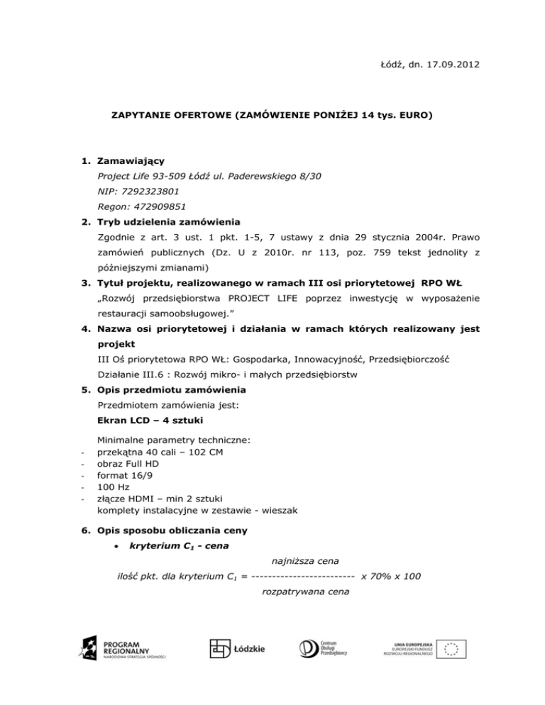 ZAPYTANIE OFERTOWE (ZAMÓWIENIE PONIŻEJ 14 tys. EURO)