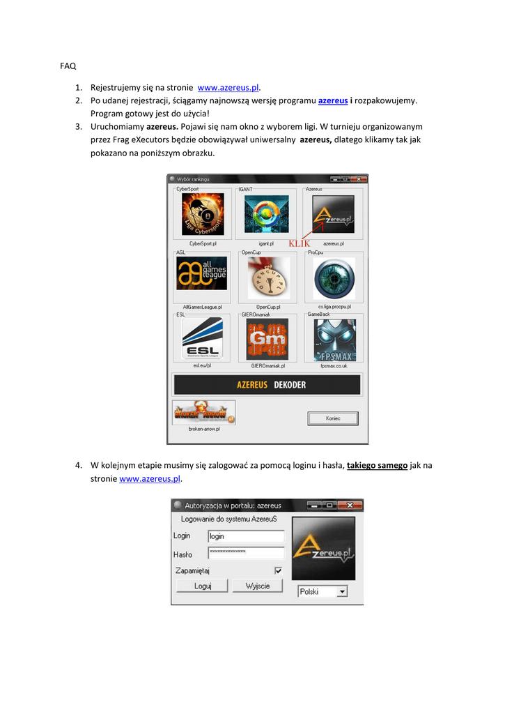 FAQ 1. Rejestrujemy się na stronie www.azereus.pl. 2. Po udanej rejestracji, ściągamy najnowszą wersję programu azereus i rozpakowujemy. Program gotowy jest do użycia! 3. Uruchomiamy azereus. Pojawi się nam okno z wyborem ligi. W turnieju organizowanym przez Frag eXecutors będzie obowiązywał uniwersalny azereus, dlatego klikamy tak jak pokazano na poniższym obrazku. 4. W kolejnym etapie musimy się zalogowad za pomocą loginu i hasła, takiego samego jak na stronie www.azereus.pl. 5. Po wpisaniu poprawnych danych naszym oczom ukaże się kolejne okno. W pole ” kod”, wpisujecie kod, który otrzymacie na mIRC od administratora, rank- uniwersalny. Jeżeli posiadacie Windows Vista lub Windows 7 zaznaczacie ”Wymuś użycie modu visty”. Rozpoczynamy nadzór i odpalamy Counter Strike’a. 6. Po zakooczonym meczu wyłączamy grę. Odblokowujemy program odznaczając pole przy „Blokada”. Klikamy zakoocz nadzór. W folderze z programem utworzy nam się raport, który musimy przesład administratorowi. Sposób na czarne screenshoty itp. 1) Gra w oknie 2) Według mnie najlepsza metoda, sprawdzona na systemie operacyjnym Windows Vista oraz Windows 7. 1. Ściągamy program RivaTuner (klik). 2. Włączamy i czekamy, aż utworzy się baza. 3. W pierwszy oknie klikamy na przycisk "Customize", który znajduje się najniżej i wybieramy ikonkę OpenGL. 4. Przechodzimy do zakładki "Back/depth buffering". 5. W opcji "Back buffer flipping mode" klikamy "Auto select" i wybieramy "Block transfer". 6. Zatwierdzamy poprzez Apply lub OK i gotowe! W turnieju nie akceptujemy tłumaczenia czarnych screenów posiadaniem Windowsa 7.