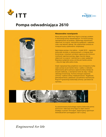 Pompa odwadniająca 2610 Niezawodne rozwiązanie Nowa seria pomp 2600 firmy Flygt to znaczący przełom w technologii pomp odwadniających. Te mocne pompy, zaprojektowane od podstaw, zapewniają niezrównaną odporność na zużycie, niezmienną wydajność z upływem czasu oraz łatwość obsługi. Dla użytkownika oznacza to mniejsze koszty użytkowania i eksploatacji. Najmniejsza pompa z tej rodziny – model 2610 – zapewnia doskonałe rezultaty w zastosowaniach o mniejszej skali. Konstrukcja z otwartym wirnikiem ogranicza do minimum możliwość zapchania pompy, dając znacznie lepszą odporność na zużycie i niezmienną w czasie wydajność. Regulacja wydajności pracy wirnika jest bardzo prosta – służy do tego tylko jedna śruba. Dzięki najwyższej klasy projektowi oraz zmniejszeniu liczby części pompa ta jest bardzo łatwa i szybka w obsłudze. Zdejmowana górna pokrywa zapewnia łatwy dostęp do skrzynki kablowej, a zewnętrzne korki do oleju i rewizji ułatwiają konserwację. Komora rewizyjna poprawia ochronę i wydłuża okresy międzyserwisowe. Wyjątkowe, jednoelementowe, pakietowe uszczelnienie mechaniczne Plug-In™ gwarantuje doskonałą ochronę i jest łatwe do wymiany. Tę zaawansowaną technologię wspiera doskonała pomoc techniczna i obecność firmy Flygt na całym świecie. Działając w ponad 130 krajach, dysponujemy ogromnym doświadczeniem pomagającym nam w pracy. 2610.170 Komora rewizyjna – Lepsza ochrona Specjalnie zaprojektowany wirnik o dużej zawartości chromu, odporny na zapychanie – Wysoka, niezmienna efektywność Obracane sito ze stali nierdzewnej – Odporność na korozję i uderzenia Gumowe amortyzatory – Odporność na uderzenia 2610.170 Pompa zatapialna do odwadniania placów budowy, kopalni, usuwania wody z obszarów zalanych i innych podobnych zastosowań, w których pompowane medium może zawierać cząstki ścierne. Oznaczenie Kod produktu 2610.170 Typ instalacji Przenośna Charakterystyka wirnika Średnia wysokość słupa wody K 234 MT, 3~ Odporność na zapychanie K 233 MT, 1~ Złącze wylotowe 2” Dane robocze Temperatura cieczy maks. +40°C Głębokość zanurzenia maks. 20 m Gęstość cieczy maks. 1100 kg/m³ Wymiary otworu sita 6 mm x 13,5 mm – Powiększone otwory przy obróconym sicie Odczyn pH pompowanej cieczy pH 5–8 Silnik elektryczny Klatkowy, jednofazowy lub trójfazowy silnik indukcyjny Częstotliwość 50 Hz Klasa izolacji F (+155°C) Zmienność napięcia – praca ciągła maks. ± 5% – praca przerywana maks. ± 10% Niezrównoważenie napięcia między fazami maks. 2% Liczba uruchomień na godzinę maks. 30 Wygodny uchwyt Parametry Zdejmowana pokrywa – Łatwy dostęp do elementów elektrycznych Wysokość podnoszenia [m] Wbudowane kondensatory – Łatwa obsługa Uszczelnienie pakietowe Plug-In™ – Łatwość serwisu, podwójna ochrona K 234 MT K 233 MT Odrzutnik Spin-Out™ – Ogranicza do minimum zapychanie i zużycie uszczelnienia Zewnętrzne korki oleju i rewizjny – Łatwość inspekcji i serwisu Kable SUBCAB® Kabel do pomp głębinowych NSSHÖU Gumowy kabel „heavy duty” do pomp głębinowych Wyposażenie monitorujące Temperatura zadziałania styków termicznych +125°C Materiały Obudowa zewnętrzna Stop aluminium Wirnik Żeliwo białe o wysokiej zawartości chromu Części zużywające się Kauczuk nitrylowy Obudowa stojana Stal nierdzewna Sito Stal nierdzewna Wał Stal nierdzewna Pierścienie uszczelniające Kauczuk nitrylowy Uszczelnienie mechaniczne Wewnętrzne węglik wolframu/ceramika Zewnętrzne węglik wolframu/węglik wolframu Masa Całkowita (bez kabla) Wydajność [l/s] MT = Srednia wysokosc słupa wody K= Wirnik odporny na zapychanie Wymiary Wysokość Średnica Opcje Wersja do cieczy gorących max. +70 C° Szybkozłczki 6”, 4” Startery Anody cynkowe Akcesoria Adaptery, złącza do węży i inne akcesoria mechaniczne. Akcesoria elektryczne, takie jak sterownik pompy, panele sterowania i przekaźniki monitorujące. Parametry znamionowe 1~ faza, 3~ fazy Moc znamionowa 1~ 0,75 kW, 3~ 1,1 kW Prędkość obrotowa 1~ 2820 obr./min 3~ 2770 obr./min ~ Napięcie Prąd Prąd znamio- rozruchu nowy V A A 1~ 1~ 1~ 1~ 3~ 3~ 3~ 3~ 3~ 3~ 3~ 19 kg www.flygt.pl 594 mm 195 mm 110 220 230 240 220 D 230 D 380 Y 400 Y 415 Y 500 Y 550 Y 9,1 4,5 4,5 4,5 4,3 4,3 2,5 2,5 2,5 1,9 1,9 38 19 20 21 20 21 12 12 13 9 10 2610.04.01.Pol.09.06 896450 Trosa Tryckeri AB 56815 Jedna śruba regulacyjna – Łatwość ustawiania optymalnej wydajności 50 Hz