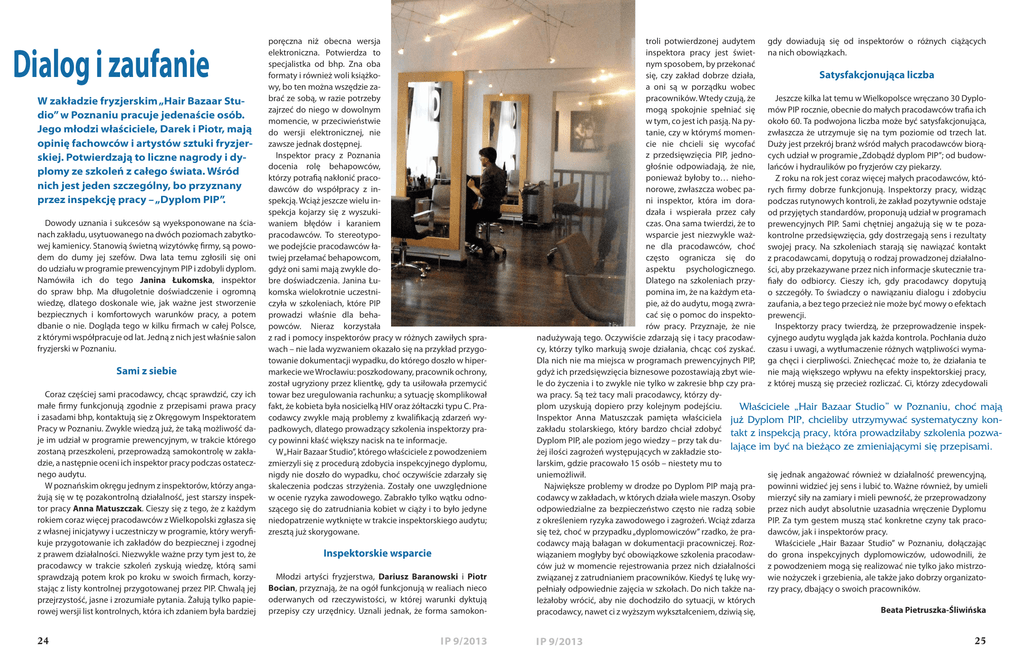Dialog i zaufanie W zakładzie fryzjerskim „Hair Bazaar Studio” w Poznaniu pracuje jedenaście osób. Jego młodzi właściciele, Darek i Piotr, mają opinię fachowców i artystów sztuki fryzjerskiej. Potwierdzają to liczne nagrody i dyplomy ze szkoleń z całego świata. Wśród nich jest jeden szczególny, bo przyznany przez inspekcję pracy – „Dyplom PIP”. Dowody uznania i sukcesów są wyeksponowane na ścianach zakładu, usytuowanego na dwóch poziomach zabytkowej kamienicy. Stanowią świetną wizytówkę firmy, są powodem do dumy jej szefów. Dwa lata temu zgłosili się oni do udziału w programie prewencyjnym PIP i zdobyli dyplom. Namówiła ich do tego Janina Łukomska, inspektor do spraw bhp. Ma długoletnie doświadczenie i ogromną wiedzę, dlatego doskonale wie, jak ważne jest stworzenie bezpiecznych i komfortowych warunków pracy, a potem dbanie o nie. Dogląda tego w kilku firmach w całej Polsce, z którymi współpracuje od lat. Jedną z nich jest właśnie salon fryzjerski w Poznaniu. Sami z siebie Coraz częściej sami pracodawcy, chcąc sprawdzić, czy ich małe firmy funkcjonują zgodnie z przepisami prawa pracy i zasadami bhp, kontaktują się z Okręgowym Inspektoratem Pracy w Poznaniu. Zwykle wiedzą już, że taką możliwość daje im udział w programie prewencyjnym, w trakcie którego zostaną przeszkoleni, przeprowadzą samokontrolę w zakładzie, a następnie oceni ich inspektor pracy podczas ostatecznego audytu. W poznańskim okręgu jednym z inspektorów, którzy angażują się w tę pozakontrolną działalność, jest starszy inspektor pracy Anna Matuszczak. Cieszy się z tego, że z każdym rokiem coraz więcej pracodawców z Wielkopolski zgłasza się z własnej inicjatywy i uczestniczy w programie, który weryfikuje przygotowanie ich zakładów do bezpiecznej i zgodnej z prawem działalności. Niezwykle ważne przy tym jest to, że pracodawcy w trakcie szkoleń zyskują wiedzę, którą sami sprawdzają potem krok po kroku w swoich firmach, korzystając z listy kontrolnej przygotowanej przez PIP. Chwalą jej przejrzystość, jasne i zrozumiałe pytania. Żałują tylko papierowej wersji list kontrolnych, która ich zdaniem była bardziej 24 poręczna niż obecna wersja elektroniczna. Potwierdza to specjalistka od bhp. Zna oba formaty i również woli książkowy, bo ten można wszędzie zabrać ze sobą, w razie potrzeby zajrzeć do niego w dowolnym momencie, w przeciwieństwie do wersji elektronicznej, nie zawsze jednak dostępnej. Inspektor pracy z Poznania docenia rolę behapowców, którzy potrafią nakłonić pracodawców do współpracy z inspekcją. Wciąż jeszcze wielu inspekcja kojarzy się z wyszukiwaniem błędów i karaniem pracodawców. To stereotypowe podejście pracodawców łatwiej przełamać behapowcom, gdyż oni sami mają zwykle dobre doświadczenia. Janina Łukomska wielokrotnie uczestniczyła w szkoleniach, które PIP prowadzi właśnie dla behapowców. Nieraz korzystała z rad i pomocy inspektorów pracy w różnych zawiłych sprawach – nie lada wyzwaniem okazało się na przykład przygotowanie dokumentacji wypadku, do którego doszło w hipermarkecie we Wrocławiu: poszkodowany, pracownik ochrony, został ugryziony przez klientkę, gdy ta usiłowała przemycić towar bez uregulowania rachunku; a sytuację skomplikował fakt, że kobieta była nosicielką HIV oraz żółtaczki typu C. Pracodawcy zwykle mają problemy z kwalifikacją zdarzeń wypadkowych, dlatego prowadzący szkolenia inspektorzy pracy powinni kłaść większy nacisk na te informacje. W„Hair Bazaar Studio”, którego właściciele z powodzeniem zmierzyli się z procedurą zdobycia inspekcyjnego dyplomu, nigdy nie doszło do wypadku, choć oczywiście zdarzały się skaleczenia podczas strzyżenia. Zostały one uwzględnione w ocenie ryzyka zawodowego. Zabrakło tylko wątku odnoszącego się do zatrudniania kobiet w ciąży i to było jedyne niedopatrzenie wytknięte w trakcie inspektorskiego audytu; zresztą już skorygowane. Inspektorskie wsparcie Młodzi artyści fryzjerstwa, Dariusz Baranowski i Piotr Bocian, przyznają, że na ogół funkcjonują w realiach nieco oderwanych od rzeczywistości, w której warunki dyktują przepisy czy urzędnicy. Uznali jednak, że forma samokon- IP 9/2013 troli potwierdzonej audytem gdy dowiadują się od inspektorów o różnych ciążących inspektora pracy jest świet- na nich obowiązkach. nym sposobem, by przekonać się, czy zakład dobrze działa, Satysfakcjonująca liczba a oni są w porządku wobec pracowników. Wtedy czują, że Jeszcze kilka lat temu w Wielkopolsce wręczano 30 Dyplomogą spokojnie spełniać się mów PIP rocznie, obecnie do małych pracodawców trafia ich w tym, co jest ich pasją. Na py- około 60. Ta podwojona liczba może być satysfakcjonująca, tanie, czy w którymś momen- zwłaszcza że utrzymuje się na tym poziomie od trzech lat. cie nie chcieli się wycofać Duży jest przekrój branż wśród małych pracodawców biorąz przedsięwzięcia PIP, jedno- cych udział w programie „Zdobądź dyplom PIP”; od budowgłośnie odpowiadają, że nie, lańców i hydraulików po fryzjerów czy piekarzy. ponieważ byłoby to… niehoZ roku na rok jest coraz więcej małych pracodawców, któnorowe, zwłaszcza wobec pa- rych firmy dobrze funkcjonują. Inspektorzy pracy, widząc ni inspektor, która im dora- podczas rutynowych kontroli, że zakład pozytywnie odstaje dzała i wspierała przez cały od przyjętych standardów, proponują udział w programach czas. Ona sama twierdzi, że to prewencyjnych PIP. Sami chętniej angażują się w te pozawsparcie jest niezwykle waż- kontrolne przedsięwzięcia, gdy dostrzegają sens i rezultaty ne dla pracodawców, choć swojej pracy. Na szkoleniach starają się nawiązać kontakt często ogranicza się do z pracodawcami, dopytują o rodzaj prowadzonej działalnoaspektu psychologicznego. ści, aby przekazywane przez nich informacj