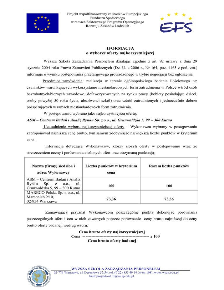 Projekt współfinansowany ze środków Europejskiego Funduszu Społecznego w ramach Sektorowego Programu Operacyjnego Rozwoju Zasobów Ludzkich IFORMACJA o wyborze oferty najkorzystniejszej Wyższa Szkoła Zarządzania Personelem działając zgodnie z art. 92 ustawy z dnia 29 stycznia 2004 roku Prawo Zamówień Publicznych (Dz. U. z 2006 r., Nr 164, poz. 1163 z poń. zm.) informuje o wyniku postępowania przetargowego prowadzonego w trybie negocjacji bez ogłoszenia. Przedmiot zamówienia: realizacja w terenie ogólnopolskiego badania ilościowego nt: czynników warunkujących wykorzystanie niestandardowych form zatrudnienia w Polsce wśród osób bezrobotnych/biernych zawodowo, defaworyzowanych na rynku pracy (kobiety posiadające dzieci, osoby powyżej 50 roku życia, absolwenci szkół) oraz wśród zatrudnionych i jednocześnie dobrze prosperujących w ramach niestandardowych form zatrudnienia. W postępowaniu wybrano jako najkorzystniejszą ofertę: ASM – Centrum Badań i Analiz Rynku Sp. z o.o., ul. Grunwaldzka 5, 99 – 300 Kutno Uzasadnienie wyboru najkorzystniejszej oferty – Wykonawca wybrany w postępowaniu zaproponował najniższą cenę brutto, tym samym zdobywając największą liczbę punktów w kryterium cena. Informacja dotycząca Wykonawców, którzy złożyli oferty w postępowaniu wraz ze streszczeniem oceny i porównania złożonych ofert oraz otrzymaną punktacją: Nazwa (firmy) siedziba i Liczba punktów w kryterium adres Wykonawcy cena ASM – Centrum Badań i Analiz Rynku Sp. z o.o., ul. Grunwaldzka 5, 99 – 300 Kutno MARECO Polska Sp. z o.o., ul. Marconich 9/10, 02-954 Warszawa Razem liczba punktów 100 100 73,36 73,36 Zamawiający przyznał Wykonawcom poszczególne punkty dokonując porównania poszczególnych ofert i cen w nich zawartych poprzez porównanie ceny brutto najniższej do ceny brutto oferty badanej, według wzoru: Cena brutto oferty najkorzystniejszej Cena = ---------------------------------------------- x 100 Cena brutto oferty badanej WYŻSZA SZKOŁA ZARZĄDZANIA PERSONELEM____________________ 02-776 Warszawa, ul. Dereniowa 52/54, tel. (0 22) 855 49 16 (wew.108), www.wszp.edu.pl [email protected]: