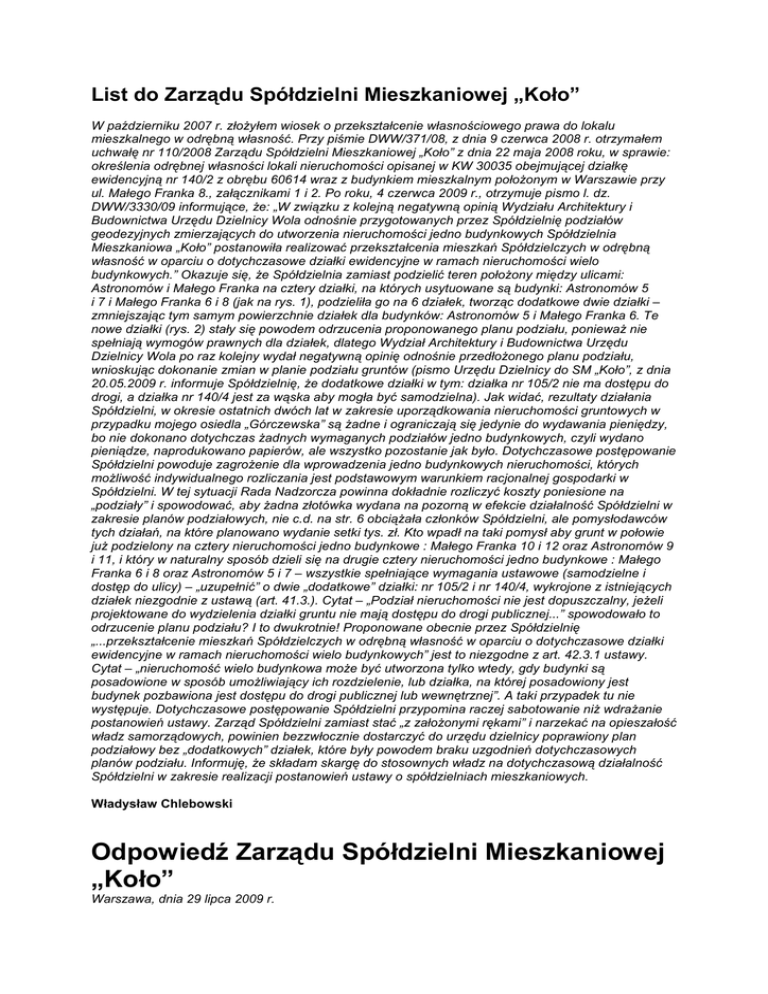 List do Zarządu Spółdzielni Mieszkaniowej „Koło” W październiku 2007 r. złoŜyłem wiosek o przekształcenie własnościowego prawa do lokalu mieszkalnego w odrębną własność. Przy piśmie DWW/371/08, z dnia 9 czerwca 2008 r. otrzymałem uchwałę nr 110/2008 Zarządu Spółdzielni Mieszkaniowej „Koło” z dnia 22 maja 2008 roku, w sprawie: określenia odrębnej własności lokali nieruchomości opisanej w KW 30035 obejmującej działkę ewidencyjną nr 140/2 z obrębu 60614 wraz z budynkiem mieszkalnym połoŜonym w Warszawie przy ul. Małego Franka 8., załącznikami 1 i 2. Po roku, 4 czerwca 2009 r., otrzymuje pismo l. dz. DWW/3330/09 informujące, Ŝe: „W związku z kolejną negatywną opinią Wydziału Architektury i Budownictwa Urzędu Dzielnicy Wola odnośnie przygotowanych przez Spółdzielnię podziałów geodezyjnych zmierzających do utworzenia nieruchomości jedno budynkowych Spółdzielnia Mieszkaniowa „Koło” postanowiła realizować przekształcenia mieszkań Spółdzielczych w odrębną własność w oparciu o dotychczasowe działki ewidencyjne w ramach nieruchomości wielo budynkowych.” Okazuje się, Ŝe Spółdzielnia zamiast podzielić teren połoŜony między ulicami: Astronomów i Małego Franka na cztery działki, na których usytuowane są budynki: Astronomów 5 i 7 i Małego Franka 6 i 8 (jak na rys. 1), podzieliła go na 6 działek, tworząc dodatkowe dwie działki – zmniejszając tym samym powierzchnie działek dla budynków: Astronomów 5 i Małego Franka 6. Te nowe działki (rys. 2) stały się powodem odrzucenia proponowanego planu podziału, poniewaŜ nie spełniają wymogów prawnych dla działek, dlatego Wydział Architektury i Budownictwa Urzędu Dzielnicy Wola po raz kolejny wydał negatywną opinię odnośnie przedłoŜonego planu podziału, wnioskując dokonanie zmian w planie podziału gruntów (pismo Urzędu Dzielnicy do SM „Koło”, z dnia 20.05.2009 r. informuje Spółdzielnię, Ŝe dodatkowe działki w tym: działka nr 105/2 nie ma dostępu do drogi, a działka nr 140/4 jest za wąska aby mogła być samodzielna). Jak widać, rezultaty działania Spółdzielni, w okresie ostatnich dwóch lat w zakresie uporządkowania nieruchomości gruntowych w przypadku mojego osiedla „Górczewska” są Ŝadne i ograniczają się jedynie do wydawania pieniędzy, bo nie dokonano dotychczas Ŝadnych wymaganych podziałów jedno budynkowych, czyli wydano pieniądze, naprodukowano papierów, ale wszystko pozostanie jak było. Dotychczasowe postępowanie Spółdzielni powoduje zagroŜenie dla wprowadzenia jedno budynkowych nieruchomości, których moŜliwość indywidualnego rozliczania jest podstawowym warunkiem racjonalnej gospodarki w Spółdzielni. W tej sytuacji Rada Nadzorcza powinna dokładnie rozliczyć koszty poniesione na „podziały” i spowodować, aby Ŝadna złotówka wydana na pozorną w efekcie działalność Spółdzielni w zakresie planów podziałowych, nie c.d. na str. 6 obciąŜała członków Spółdzielni, ale pomysłodawców tych działań, na które planowano wydanie setki tys. zł. Kto wpadł na taki pomysł aby grunt w połowie juŜ podzielony na cztery nieruchomości jedno budynkowe : Małego Franka 10 i 12 oraz Astronomów 9 i 11, i który w naturalny sposób dzieli się na drugie cztery nieruchomości jedno budynkowe : Małego Franka 6 i 8 oraz Astronomów 5 i 7 – wszystkie spełniające wymagania ustawowe (samodzielne i dostęp do ulicy) – „uzupełnić” o dwie „dodatkowe” działki: nr 105/2 i nr 140/4, wykrojone z istniejących działek niezgodnie z ustawą (art. 41.3.). Cytat – „Podział nieruchomości nie jest dopuszczalny, jeŜeli projektowane do wydzielenia działki gruntu nie mają dostępu do drogi publicznej...” spowodowało to odrzucenie planu podziału? I to dwukrotnie! Proponowane obecnie przez Spółdzielnię „...przekształcenie mieszkań Spółdzielczych w odrębną własność w oparciu o dotychczasowe działki ewidencyjne w ramach nieruchomości wielo budynkowych” jest to niezgodne z art. 42.3.1 ustawy. Cytat – „nieruchomość wielo budynkowa moŜe być utworzona tylko wtedy, gdy budynki są posadowione w sposób umoŜliwiający ich rozdzielenie, lub działka, na której posadowiony jest budynek pozbawiona jest dostępu do drogi publicznej lub wewnętrznej”. A taki przypadek tu nie występuje. Dotychczasowe postępowanie Spółdzielni przypomina raczej sabotowanie niŜ wdraŜanie postanowień ustawy. Zarząd Spółdzielni zamiast stać „z załoŜonymi rękami” i narzekać na opieszałość władz samorządowych, powinien bezzwłocznie dostarczyć do urzędu dzielnicy poprawiony plan podziałowy bez „dodatkowych” działek, które były powodem braku uzgodnień dotychczasowych planów podziału. Informuję, Ŝe składam skargę do stosownych władz na dotychczasową działalność Spółdzielni w zakresie realizacji postanowień ustawy o spółdzielniach mieszkaniowych. Władysław Chlebowski Odpowiedź Zarządu Spółdzielni Mieszkaniowej „Koło” Warszawa, dnia 29 lipca 2009 r. Szanowny Panie W odpowiedzi na Pana pismo datowane 21 lipca 2009 roku, złoŜone w siedzibie Spółdzielni w dniu 22 lipca 2009 roku, wyjaśniamy co następuje. Ustawa z dnia 14 czerwca 2007 roku o zmianie ustawy o spółdzielniach mieszkaniowych oraz o zmianie niektórych innych ustaw, która weszła w Ŝycie w dniu 31 lipca 2007 roku, narzuciła obowiązek tworzenia nieruchomości jedno budynkowych , jako podstawowych nieruchomości ewidencyjnych, w których ustanawia się odrębną własność lokali. Ustawa dopuściła odstępstwo od powyŜszej reguły jedynie w przypadku, gdy budynki są posadowione w sposób uniemoŜliwiający ich rozdzielenie lub działka, na której posadowiony jest budynek, pozbawiona jest dostępu do drogi publicznej lub wewnętrznej, przy czym ustawa nie wskazuje, iŜ musi to być dostęp bezpośredni. Kierując się powyŜszymi regulacjami Spółd