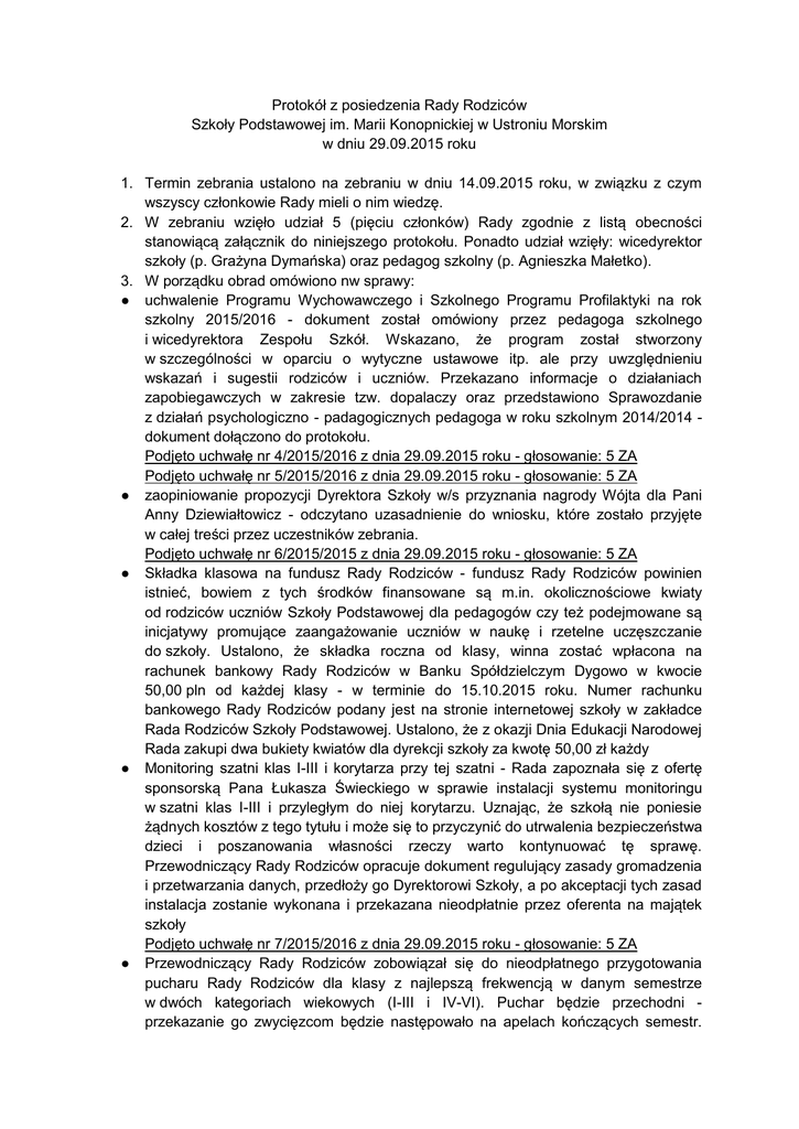 Protokół z posiedzenia Rady Rodziców Szkoły Podstawowej im. Marii Konopnickiej w Ustroniu Morskim w dniu 29.09.2015 roku 1. Termin zebrania ustalono na zebraniu w dniu 14.09.2015 roku, w związku z czym wszyscy członkowie Rady mieli o nim wiedzę. 2. W zebraniu wzięło udział 5 (pięciu członków) Rady zgodnie z listą obecności stanowiącą załącznik do niniejszego protokołu. Ponadto udział wzięły: wicedyrektor szkoły (p. Grażyna Dymańska) oraz pedagog szkolny (p. Agnieszka Małetko). 3. W porządku obrad omówiono nw sprawy: ● uchwalenie Programu Wychowawczego i Szkolnego Programu Profilaktyki na rok szkolny 2015/2016 - dokument został omówiony przez pedagoga szkolnego i wicedyrektora Zespołu Szkół. Wskazano, że program został stworzony w szczególności w oparciu o wytyczne ustawowe itp. ale przy uwzględnieniu wskazań i sugestii rodziców i uczniów. Przekazano informacje o działaniach zapobiegawczych w zakresie tzw. dopalaczy oraz przedstawiono Sprawozdanie z działań psychologiczno - padagogicznych pedagoga w roku szkolnym 2014/2014 dokument dołączono do protokołu. Podjęto uchwałę nr 4/2015/2016 z dnia 29.09.2015 roku - głosowanie: 5 ZA Podjęto uchwałę nr 5/2015/2016 z dnia 29.09.2015 roku - głosowanie: 5 ZA ● zaopiniowanie propozycji Dyrektora Szkoły w/s przyznania nagrody Wójta dla Pani Anny Dziewiałtowicz - odczytano uzasadnienie do wniosku, które zostało przyjęte w całej treści przez uczestników zebrania. Podjęto uchwałę nr 6/2015/2015 z dnia 29.09.2015 roku - głosowanie: 5 ZA ● Składka klasowa na fundusz Rady Rodziców - fundusz Rady Rodziców powinien istnieć, bowiem z tych środków finansowane są m.in. okolicznościowe kwiaty od rodziców uczniów Szkoły Podstawowej dla pedagogów czy też podejmowane są inicjatywy promujące zaangażowanie uczniów w naukę i rzetelne uczęszczanie do szkoły. Ustalono, że składka roczna od klasy, winna zostać wpłacona na rachunek bankowy Rady Rodziców w Banku Spółdzielczym Dygowo w kwocie 50,00 pln od każdej klasy - w terminie do 15.10.2015 roku. Numer rachunku bankowego Rady Rodziców podany jest na stronie internetowej szkoły w zakładce Rada Rodziców Szkoły Podstawowej. Ustalono, że z okazji Dnia Edukacji Narodowej Rada zakupi dwa bukiety kwiatów dla dyrekcji szkoły za kwotę 50,00 zł każdy ● Monitoring szatni klas I-III i korytarza przy tej szatni - Rada zapoznała się z ofertę sponsorską Pana Łukasza Świeckiego w sprawie instalacji systemu monitoringu w szatni klas I-III i przyległym do niej korytarzu. Uznając, że szkołą nie poniesie żądnych kosztów z tego tytułu i może się to przyczynić do utrwalenia bezpieczeństwa dzieci i poszanowania własności rzeczy warto kontynuować tę sprawę. Przewodniczący Rady Rodziców opracuje dokument regulujący zasady gromadzenia i przetwarzania danych, przedłoży go Dyrektorowi Szkoły, a po akceptacji tych zasad instalacja zostanie wykonana i przekazana nieodpłatnie przez oferenta na majątek szkoły Podjęto uchwałę nr 7/2015/2016 z dnia 29.09.2015 roku - głosowanie: 5 ZA ● Przewodniczący Rady Rodziców zobowiązał się do nieodpłatnego przygotowania pucharu Rady Rodziców dla klasy z najlepszą frekwencją w danym semestrze w dwóch kategoriach wiekowych (I-III i IV-VI). Puchar będzie przechodni przekazanie go zwycięzcom będzie następowało na apelach kończących semestr. Rada Rodziców postara się również ufundować nagrodę specjalną w konkursie “Ptaki i ptaszki polne”. Na tym zebranie zakończono. Protokół sporządził i zebranie prowadził Przewodniczący Rady Rodziców, Grzegorz Pytloch. Protokół zostanie opublikowany na stronie internetowej szkoły w zakładce http://szkola.ustronie-morskie.pl/rada-rodzicow-szkolypodstawowej,99,l1.html. Na oryginale podpis (------------------------------------------------)