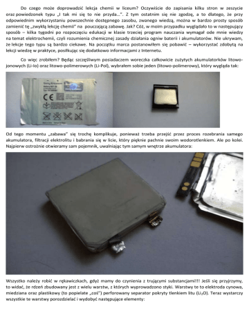 Do czego może doprowadzić lekcja chemii w liceum? Oczywiście do zapisania kilku stron w zeszycie oraz powiedzonek typu „I tak mi się to nie przyda…”. Z tym ostatnim się nie zgodzę, a to dlatego, że przy odpowiednim wykorzystaniu powszechnie dostępnego zasobu, zwanego wiedzą, można w bardzo prosty sposób zamienić tę „zwykłą lekcję chemii” na pouczającą zabawę. Jak? Cóż, w moim przypadku wyglądało to w następujący sposób – kilka tygodni po rozpoczęciu edukacji w klasie trzeciej program nauczania wymagał ode mnie wiedzy na temat elektrochemii, czyli rozumienia chemicznej zasady działania ogniw baterii i akumulatorów. Nie ukrywam, że lekcje tego typu są bardzo ciekawe. Na początku marca postanowiłem się pobawić – wykorzystać zdobytą na lekcji wiedzę w praktyce, posiłkując się dodatkowo informacjami z Internetu. Co więc zrobiłem? Będąc szczęśliwym posiadaczem woreczka całkowicie zużytych akumulatorków litowojonowych (Li-Io) oraz litowo-polimerowych (Li-Pol), wybrałem sobie jeden (litowo-polimerowy), który wygląda tak: Od tego momentu „zabawa” się trochę komplikuje, ponieważ trzeba przejść przez proces rozebrania samego akumulatora, filtracji elektrolitu i babrania się w licie, który pięknie pachnie swoim wodorotlenkiem. Ale po kolei. Najpierw ostrożnie otwieramy sam pojemnik, uwalniając tym samym wnętrze akumulatora: Wszystko należy robić w rękawiczkach, gdyż mamy do czynienia z trującymi substancjami!!! Jeśli się przyjrzymy, to widać, że rdzeń zbudowany jest z wielu warstw, z których wyprowadzono styki. Warstwy te to elektroda cynowa, miedziana oraz plastikowy (to popielate „coś”) perforowany separator pokryty tlenkiem litu (Li 2O). Teraz wystarczy wszystkie te warstwy porozdzielać i wydobyć następujące elementy: Z tych trzech elementów wyrzucamy elektrodę cynową, a zostawiamy resztę. Cały wydobyty separator i miedź wkładamy do kąpieli z dobrego organicznego rozpuszczalnika (w moim przypadku był to rozcieńczony alkohol izopropylowy – 25 zł/1 l), na około 15 minut. W tym momencie warto zajrzeć do tablic chemicznych bądź „wygooglować” sobie szereg napięciowy i poszukać w nim metalu, który wykaże największą różnicę napięć od miedzi. Oczywiście musi to być metal, do którego mamy prosty i tani dostęp. Ja wykorzystałem fragment samoprzylepnej taśmy aluminiowej. Pora na bardzo skomplikowane obliczenia. Odczytujemy, wykorzystując tablicę standardowych potencjałów elektrochemicznych metali, wartości potencjałów miedzi (Cu) = +0,337 V oraz potencjał aluminium (Al) = -1,698 V. Teraz liczymy maksymalne napięcie nowego akumulatora: 0,337 + 1,698 ≈ 2,0V. Jeśli dobrze dobierze się elektrolit – jego stężenie i proporcje, to można tyle otrzymać. Po obliczeniach i stworzeniu nowej elektrody, zabieramy się za lit. Gdy wyciągniemy elementy z kąpieli w rozpuszczalniku, suszymy je i ostro zakończoną szpatułką delikatnie zdzieramy lit z miedzi oraz separatora. W tym momencie wykorzystujemy jakiś młynek lub stare nożyczki (tak jak ja to zrobiłem) i dosłownie szatkujemy płatki litu na jak drobniejsze części. Oczywiście najlepszy byłby proszek, ponieważ łatwiej go rozpuścić. Po tej czynności mój lit wygląda tak: Od tego momentu właściwie już składam mój akumulator: Elementy, jakie tu mam, to elektrody miedziane, jedna długa elektroda aluminiowa, rozcieńczony alkoholem izopropylowym wodorotlenek sodu w strzykawce oraz sam lit i separator. Na końcu elektrod zakładam aluminiowe wyprowadzenia elektrod w taki sposób, aby nie miały one kontaktu z elektrolitem i litem. Złożenie akumulatorka polegało na tym, aby ułożyć rdzeń w następujący sposób: elektroda Cu -> nasączony lit -> separator -> znowu lit -> elektroda Al -> lit -> separator. Wszystkie te elementy układam warstwami w podanej wyżej kolejności. To, co tutaj widać, to prasowanie zaciskami gotowego rdzenia po to, aby był cieńszy (trwało to prawie 30 minut i prawie zniszczyłem sobie biurko): Po minionych trzydziestu minutach usunąłem nadmiar papki litowej i zwinąłem cały rdzeń w najcieńszy możliwy ślimak, a następnie włożyłem do plastikowego pojemniczka: Środkowa elektroda (miedziana) to anoda. Pojemnik wykonałem, odcinając denko spraya z płynem do czyszczenia okularów – przyjmijmy, że miałem go już resztki. Ostatnim krokiem jest zamknięcie obudowy od góry w jak najbardziej szczelny sposób – stary dobry silikon do uszczelniania rur i okien jest idealny! Taki silikon schnie przynajmniej dobę, więc pierwszych pomiarów dokonałem następnego dnia. Przed tym jednak wlałem do środka odrobinę elektrolitu w proporcji: 3 części wodorotlenku sodu : 1 część izopropanolu. Na koniec całość podłączyłem pod oscyloskop, aby sprawdzić napięcie generowane przez akumulator. Jak widać trochę źle dobrałem proporcje elektrolitu, bo uzyskujemy tylko połowę napięcia maksymalnego. Przede mną jeszcze dużo testów i być może poprawek konstrukcyjnych a także obliczeń. Dlaczego to w ogóle zrobiłem? Proste – aby sprawdzić czy i jak to działa oraz czy można to zbudować w domu. Patryk Sienkiewicz, 2014 Klasa III a