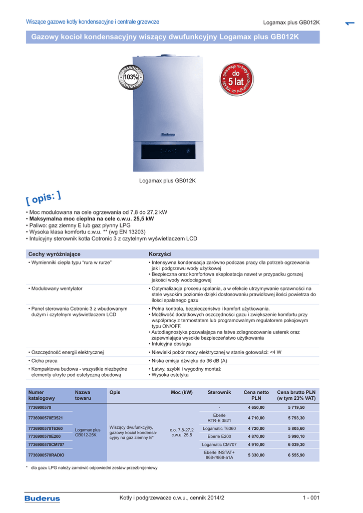 Logamax plus GB012K Gazowy kocioł kondensacyjny wiszący dwufunkcyjny Logamax plus GB012K SP ŚĆ S ŚĆ P WN RA O 103% WNO RA Logamax plus GB012K • Moc modulowana na cele ogrzewania od 7,8 do 27,2 kW • Maksymalna moc cieplna na cele c.w.u. 25,5 kW • Paliwo: gaz ziemny E lub gaz płynny LPG • Wysoka klasa komfortu c.w.u. ** (wg EN 13203) • Intuicyjny sterownik kotła Cotronic 3 z czytelnym wyświetlaczem LCD Cechy wyróżniające Korzyści • Wymienniki ciepła typu “rura w rurze” • Intensywna kondensacja zarówno podczas pracy dla potrzeb ogrzewania jak i podgrzewu wody użytkowej • Bezpieczna oraz komfortowa eksploatacja nawet w przypadku gorszej jakości wody wodociągowej • Modulowany wentylator • Optymalizacja procesu spalania, a w efekcie utrzymywanie sprawności na stele wysokim poziomie dzięki dostosowaniu prawidłowej ilości powietrza do ilości spalanego gazu • Panel sterowania Cotronic 3 z wbudowanym dużym i czytelnym wyświetlaczem LCD • Pełna kontrola, bezpieczeństwo i komfort użytkowania. • Możliwość dodatkowych oszczędności gazu i zwiększenie komfortu przy współpracy z termostatem lub programowalnym regulatorem pokojowym typu ON/OFF. • Autodiagnostyka pozwalająca na łatwe zdiagnozowanie usterek oraz zapewniająca wysokie bezpieczeństwo użytkowania • Intuicyjna obsługa • Oszczędność energii elektrycznej • Niewielki pobór mocy elektrycznej w stanie gotowości: <4 W • Cicha praca • Niska emisja dźwięku do 36 dB (A) • Kompaktowa budowa - wszystkie niezbędne elementy ukryte pod estetyczną obudową • Łatwy, szybki i wygodny montaż • Wysoka estetyka Numer katalogowy Nazwa towaru Opis Moc (kW) Sterownik Cena netto PLN Cena brutto PLN (w tym 23% VAT) - 4 650,00 5 719,50 Eberle RTR-E 3521 4 710,00 5 793,30 Logamatic T6360 4 720,00 5 805,60 Eberle E200 4 870,00 5 990,10 7736900570CM707 Logamatic CM707 4 910,00 6 039,30 7736900570RADIO Eberle INSTAT+ 868-r/868-a1A 5 330,00 6 555,90 7736900570 7736900570E3521 7736900570T6360 7736900570E200 Logamax plus GB012-25K Wiszący dwufunkcyjny, gazowy kocioł kondensacyjny na gaz ziemny E* c.o. 7,8-27,2 c.w.u. 25,5 * dla gazu LPG należy zamówić odpowiedni zestaw przezbrojeniowymax plus GB072K – dane techniczne Kotły i podgrzewacze c.w.u., cennik 2014/2 1 - 001 1 Wiszące gazowe kotły kondensacyjne i centrale grzewcze Logamax plus GB012K – dane techniczne Logamax plus GB012-25K – wymiary i minimalne odstępy min. min. 440 100 210 100 125 80 715 720 78,5 1 Wiszące gazowe kotły kondensacyjne i centrale grzewcze Logamax plus GB012K 50 65 65 65 355 65 R3/4 R1/2 R3/4 R1/2 R3/4 Model Jednostka GB012-25K Moc na cele c.o. kW Moc maksymalna c.w.u. kW 25,5 Sprawność % do 103 Wydajność c.w.u. wg EN 625 l/min do 11,8 Dopuszczalne ciśnienie gazu E na przyłączu mbar 17-25 Dopuszczalne ciśnienie gazu LPG na przyłączu mbar 37 Maksymalne ciśnienie wody c.o. bar 3 Maksymalne ciśnienie wody c.w.u. bar 10 Pojemność i ciśnienie wstępne naczynia wzbiorczego l/bar 8/0,5 Przyłącze powietrzno-spalinowe mm 80/125 Zasilanie elektryczne V/Hz AC 230/50 Masa kg 7,8-27,2 37 Zestawy przezbrojeniowe Numer katalogowy Nazwa towaru 87160138510 Zestaw przezbrojeniowy kotła GB012-25K na gaz płynny LPG Cena netto PLN Cena brutto PLN (w tym 23% VAT) 80,00 98,40 Cena netto PLN Cena brutto PLN (w tym 23% VAT) Akcesoria Numer katalogowy Nazwa towaru 87186422770 Kryza 110 mm (dla układów z zasysem powietrza z pomieszczenia B22) 75,00 92,25 7716780184 Adapter powietrzno-spalinowy z króćcami pomiarowymi AZB931 (ø80/125) 89,00 109,47 Producent zastrzega sobie możliwość zmiany cen bez wcześniejszego uprzedzenia. Warunki podane w tym cenniku nie stanowią oferty w rozumieniu Kodeksu Cywilnego. Wszelkie informacje na temat wydajności produktów mają charakter poglądowy i mogą różnić się w zależności od warunków ich instalacji. 1 - 002 Kotły i podgrzewacze c.w.u., cennik 2014/2
