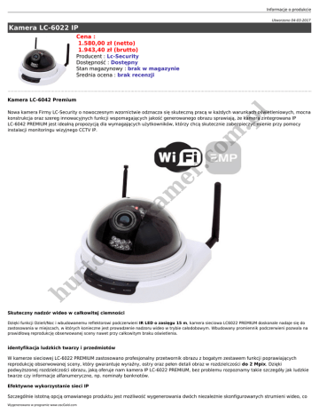 Informacje o produkcie Utworzono 04-03-2017 Kamera LC-6022 IP Cena : 1.580,00 zł (netto) 1.943,40 zł (brutto) Producent : Lc-Security Dostępność : Dostępny Stan magazynowy : brak w magazynie Średnia ocena : brak recenzji Kamera LC-6042 Premium hu rt ow ni ak am er .c om .p l Nowa kamera Firmy LC-Security o nowoczesnym wzornictwie odznacza się skuteczną pracą w każdych warunkach oświetleniowych, mocna konstrukcja oraz szereg innowacyjnych funkcji wspomagających jakość generowanego obrazu sprawiają, że kamera zintegrowana IP LC-6042 PREMIUM jest idealną propozycją dla wymagających użytkowników, którzy chcą skutecznie zabezpieczyć mienie przy pomocy instalacji monitoringu wizyjnego CCTV IP. Skuteczny nadzór wideo w całkowitej ciemności Dzięki funkcji Dzień/Noc i wbudowanemu reflektorowi podczerwieni IR LED o zasięgu 15 m, kamera sieciowa LC6022 PREMIUM doskonale nadaje się do zastosowania w miejscach, w których konieczne jest prowadzenie nadzoru wideo w trybie całodobowym. Wbudowany promiennik podczerwieni pozwala na prawidłową reprodukcję obserwowanej sceny nawet przy całkowitym braku oświetlenia. identyfikacja ludzkich twarzy i przedmiotów W kamerze sieciowej LC-6022 PREMIUM zastosowano profesjonalny przetwornik obrazu z bogatym zestawem funkcji poprawiających reprodukcję obserwowanej sceny, który gwarantuje wyraźny, ostry oraz pełen detali obraz w rozdzielczości do 2 Mpix. Dzięki podwyższonej rozdzielczości obrazu, jaką oferuje nam kamera IP LC-6022 PREMIUM, bez problemu rozpoznamy takie szczegóły jak ludzkie twarze czy informacje alfanumeryczne, np. nominały banknotów. Efektywne wykorzystanie sieci IP Szczególnie istotną opcją omawianego produktu jest możliwość wygenerowania dwóch niezależnie skonfigurowanych strumieni wideo, co Wygenerowano w programie www.oscGold.com pozwala na odpowiednie dostosowanie jakości obrazu kamery do wymagań użytkownika, założeń systemu nadzoru wideo oraz przepustowości sieci komputerowej. Użytkownik ma do wyboru kompresję wideo H.264 Main Profile (zmniejszone zapotrzebowanie na pamięć masową i przepustowość sieci) i MJPEG (najwyższa szczegółowość obrazu). Wiele opcji dodatkowych Na wyposażeniu kamery IP LC-6022 PREMIUM znajdziemy slot kart pamięci SD, który pozwala na lokalne przechowywanie materiałów wideo. Model LC-6042 PREMIUM posiada także wysokiej jakości mikrofon, który umożliwia zapis dźwięku z najbliższego jej otoczenia (zwiększona skuteczność działania instalacji CCTV IP). Główne cechy: ● ● ● ● ● ● ● ● ● ● ● ● ● Skuteczna wideoweryfikacja osób i przedmiotów – obraz w rozdzielczości do 2 Mpix Dwa osobne strumienie wideo, pozwalające na odpowiednie wykorzystanie dostępnych zasobów sieciowych Kompresja video H.264 Main Profile, MJPEG Mikrofon, Wejścia Audio: 1, Wyjścia Audio:1 Slot kart pamięci SD stosowany do rejestracji lokalnej Wbudowany reflektor podczerwieni IR LED (16 diod) o zasięgu 15 m Łączność bezprzewodowa WiFi (802.11b/g, częstotliwość 2,4GHz) - możliwość instalacji kamery nawet w trudno dostępnych miejscach Funkcja automatycznego przywracania w przypadku wykrycia błędnej pracy kamery lub braku połączenia sieciowego Łączenie z serwerem VPN 16 użytkowników jednocześnie Powiadamianie o alarmach na e-mail Sekwencyjne wykonywanie zdjęć w formacie .jpg Detekcja ruchu, maski prywatności Praca wg harmonogramu Obsługa mobilna oparta o Windows Mobile, Symbian i iPhone .p l ● er .c om ● ni ak am Specyfikacja 1/3" Color Mircon CMOS Kompresja H.264 , MJPEG Czułość [lux] 0 Obiektyw [mm] 6 Wejścia audio 1 Wyjścia audio 1 Kompresja audio G.726 Audio dwukierunkowe Wejścia alarmowe 1 Wyjścia alarmowe 1 Zasięg działania [m] 100 Detekcja ruchu tak rt Strefy prywatności ow Przetwornik tak -10 ~ 50 Pobór mocy [W] 7 Zasilanie [V] 12 DC hu Temperatura pracy [°C] Zdalne sterowanie RJ-45 Pasmo radiowe [Ghz] 2,4 Interfejs sieciowy Ethernet 10/100 Base-T RJ-45 Obsługiwane przeglądarki Internet Explorer Mikrofon tak Protokoły sieciowe RTSP , HTTP , TCP/IP , UDP , SMTP , DDNS , DHCP , FTP , UPnP Typ skanowania Progresywne Zasięg oświetlacza IR [m] 15