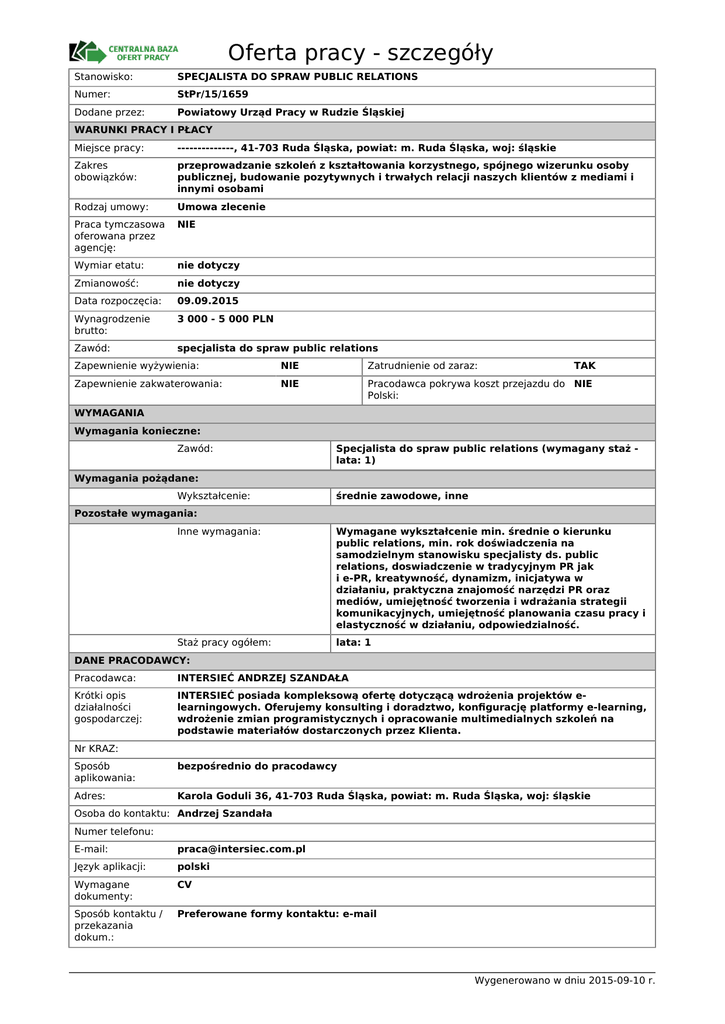 Oferta pracy - szczegóły Stanowisko: SPECJALISTA DO SPRAW PUBLIC RELATIONS Numer: StPr/15/1659 Dodane przez: Powiatowy Urząd Pracy w Rudzie Śląskiej WARUNKI PRACY I PŁACY Miejsce pracy: --------------, 41-703 Ruda Śląska, powiat: m. Ruda Śląska, woj: śląskie Zakres obowiązków: przeprowadzanie szkoleń z kształtowania korzystnego, spójnego wizerunku osoby publicznej, budowanie pozytywnych i trwałych relacji naszych klientów z mediami i innymi osobami Rodzaj umowy: Umowa zlecenie Praca tymczasowa oferowana przez agencję: NIE Wymiar etatu: nie dotyczy Zmianowość: nie dotyczy Data rozpoczęcia: 09.09.2015 Wynagrodzenie brutto: 3 000 - 5 000 PLN Zawód: specjalista do spraw public relations Zapewnienie wyżywienia: NIE Zatrudnienie od zaraz: TAK Zapewnienie zakwaterowania: NIE Pracodawca pokrywa koszt przejazdu do NIE Polski: WYMAGANIA Wymagania konieczne: Zawód: Specjalista do spraw public relations (wymagany staż lata: 1) Wymagania pożądane: Wykształcenie: średnie zawodowe, inne Pozostałe wymagania: Inne wymagania: Wymagane wykształcenie min. średnie o kierunku public relations, min. rok doświadczenia na samodzielnym stanowisku specjalisty ds. public relations, doswiadczenie w tradycyjnym PR jak i e-PR, kreatywność, dynamizm, inicjatywa w działaniu, praktyczna znajomość narzędzi PR oraz mediów, umiejętność tworzenia i wdrażania strategii komunikacyjnych, umiejętność planowania czasu pracy i elastyczność w działaniu, odpowiedzialność. Staż pracy ogółem: lata: 1 DANE PRACODAWCY: Pracodawca: INTERSIEĆ ANDRZEJ SZANDAŁA Krótki opis działalności gospodarczej: INTERSIEĆ posiada kompleksową ofertę dotyczącą wdrożenia projektów elearningowych. Oferujemy konsulting i doradztwo, konfigurację platformy e-learning, wdrożenie zmian programistycznych i opracowanie multimedialnych szkoleń na podstawie materiałów dostarczonych przez Klienta. Nr KRAZ: Sposób aplikowania: bezpośrednio do pracodawcy Adres: Karola Goduli 36, 41-703 Ruda Śląska, powiat: m. Ruda Śląska, woj: śląskie Osoba do kontaktu: Andrzej Szandała Numer telefonu: E-mail: [email protected] Język aplikacji: polski Wymagane dokumenty: CV Sposób kontaktu / przekazania dokum.: Preferowane formy kontaktu: e-mail Wygenerowano w dniu 2015-09-10 r. POZOSTAŁE DANE: Liczba miejsc pracy: 2 Przeznaczone wyłącznie dla osób zarejestrowanych w urzędzie pracy: NIE w tym dla niepełnosprawnych: 0 Przeznaczone dla osób niepełnosprawnych (finansowanie z PFRON): NIE Data dodania: 08.09.2015 Możliwe przekazanie do realizacji przez inny PUP: NIE Data aktualizacji: 08.09.2015 Data udostępnienia na portalu Europejskich Służb Zatrudnienia: 08.09.2015 Data ważności: 07.10.2015 Wygenerowano w dniu 2015-09-10 r.