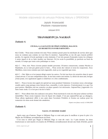Modele odpowiedzi do arkusza Próbnej Matury z OPERONEM Język francuski Poziom rozszerzony Listopad 2010 TRANSKRYPCJA NAGRAŃ Zadanie 4. CÉCILIA, LA GAGNANTE DE PÉKIN EXPRESS, BALANCE: «JE REGRETTE D’AVOIR PARTICIPÉ!» 4.1. Cécilia – Nous nous sentons très mal. Nous sommes passés pour les méchants de service alors que nous ne sommes pas comme on veut bien le montrer. Aujourd’hui, je me dis que j’aurais préféré perdre. Je regrette d’avoir participé à cette émission. C’est très pesant d’entendre toutes les critiques à notre égard et de se faire insulter sur Internet. Si j’en avais la possibilité, je partirais au bout du monde, le temps que toute cette polémique se tasse. 4.2. C. – Non, rien. Nous n’avons jamais insulté personne. D’autres concurrents, comme Nicolas et Stéphanie, ne se sont pas gênés pour le faire… Nous avons des valeurs et nous les respectons. Avec Matthieu, nous nous sommes pas mal engueulés, mais ça ne regardait que nous. 4.3. C. – Oui. Mais ce n’est jamais dirigé contre les autres. J’ai tiré ma force de caractère dans le sport à haut niveau. C’est une compétition saine. Je me bats contre moi-même. Le décès de mon ami, lorsque j’étais jeune, m’a également appris à relativiser et à être combattante. 4.4. C. – Nous n’avons rien appris de spécial sur nous pendant l’émission. L’aventure nous a davantage soudés après coup puisque nous faisons face, ensemble, à cette épreuve. Contrairement à ce que l’on peut penser, Matthieu sait me remettre en place quand c’est nécessaire. Aujourd’hui, j’apprends à le faire toute seule. Ce n’est pas à lui de le faire! 4.5. C. – Nous allons faire des cadeaux à nos potes. Nous mettrons le reste de côté pour acheter un bien immobilier. Nous avons toujours vécu de façon très simple. C’est pas aujourd’hui que ça changera. Nous allons également offrir à nos amis dans l’aventure Frédéric et Jessica un cadeau pour les remercier de nous avoir donné des amulettes. d’après www.france-soir.fr, le 30.06.2010 Zadanie 5. NAGUI, UN HOMME MARIÉ Après onze ans d’amour, Nagui et Mélanie Page se sont unis pour le meilleur et pour le pire à la Mairie du XVIIIème arrondissement de Paris. C’est sous le soleil que Nagui et Mélanie Page se sont dit «oui». Le 5 juin dernier, les deux tourtereaux se sont mariés à la mairie du XVIIIème arrondissement devant une foule d’invités, parmi www.operon.pl 1 Język francuski. Poziom rozszerzony Próbna Matura z OPERONEM i „Gazetą Wyborczą” lesquels Hélène de Fougerolles, Julien Courbet, Alain Chamfort, Bixente Lizarazu et Claire Keim ou encore Antoine Arnault. Le Maire de Paris, Bertrand Delanoë, avait également fait le déplacement place Jules Joffrin pour assister à la cérémonie, dirigée par le député-maire Daniel Vaillant. Deux enfants, un pacs et un mariage Depuis leur rencontre en 1999, l’animateur de France 2 et la jolie comédienne vivent un amour sans failles. À l’époque, après une apparition dans le film d’aventure «Jeanne d’Arc» signé Luc Besson, Mélanie Page fait ses premiers pas à la télévision dans la série «Sous le soleil». En interprétant Vanessa, étudiante en droit qui ambitionnait de devenir avocate, la jeune actrice gagne en notoriété. Nagui, qui a fondé sa société de production «Air Production», multiplie les émissions de variétés, et devient le présentateur vedette de «Taratata» sur France 2. En marge de leurs carrières respectives, l’actrice d’origine anglaise et la star du PAF poursuivent leur idylle hors cameras. En juillet 2004, Mélanie donne naissance à Roxanne, premier enfant du couple et second pour Nagui, déjà papa d’une petite Nina née de sa relation avec l’animatrice Marine Vignes. Juste avant l’arrivée de leur seconde petite fille en février 2009, Annabelle, les deux amoureux scellent leur engagement en signant un Pacs. Discret sur sa vie privée, l’animateur-présentateur de 47 ans avait pourtant confié son bonheur au magazine «Télé Star» peu après la naissance d’Annabelle. «La plus belle preuve d’amour que j’ai reçue est celle que m’a donné la femme que j’aime, Mélanie: mettre au monde nos filles Roxanne et Annabelle, avait-t-il déclaré. Il n’y a rien de plus inouï à vivre». Cette femme qui depuis est devenue son épouse. d’après www.parismatch.com, le 14.06.2010 Zadanie 6. LE PLUS JEUNE À FAIRE LE TOUR DU MONDE Nous évoquions il y a quelques jours le cas d’une Hollandaise de 13 ans qui voulait battre le record du plus jeune marin à faire le tour du monde à la voile mais qui n’a pas pu partir en raison d’une interdiction des services de protection de l’enfance. Ce record vient d’être battu par un Britannique de 17 ans. Ce jeune marin a effectué son exploit en solitaire, avec escale et assistance, en neuf mois de voyage. À 17 ans et 164 jours, le marin bat ainsi le record de jeunesse qui avait été établi par l’Américain Zac Sunderland, également âgé de 17 ans, mais deux mois plus vieux, quand il avait achevé son tour du monde le mois dernier, selon le livre Guinness des records. Mike Perham, le nouveau détenteur du record, était déjà devenu en janvier 2007 le plus jeune marin à effectuer la traversée de l’Atlantique en solitaire. Il avait alors 14 ans. L’adolescent avait fait voile le 15 novembre 2008 du port de Portsmouth, dans le sud de l’Angleterre, à l’âge de 16 ans, dans l’intention d’effectuer un tour du monde en solitaire et sans escale. Mais trois pannes l’ont contraint à faire autant d’escales, parfois prolongées. À bord de son voilier de 15 mètres, il a parcouru plus de 26 000 milles marins et passé plus de 150 jours en mer. Son périple l’a emmené au Portugal, en Afrique du Sud, en Australie et en NouvelleZélande. Il n’a cependant pas traversé le Cap Horn, au large de l’Amérique du