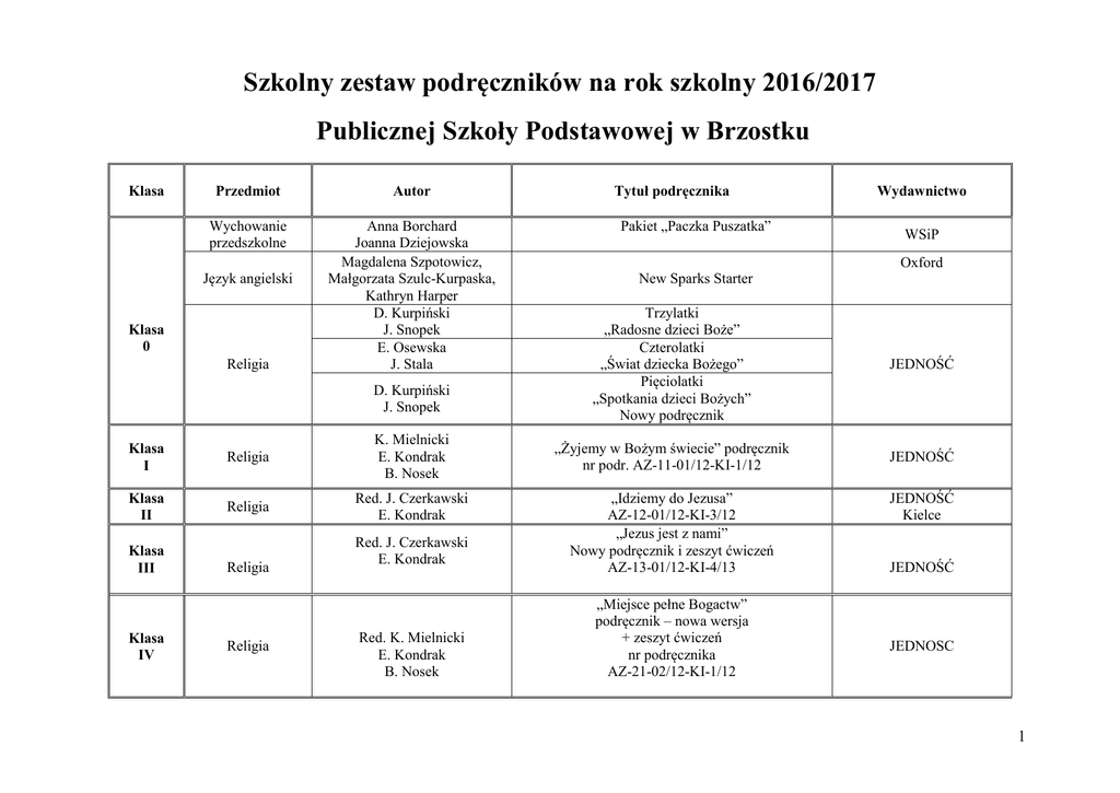 Szkolny zestaw podręczników na rok szkolny 2016/2017 Publicznej Szkoły Podstawowej w Brzostku Klasa Przedmiot Autor Wychowanie przedszkolne Anna Borchard Joanna Dziejowska Magdalena Szpotowicz, Małgorzata Szulc-Kurpaska, Kathryn Harper D. Kurpiński J. Snopek E. Osewska J. Stala Język angielski Klasa 0 Religia D. Kurpiński J. Snopek Tytuł podręcznika Pakiet „Paczka Puszatka” Oxford Trzylatki „Radosne dzieci Boże” Czterolatki „Świat dziecka Bożego” Pięciolatki „Spotkania dzieci Bożych” Nowy podręcznik JEDNOŚĆ JEDNOŚĆ Religia K. Mielnicki E. Kondrak B. Nosek „Żyjemy w Bożym świecie” podręcznik nr podr. AZ-11-01/12-KI-1/12 Klasa II Religia Red. J. Czerkawski E. Kondrak „Idziemy do Jezusa” AZ-12-01/12-KI-3/12 „Jezus jest z nami” Nowy podręcznik i zeszyt ćwiczeń AZ-13-01/12-KI-4/13 Klasa IV Religia Religia Red. J. Czerkawski E. Kondrak Red. K. Mielnicki E. Kondrak B. Nosek WSiP New Sparks Starter Klasa I Klasa III Wydawnictwo „Miejsce pełne Bogactw” podręcznik – nowa wersja + zeszyt ćwiczeń nr podręcznika AZ-21-02/12-KI-1/12 JEDNOŚĆ Kielce JEDNOŚĆ JEDNOSC 1 Klasa V Religia Język polski Język angielski Historia Matematyka Klasa VI Przyroda Ks. K. Mielnicki E. Kondrak E. Parszewska Spotkania uBOGAcające ! AZ-22-02/12-KI-1/13 Ewa Horwath Anita Żegleń Słowa z uśmiechem klasa 6 Literatura i kultura Słowa z uśmiechem klasa 6. Nauka o języku i ortografia cz. 1 i 2. S. Falla, P. Davies, S. Wheeldon, P. Shipton, E. Palczak Grzegorz Wojciechowski M. Dobrowolska P. Zarzycki M. Jucewicz M. Karpiński Andrzej Czerny Krystyna Mnich Henryk Lach Plastyka Kinga Łapot-Dzierwa, Robert Małoszowski, Maria Śmigła Zajęcia komputerowe J. Dulian Technika Jerzy Chrabąszcz Urszula Białka Muzyka Religia Małgorzata Rykowska Zbigniew Szałko Ks. K. Mielnicki. E. Kondrak E. Parszewska “Steps in English” 3 podręcznik i ćwiczenia „Wczoraj i dziś” Podręcznik do historii i społeczeństwa dla kl. 6 „Matematyka 6” podręcznik i zeszyty ćwiczeń I-III Nowa wersja Tajemnice przyrody 6. podręcznik i ćwiczenia część 1 i 2 wydanie 2014 „Na ścieżkach wyobraźni” Podręcznik do plastyki dla szkoły podstawowej, klasa 6 Wydanie 2014 „Ciekawi Świata” - zajęcia komputerowe podręcznik dla klas 4-6 Technika 4-6 - część techniczna, seria „Odkrywamy na nowo” Do nowej podstawy programowej Wydanie 2012 „Muzyka” - seria „Odkrywamy na nowo” podręcznik 4-6 + zeszyt ćwiczeń „Tajemnice BOGAtego życia” Nowy podręcznik i zeszyt ćwiczeń nr podręcznika AZ-23-02/12-KI-3/14 JEDNOŚĆ Kielce WSiP Oxford NOWA ERA GWO NOWA ERA WSiP OPERON OPERON OPERON JEDNOŚĆ 2