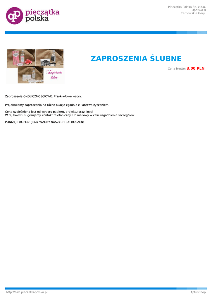 Pieczątka Polska Sp. z o.o. Opolska 8 Tarnowskie Góry ZAPROSZENIA ŚLUBNE Cena brutto: 3,00 PLN Zaproszenia OKOLICZNOŚCIOWE. Przykładowe wzory. Projektujemy zaproszenia na różne okazje zgodnie z Państwa życzeniem. Cena uzależniona jest od wyboru papieru, projektu oraz ilości. W tej kwestii sugerujemy kontakt telefoniczny lub mailowy w celu uzgodnienia szczegółów. PONIŻEJ PROPONUJEMY WZORY NASZYCH ZAPROSZEŃ: http://b2b.pieczatkapolska.pl AptusShop