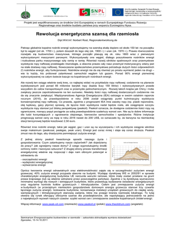 Projekt jest współfinansowany ze środków Unii Europejskiej w ramach Europejskiego Funduszu Rozwoju Regionalnego oraz środków budżetu państwa przy wsparciu Euroregionu Nysa. Rewolucja energetyczna szansą dla rzemiosła Dipl.Wirt.Inf. Norbert Rost, Regionalentwicklung.de Patrząc globalnie kopalne nośniki energii wykorzystujemy na szeroką skalę dopiero od około 150 lat: na początku był to węgiel (od ok. 1700 r.), potem doszedł do tego olej (ok. 1900 r.) i uran (ok. 1970 r.). Prawie równocześnie rozwijało się budownictwo maszynowe, którego początki plasują się ok. roku 1800 wraz z pierwszymi wykorzystanymi maszynami parowymi. Wykorzystywały one węgiel, dlatego poszukiwanie nośników energii i rozbudowa parku maszynowego szły ramię w ramię. Również rozwój silników spalinowych oraz przemysłowe wydobycie ropy naftowej przebiegało równolegle, a obecnie prawie cały nasz przemysł motoryzacyjny zdany jest na stałe dostawy ropy naftowej. Nowoczesne społeczeństwo przemysłowe potrzebuje dużych ilości odpowiednich (!) nośników energii, aby funkcjonować. Nośników energii nie da się również po prostu wymienić jeden na drugi – wie to każdy, kto próbował zatankować samochód węglem lub gazem. Ponad 90% energii pierwotnej wykorzystywanej na całym świecie bazuje na kopalnianych nośnikach energii. Ale rozwój ten osiąga właśnie swój kres, co najlepiej widać na przykładzie ropy naftowej: codziennie na planecie wydobywanych jest ponad 85 milionów baryłek ropy (każda liczy 159 litrów) i wykorzystywanych przede wszystkim do celów transportowych oraz w przemyśle petrochemicznym. Rozwój takich krajów jak Chiny i Indie zwiększy jeszcze zapotrzebowanie na ten surowiec. Niestety ilości ropy naftowej dostarczanych codziennie nie da się znacznie zwiększyć. Międzynarodowa Agencja Energetyczna (IEA) ostrzega w swoim ostatnim raporcie rocznym (2010), że prawdopodobnie w roku 2006 został osiągnięty punkt kulminacyjny wydobycia konwencjonalnej ropy naftowej. Co prawda, zgodnie z prognozami IEA inne zasoby ropy (np. piaski roponośne, olej łupkowy, gazy płynne) sprawią, że łączna ilość wydobycia nadal będzie rosła, ale osiągnięcie szczytu wydobycia ropy stanowi już bliską perspektywę (peakoil). Peakoil oznacza, że dostępne codziennie ilości ropy są ograniczone, rosnący popyt pociągnie za sobą prawdopodobnie szaleńczy wzrost cen. Nie są to dobre informacje dla ludzi korzystających z ogrzewania olejowego, kierowców samochodów i spedytorów. Różne instytucje prognozują wzrost ceny za ropę w roku 2016 nawet do 200 US$, co oznaczało by, że benzyna na niemieckiej stacji benzynowej będzie kosztować 2,50 euro. Również inne nośniki energii, takie jak węgiel, gaz i uran są na wyczerpaniu i ich wydobycie osiągnie wkrótce swoje maksimum (peakcoal, peakgas, peak uran). Energii jest coraz mniej i staje się coraz droższa. Peakoil zmusi nas do tego, aby drastycznie pomniejszyć zużycie energii. Z jednej strony peakoil kwestionuje sposób naszego życia i gospodarowania: Czym zatankujemy nasze ciężarówki? Jak dojedziemy do pracy? Jak ogrzejemy nasze domy? Z czego wyprodukujemy środki ochrony roślin i tworzywo sztuczne? Z drugiej strony proces transformacji energetycznej właśnie się rozpoczął i daje nam olbrzymi potencjał w odniesieniu do - oszczędności energii - wydajności energetycznej - wytwarzania energii Oprócz tworzenia energii odnawialnych oraz elektromobilności zajęto się w szczególności zużyciem energii grzewczej. 40% zużycia energii przypada obecnie na budynki. Wydając dyrektywę WE nr 2002/91 w sprawie charakterystyki energetycznej budynków UE narzuciła warunki ramowe, które miały zostać przelane na grunt prawa krajowego (lub są właśnie wdrażane przez poszczególne państwa). Zgodnie z tą dyrektywą wyznaczono minimalne wymogi dla nowych i istniejących budynków, które przewidują wydawanie świadectw energetycznych oraz regularne kontrole kotłów grzewczych i klimatyzatorów. Celem jest zmniejszenie zużycia energii w budynkach (w przeciętnym niemieckim gospodarstwie domowym energia grzewcza stanowi trzy czwarte łącznego zużycia energii). Izolowanie budynków, konserwacja instalacji urządzeń grzewczych do ciepłej wody, wentylacyjnych i klimatyzacyjnych stanowią zadania, które ma przejąć branża rzemiosła lokalnego. To tutaj otwiera się rynek oferujący olbrzymie szanse dla przedsiębiorców, ale napotykający jednocześnie na jedno z największych wyzwań naszych czasów: szybki wzrost cen i zmniejszenie zasobów kopalnianych źródeł energii. Więcej informacji: www.peak-oil.com (niemiecki) www.peakoil.pl (polski) www.theoildrum.com (angielski) Seminarium Energooszczędne budownictwo w rzemiośle – saksońsko-dolnośląska wymiana doświadczeń Zgorzelec, 13-14.10.2011