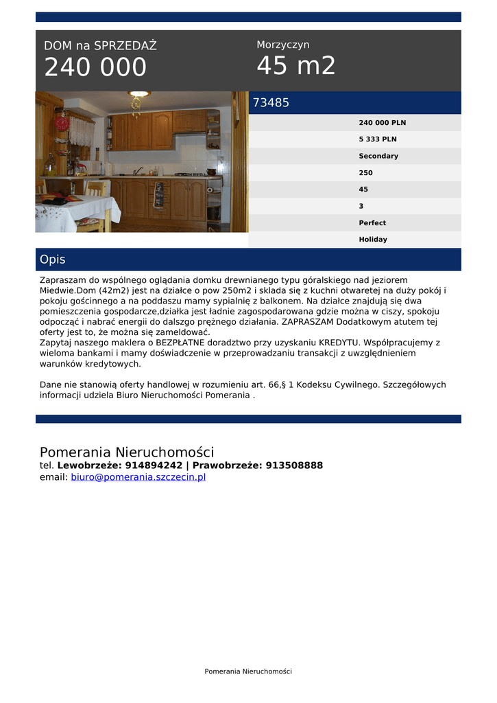 Morzyczyn DOM na SPRZEDAŻ 45 m2 240 000 73485 240 000 PLN 5 333 PLN Secondary 250 45 3 Perfect Holiday Opis Zapraszam do wspólnego oglądania domku drewnianego typu góralskiego nad jeziorem Miedwie.Dom (42m2) jest na działce o pow 250m2 i sklada się z kuchni otwaretej na duży pokój i pokoju gościnnego a na poddaszu mamy sypialnię z balkonem. Na działce znajdują się dwa pomieszczenia gospodarcze,działka jest ładnie zagospodarowana gdzie można w ciszy, spokoju odpocząć i nabrać energii do dalszgo prężnego działania. ZAPRASZAM Dodatkowym atutem tej oferty jest to, że można się zameldować. Zapytaj naszego maklera o BEZPŁATNE doradztwo przy uzyskaniu KREDYTU. Współpracujemy z wieloma bankami i mamy doświadczenie w przeprowadzaniu transakcji z uwzględnieniem warunków kredytowych. Dane nie stanowią oferty handlowej w rozumieniu art. 66,§ 1 Kodeksu Cywilnego. Szczegółowych informacji udziela Biuro Nieruchomości Pomerania . Pomerania Nieruchomości tel. Lewobrzeże: 914894242 | Prawobrzeże: 913508888 email: [email protected] Pomerania Nieruchomości Powered by TCPDF (www.tcpdf.org)