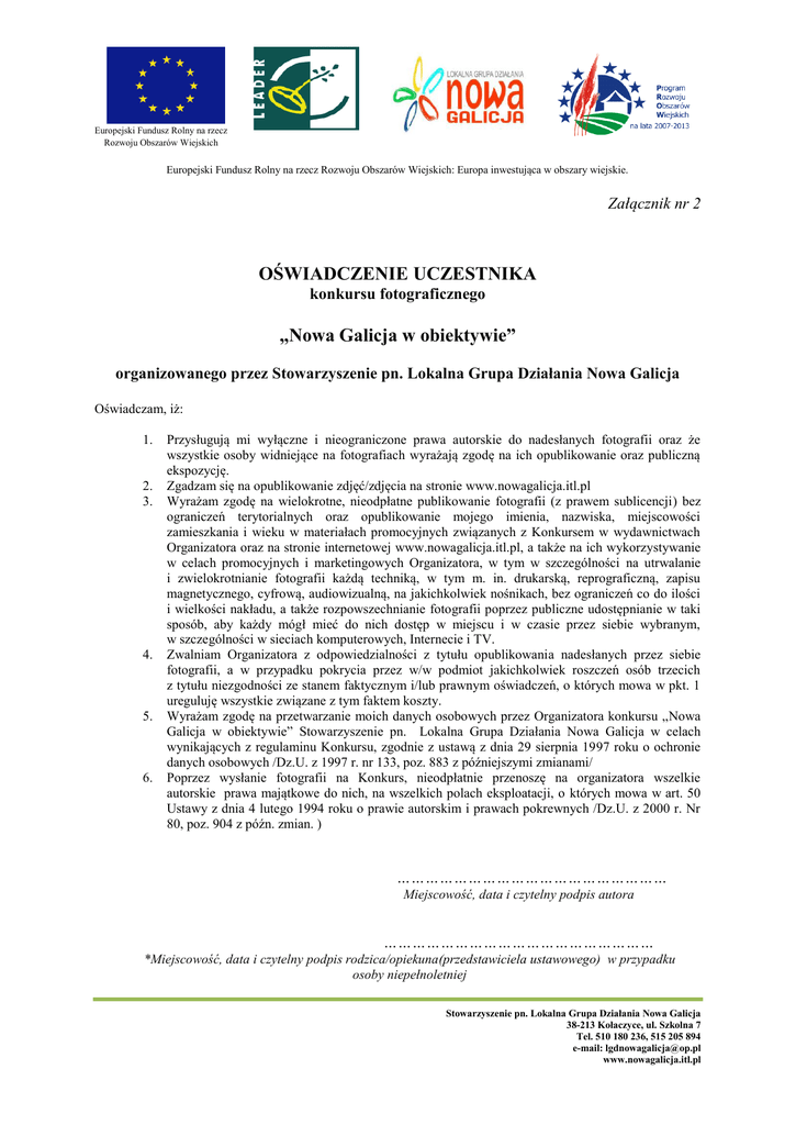 Europejski Fundusz Rolny na rzecz Rozwoju Obszarów Wiejskich Europejski Fundusz Rolny na rzecz Rozwoju Obszarów Wiejskich: Europa inwestująca w obszary wiejskie. Załącznik nr 2 OŚWIADCZENIE UCZESTNIKA konkursu fotograficznego „Nowa Galicja w obiektywie” organizowanego przez Stowarzyszenie pn. Lokalna Grupa Działania Nowa Galicja Oświadczam, iż: 1. 2. 3. 4. 5. 6. Przysługują mi wyłączne i nieograniczone prawa autorskie do nadesłanych fotografii oraz że wszystkie osoby widniejące na fotografiach wyrażają zgodę na ich opublikowanie oraz publiczną ekspozycję. Zgadzam się na opublikowanie zdjęć/zdjęcia na stronie www.nowagalicja.itl.pl Wyrażam zgodę na wielokrotne, nieodpłatne publikowanie fotografii (z prawem sublicencji) bez ograniczeń terytorialnych oraz opublikowanie mojego imienia, nazwiska, miejscowości zamieszkania i wieku w materiałach promocyjnych związanych z Konkursem w wydawnictwach Organizatora oraz na stronie internetowej www.nowagalicja.itl.pl, a także na ich wykorzystywanie w celach promocyjnych i marketingowych Organizatora, w tym w szczególności na utrwalanie i zwielokrotnianie fotografii każdą techniką, w tym m. in. drukarską, reprograficzną, zapisu magnetycznego, cyfrową, audiowizualną, na jakichkolwiek nośnikach, bez ograniczeń co do ilości i wielkości nakładu, a także rozpowszechnianie fotografii poprzez publiczne udostępnianie w taki sposób, aby każdy mógł mieć do nich dostęp w miejscu i w czasie przez siebie wybranym, w szczególności w sieciach komputerowych, Internecie i TV. Zwalniam Organizatora z odpowiedzialności z tytułu opublikowania nadesłanych przez siebie fotografii, a w przypadku pokrycia przez w/w podmiot jakichkolwiek roszczeń osób trzecich z tytułu niezgodności ze stanem faktycznym i/lub prawnym oświadczeń, o których mowa w pkt. 1 ureguluję wszystkie związane z tym faktem koszty. Wyrażam zgodę na przetwarzanie moich danych osobowych przez Organizatora konkursu „Nowa Galicja w obiektywie” Stowarzyszenie pn. Lokalna Grupa Działania Nowa Galicja w celach wynikających z regulaminu Konkursu, zgodnie z ustawą z dnia 29 sierpnia 1997 roku o ochronie danych osobowych /Dz.U. z 1997 r. nr 133, poz. 883 z późniejszymi zmianami/ Poprzez wysłanie fotografii na Konkurs, nieodpłatnie przenoszę na organizatora wszelkie autorskie prawa majątkowe do nich, na wszelkich polach eksploatacji, o których mowa w art. 50 Ustawy z dnia 4 lutego 1994 roku o prawie autorskim i prawach pokrewnych /Dz.U. z 2000 r. Nr 80, poz. 904 z późn. zmian. ) ………………………………………………… Miejscowość, data i czytelny podpis autora ………………………………………………… *Miejscowość, data i czytelny podpis rodzica/opiekuna(przedstawiciela ustawowego) w przypadku osoby niepełnoletniej Stowarzyszenie pn. Lokalna Grupa Działania Nowa Galicja 38-213 Kołaczyce, ul. Szkolna 7 Tel. 510 180 236, 515 205 894 e-mail: [email protected] www.nowagalicja.itl.pl