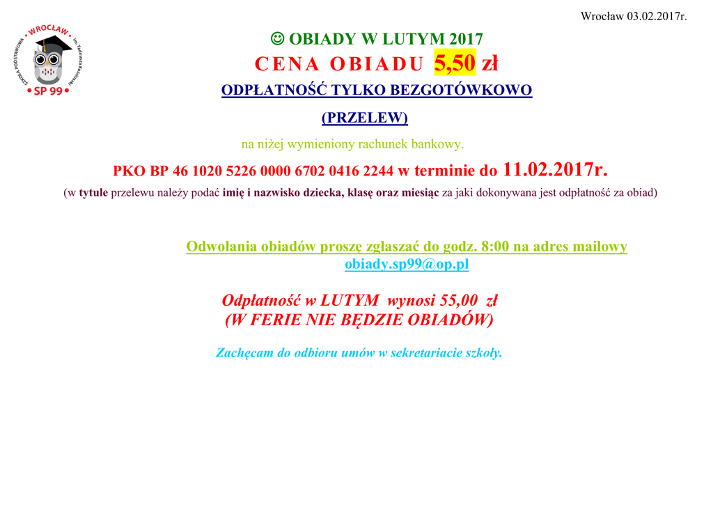 Wrocław 03.02.2017r. OBIADY W LUTYM 2017 C E N A O B I A D U 5,50 zł ODPŁATNOŚĆ TYLKO BEZGOTÓWKOWO (PRZELEW) na niżej wymieniony rachunek bankowy. PKO BP 46 1020 5226 0000 6702 0416 2244 w terminie do 11.02.2017r. (w tytule przelewu należy podać imię i nazwisko dziecka, klasę oraz miesiąc za jaki dokonywana jest odpłatność za obiad) Odwołania obiadów proszę zgłaszać do godz. 8:00 na adres mailowy [email protected] Odpłatność w LUTYM wynosi 55,00 zł (W FERIE NIE BĘDZIE OBIADÓW) Zachęcam do odbioru umów w sekretariacie szkoły.